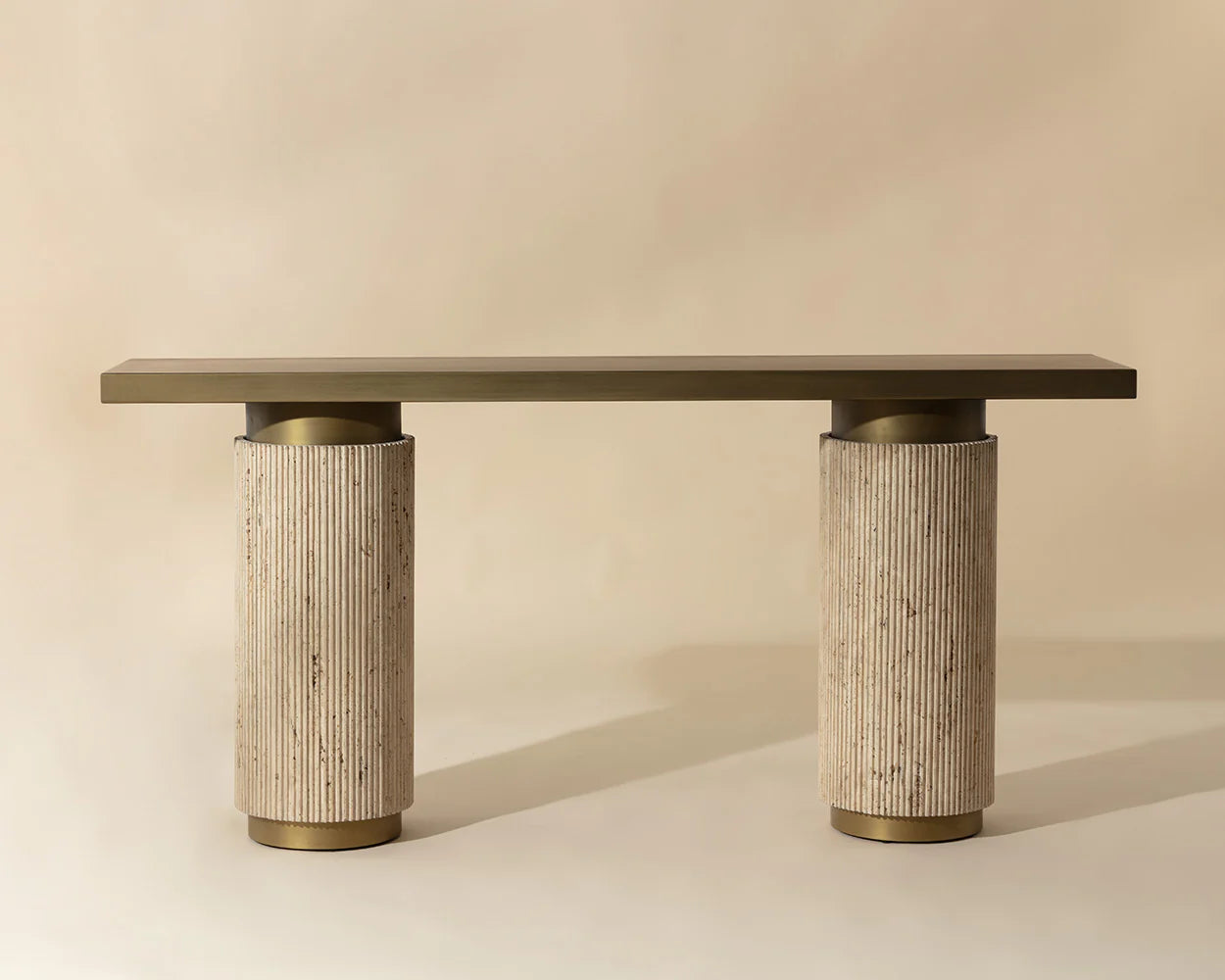 The Ashva Console Table evokes the classic beauty of Greek columns with elegantly reeded travertine wrapped around the legs. Crafted with an antique brass iron table top and base, this console table brings a refined rustic air to any interior space.