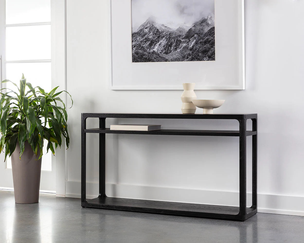 With a clean and modern composition, the Doncaster Console Table will add minimalist style into any space. Crafted from a black solid oak wood frame with a black oak veneer. As wood is an organic, porous material, these pieces will contain natural variation of texture and may also exhibit fine indentations and cracks. Wood pieces will also display a disparity of colour and grain, and visible knots and burls that add to the character of each piece.