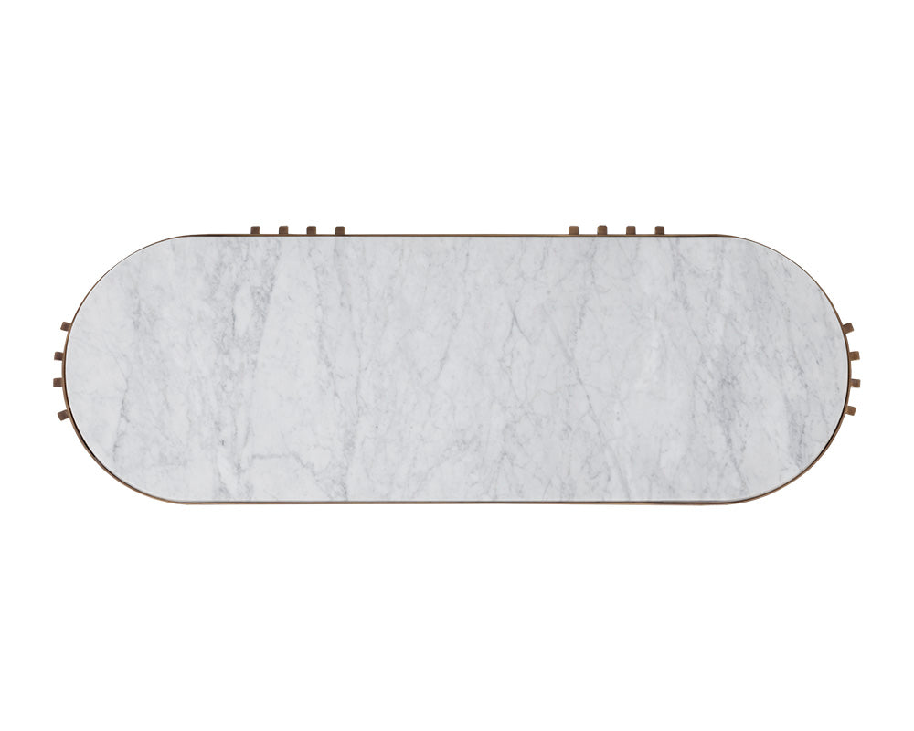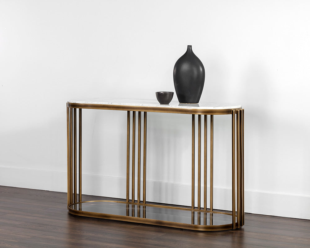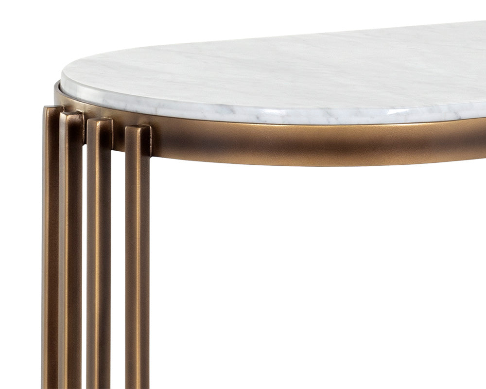 Introduce an element of grandeur to any space with this marvelous console table. Features a 21mm solid Carrara white marble top with a 6mm smoked tempered glass bottom. Completed with a stylish metal frame in a rustic bronze finish. Coordinating coffee and end tables also available. As marble is a natural material, unique veining, pitting, fissures, micro-cracks and colour variations are all characteristics that add to the uniqueness and beauty of each piece.