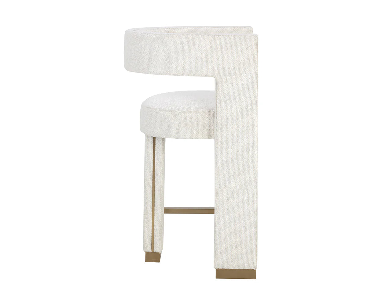 Perfectly poised with a distinct three-legged design, the Adamina Counter Stool will leave a lasting impression. Powder-coated gold metal detailing enhances the plush texture of our rhea light barley performance fabric for a stylish seating solution. Performance fabric is moisture repellent, durable and easy to clean.