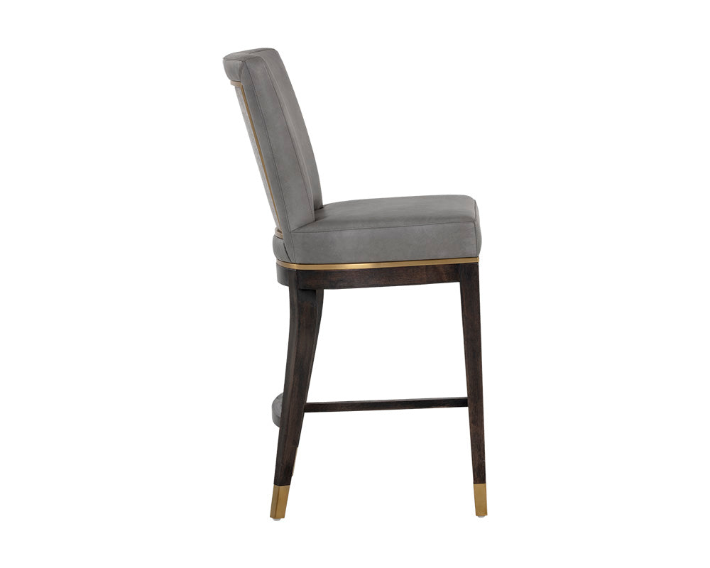 A classically designed counter stool with a beautiful antique brass metal inlay for added style. Stocked in bravo black faux leather with a contrasting abbington black fabric exterior and in bravo metal faux leather with a contrasting polo club stone fabric exterior. Finished with an espresso wood frame with a black metal plate on the footrest to protect from wear and tear. Handle With Care: This design has been crafted with faux leather. Faux leather is manufactured to reflect the natural characteristics of leather; as such, colour variations, markings, wrinkles, grooves, and light scratches are appreciated characteristics. No two pieces will be alike. Visit our Product Care page for more information on how to ensure the lasting beauty of this piece.