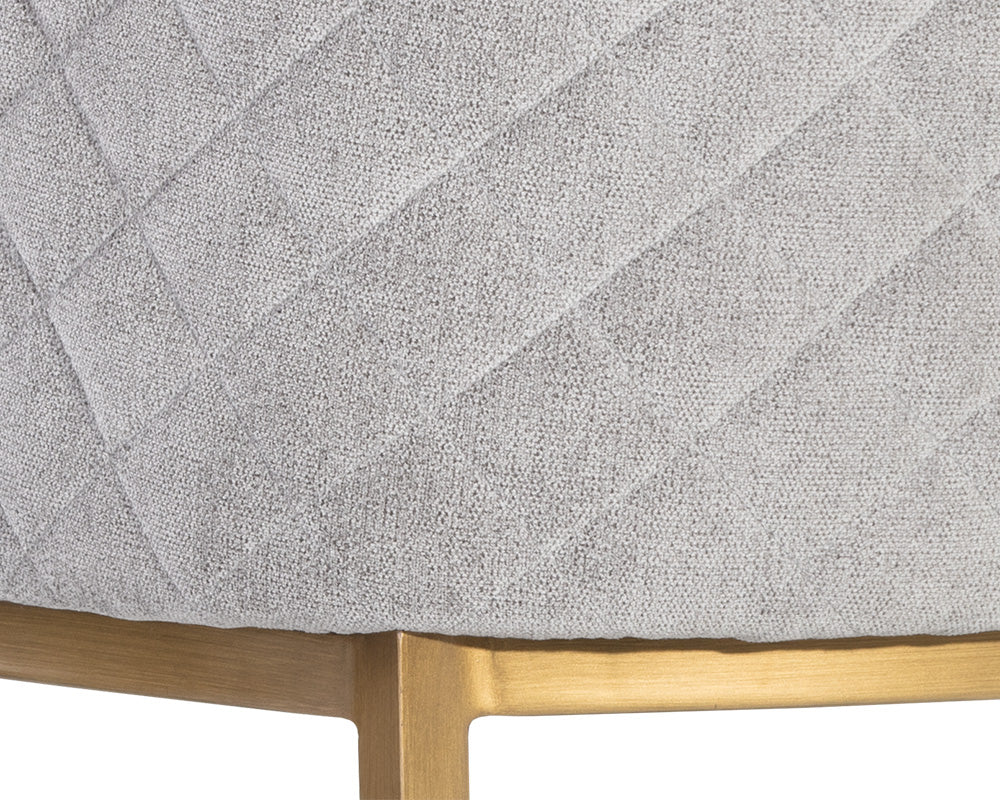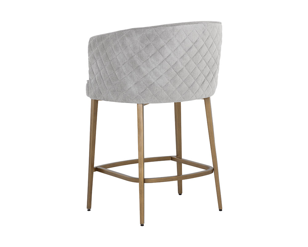 Feminine flair comes to life in this modern counter stool. Stocked in danny iceberg fabric with elegant diamond stitching on the exterior seatback. An antique brass steel frame completes the look. Also available in meg olive and polo club stone performance fabrics.