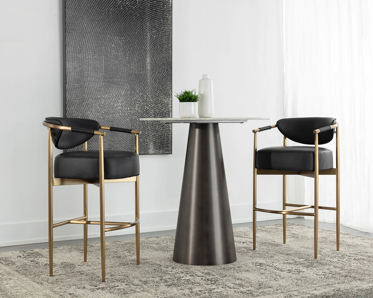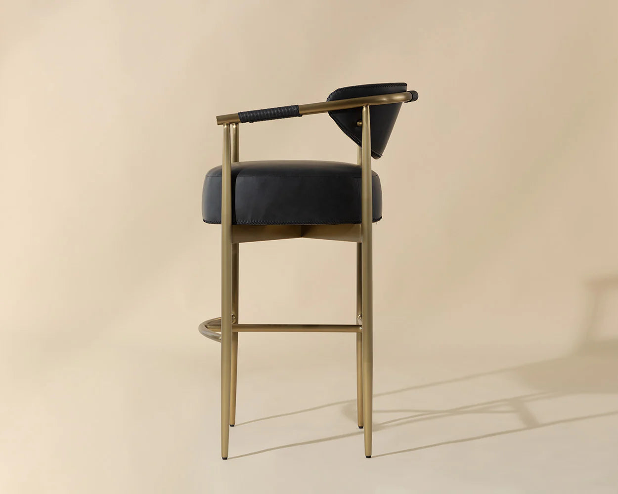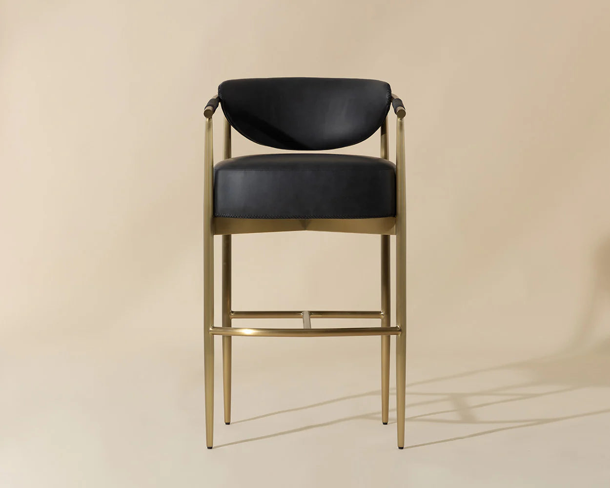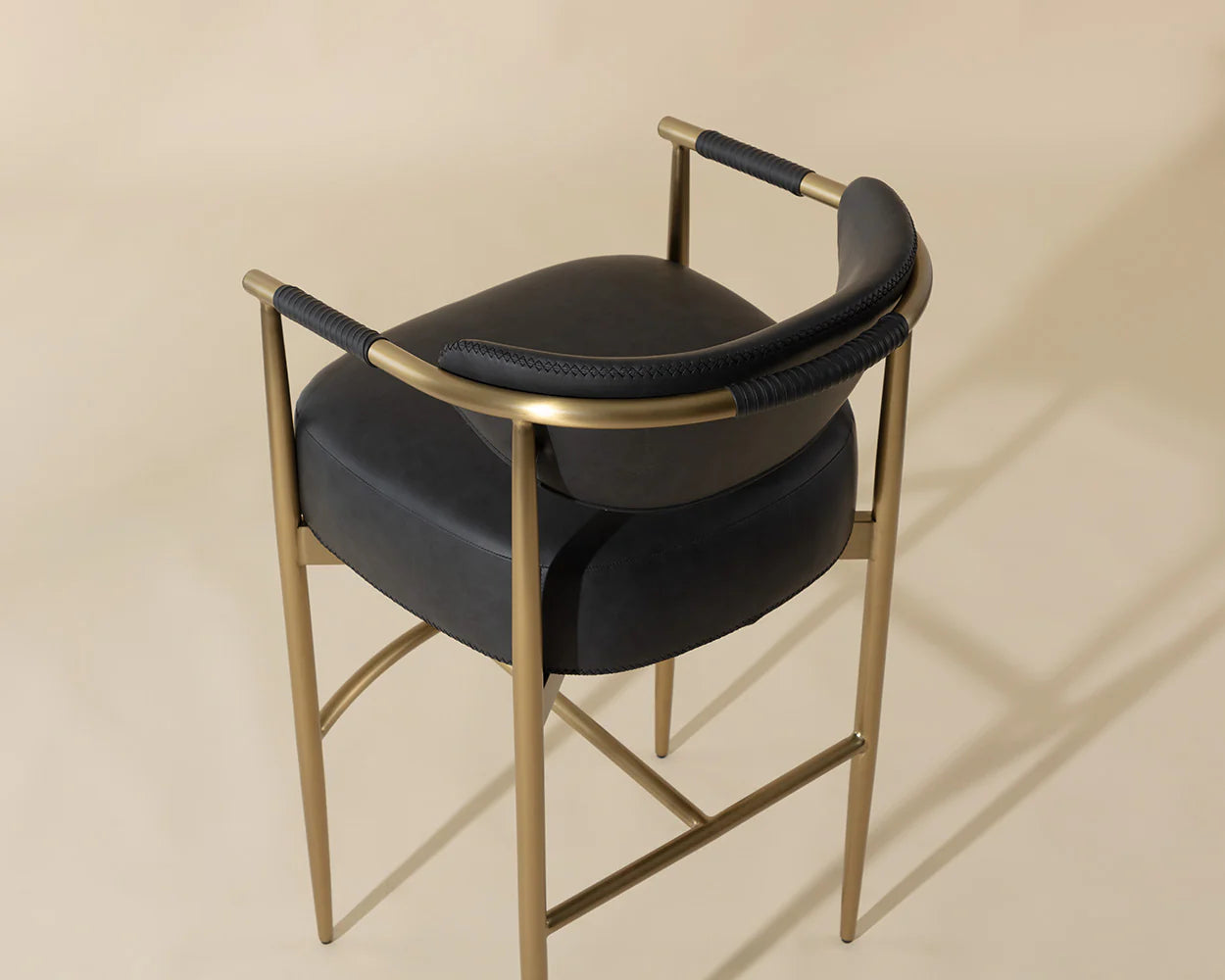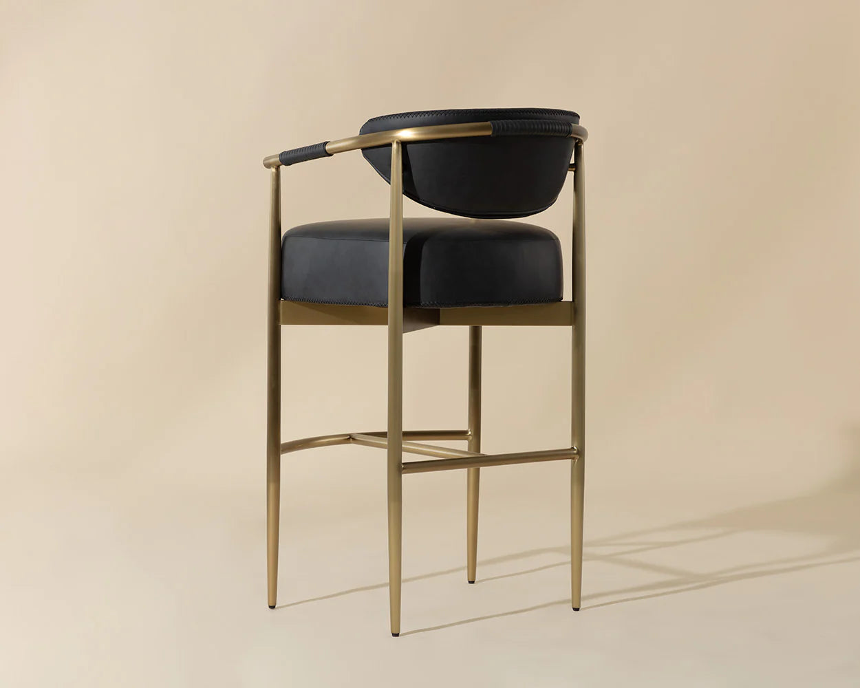 Every detail that makes up the handsome Heloise Barstool is designed with purpose. Bravo black or Milliken Cognac faux leather upholstery and rope detailing is paired with powder-coated gold stainless steel for optimal style and comfort. Visible stitching on the seat and backrest accentuates the chair's smooth contours. This elegant barstool will perfectly complement any dining space. Handle With Care: This design has been crafted with faux leather. Faux leather is manufactured to reflect the natural characteristics of leather; as such, colour variations, markings, wrinkles, grooves, and light scratches are appreciated characteristics. No two pieces will be alike. Visit our Product Care page for more information on how to ensure the lasting beauty of this piece.