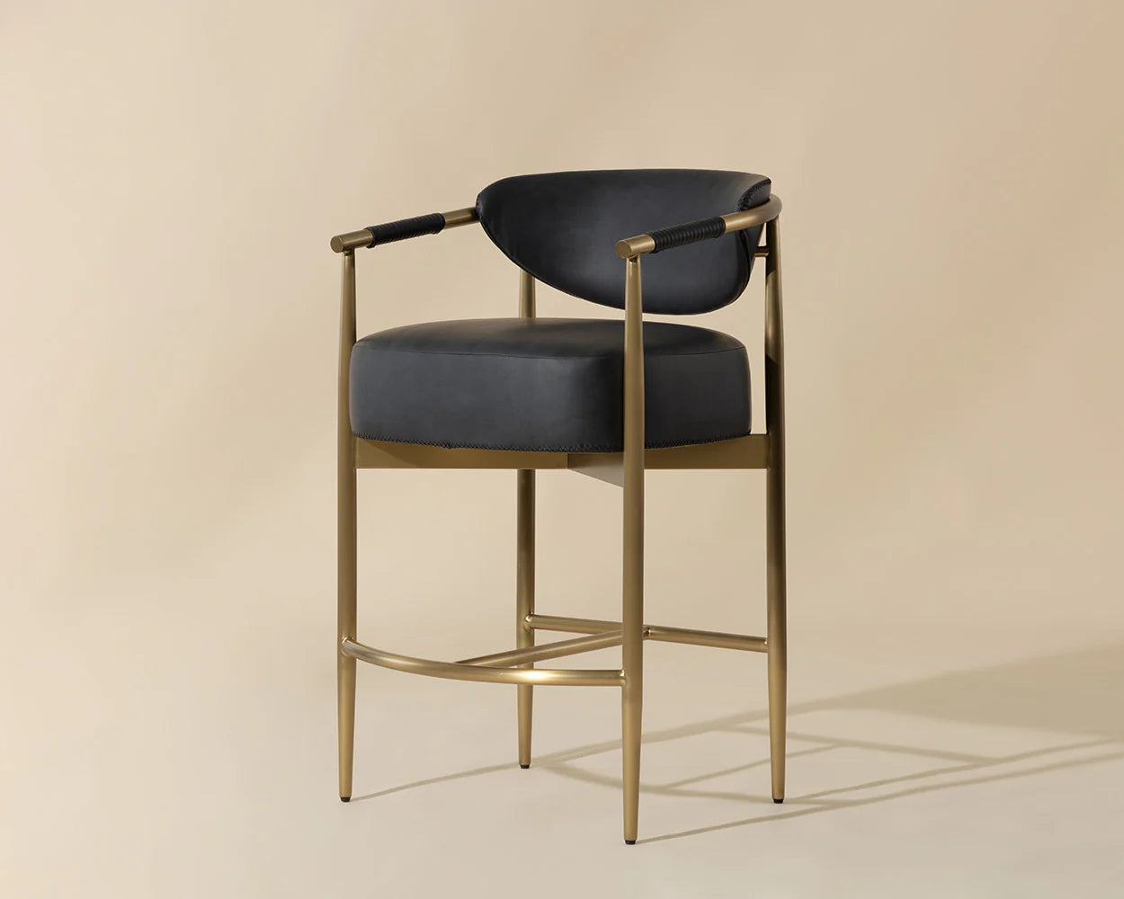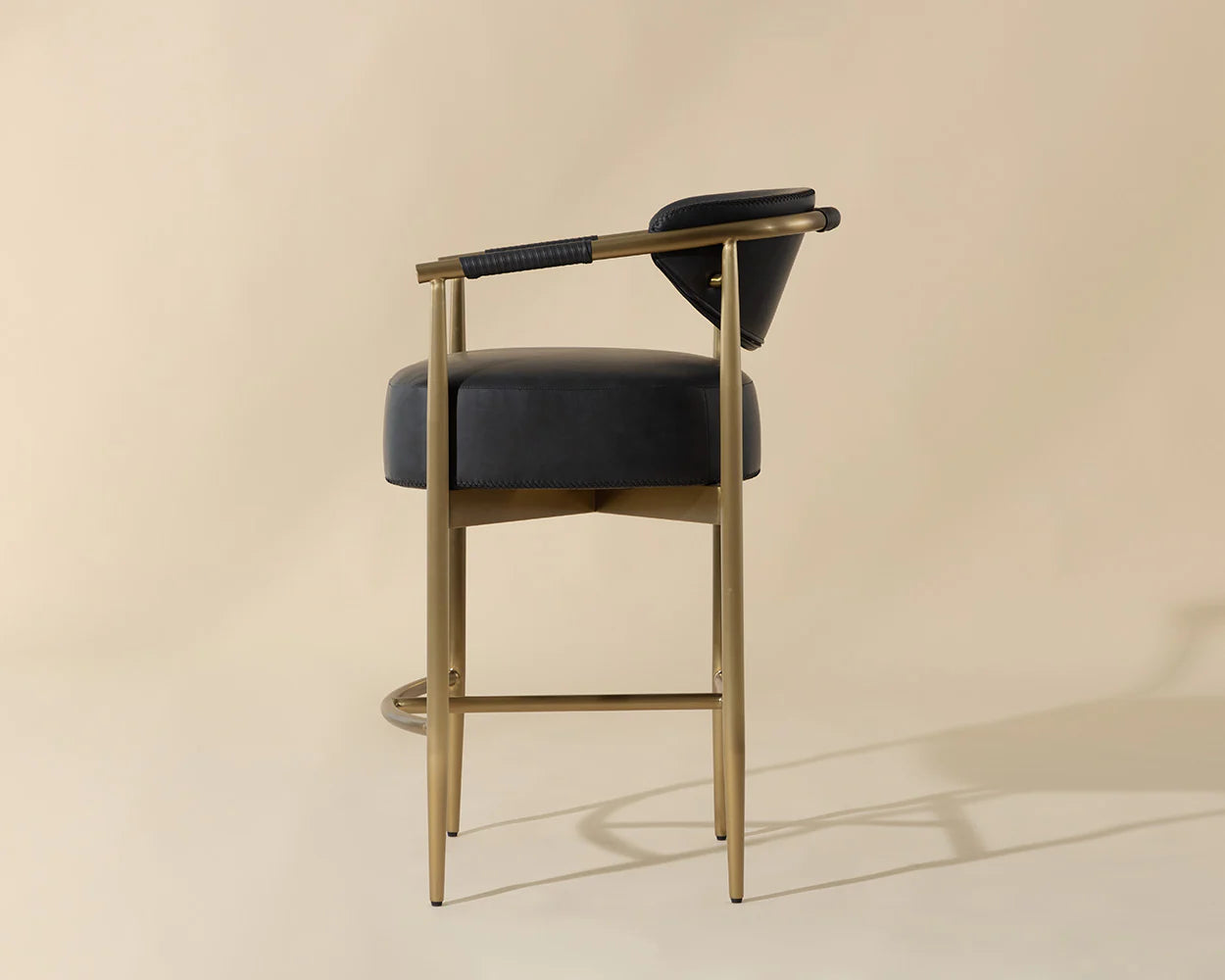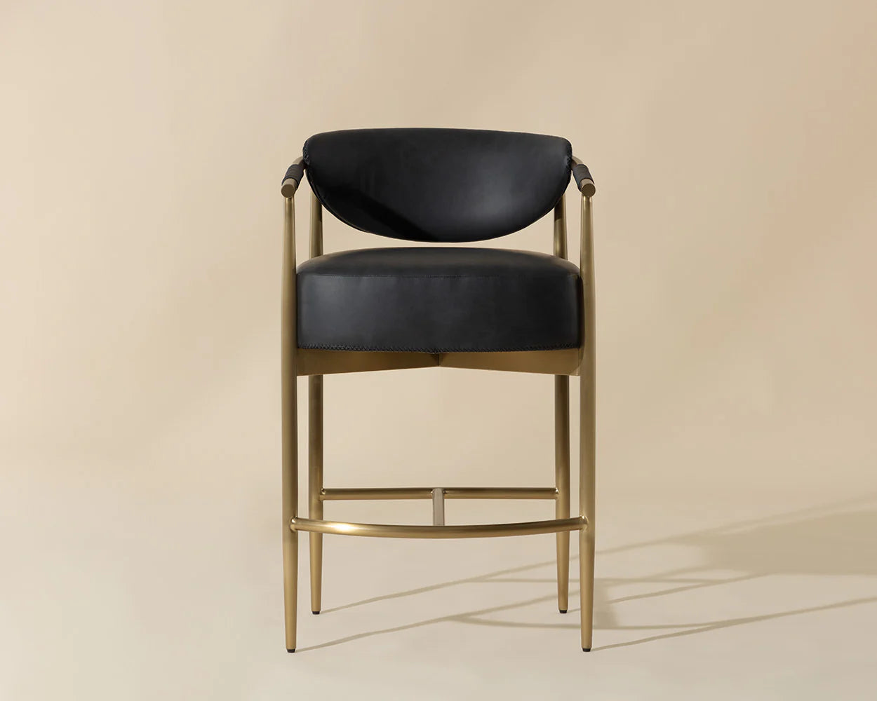 Every detail that makes up the handsome Heloise Counter Stool is designed with purpose. Bravo black faux leather upholstery and rope detailing is paired with powder-coated gold stainless steel for optimal style and comfort. Visible stitching on the seat and backrest accentuates the chair's smooth contours. This elegant counter stool will perfectly complement any dining space. Handle With Care: This design has been crafted with faux leather. Faux leather is manufactured to reflect the natural characteristics of leather; as such, colour variations, markings, wrinkles, grooves, and light scratches are appreciated characteristics. No two pieces will be alike. Visit our Product Care page for more information on how to ensure the lasting beauty of this piece. Also available in Milliken cognac faux leather upholstery