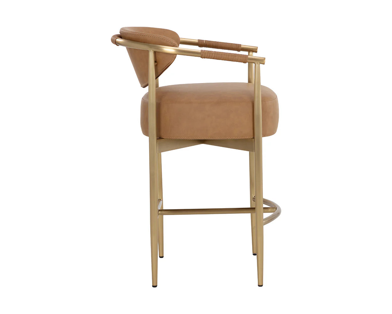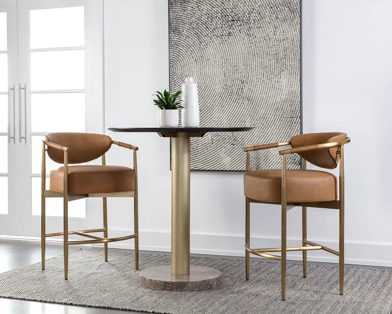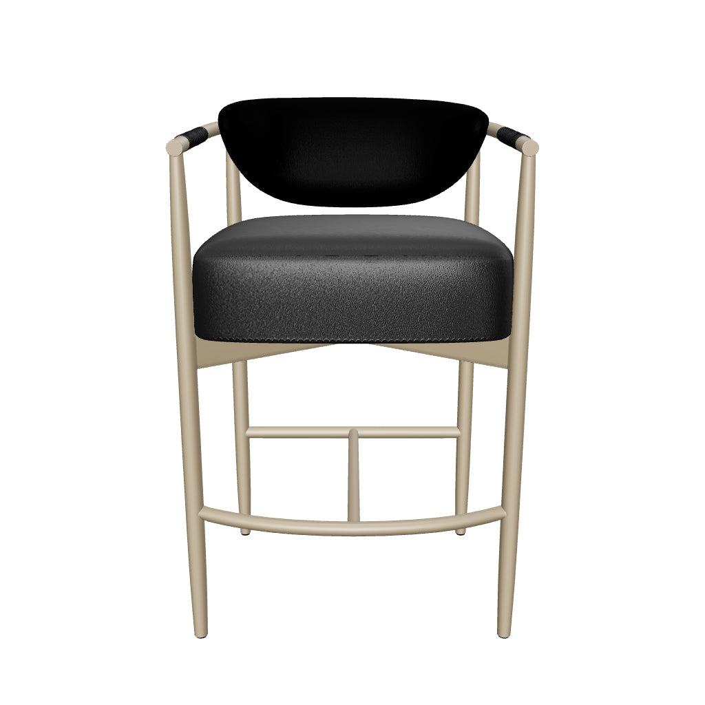 Every detail that makes up the handsome Heloise Counter Stool is designed with purpose. Bravo black faux leather upholstery and rope detailing is paired with powder-coated gold stainless steel for optimal style and comfort. Visible stitching on the seat and backrest accentuates the chair's smooth contours. This elegant counter stool will perfectly complement any dining space. Handle With Care: This design has been crafted with faux leather. Faux leather is manufactured to reflect the natural characteristics of leather; as such, colour variations, markings, wrinkles, grooves, and light scratches are appreciated characteristics. No two pieces will be alike. Visit our Product Care page for more information on how to ensure the lasting beauty of this piece. Also available in Milliken cognac faux leather upholstery