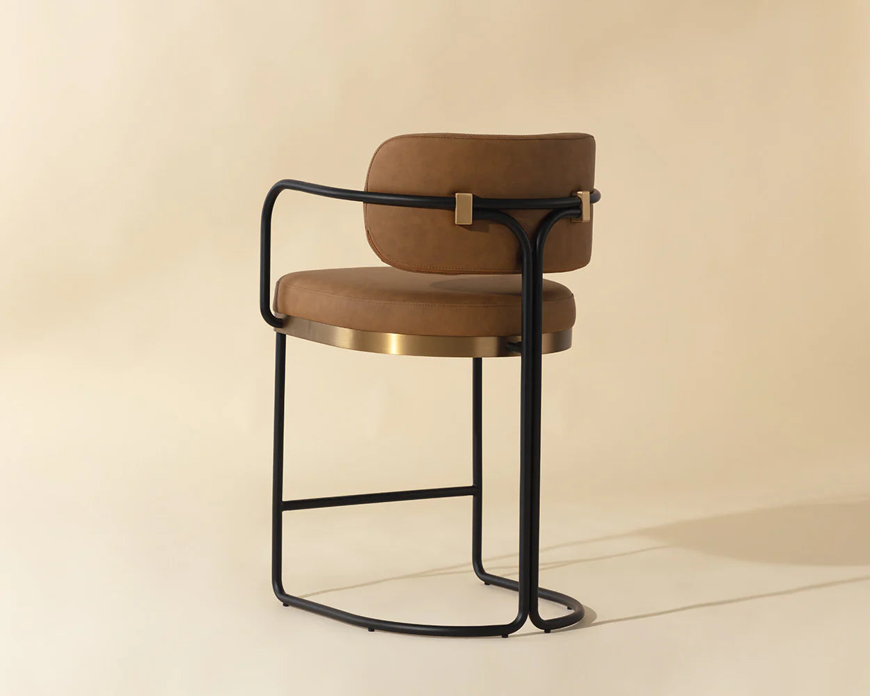The Jalen Counter Stool is poised to be a guest favourite thanks to its free flowing curves and gold stainless steel accents. Made from powder-coated iron with a supportive seat and back upholstered in high performance faux leather, this armchair will fit into any residential or commercial setting.