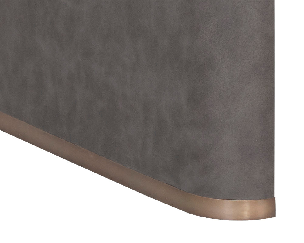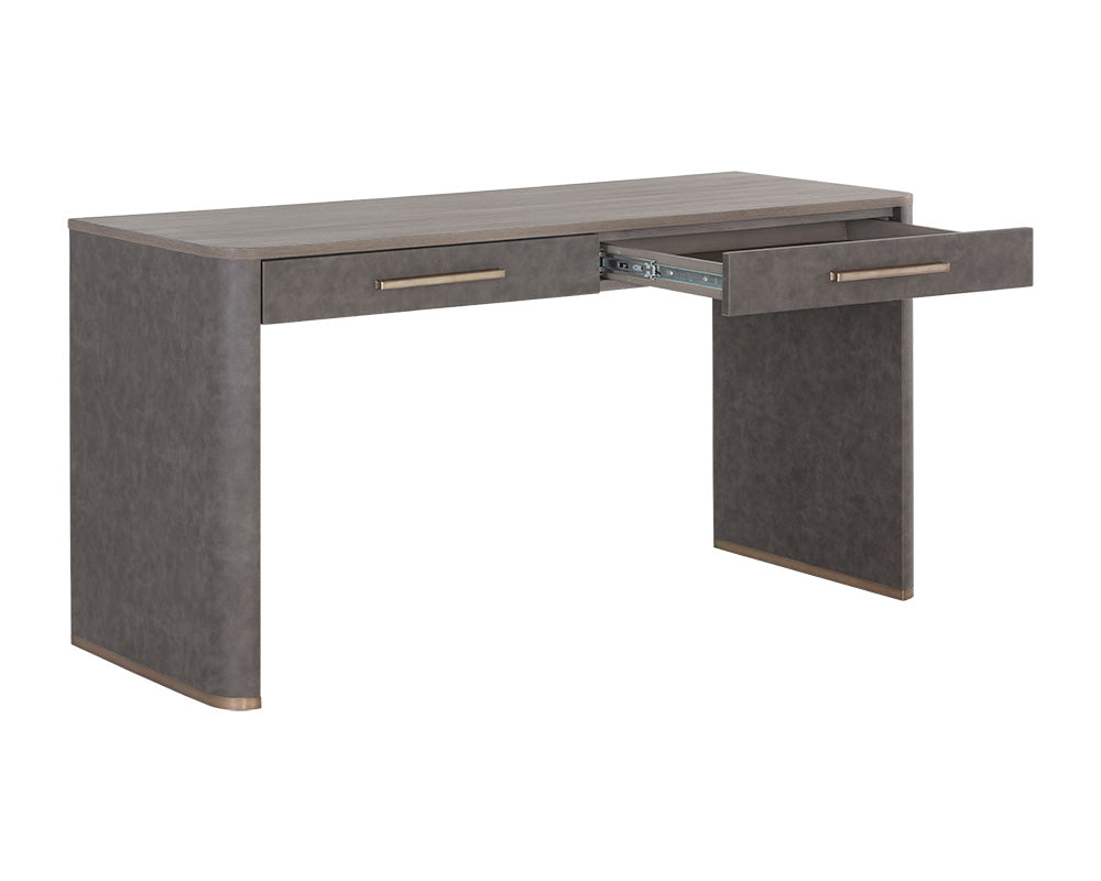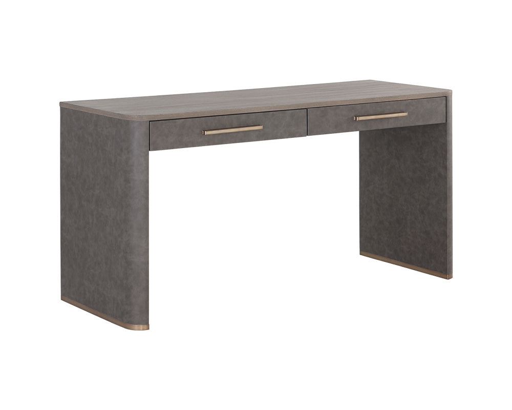 Add character to office spaces with this retro inspired desk crafted in Vietnam. Designed with a faux leather wrapped frame and two soft closing drawers. A dark grey oak veneer wood top and brass stainless steel hardware complete the look. Can be paired with coordinating bed, nightstand and dress.