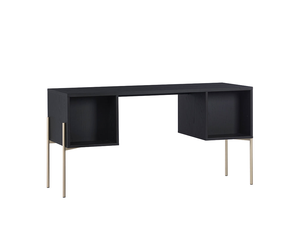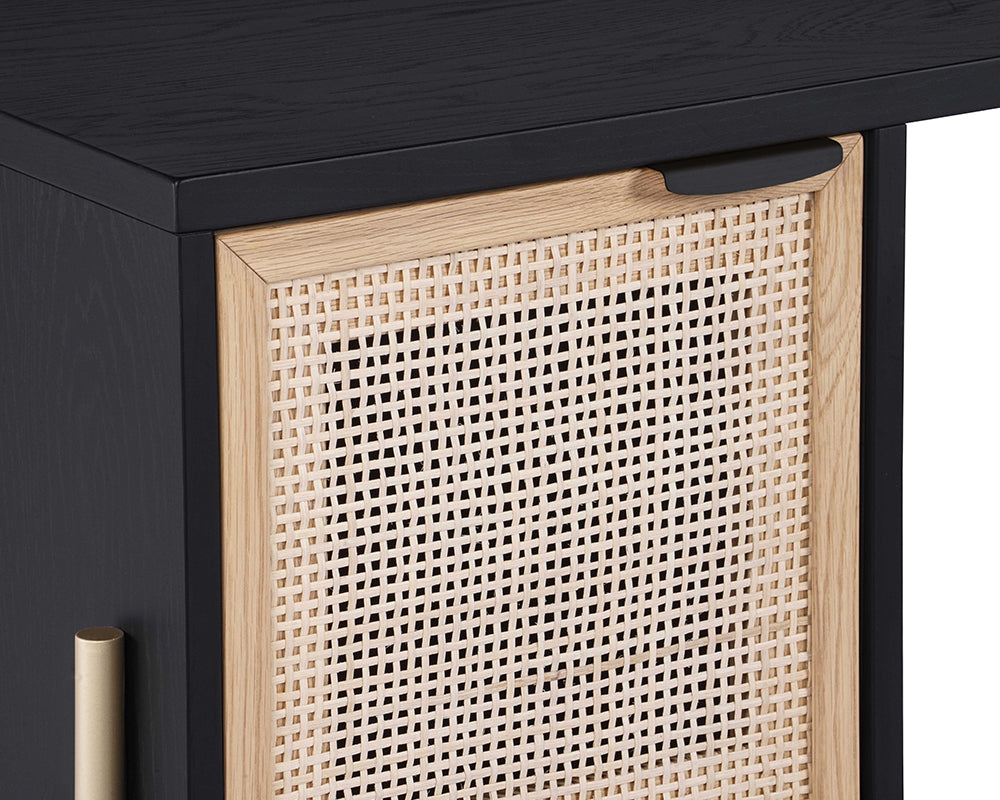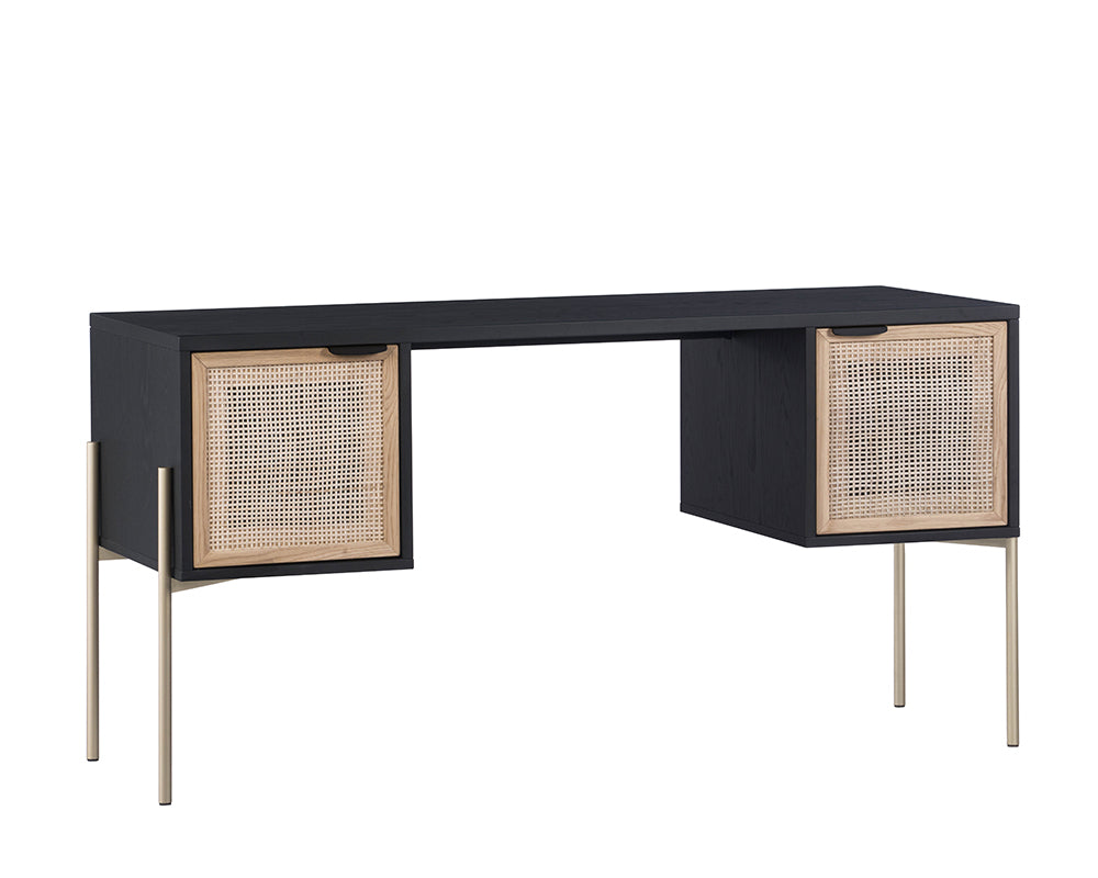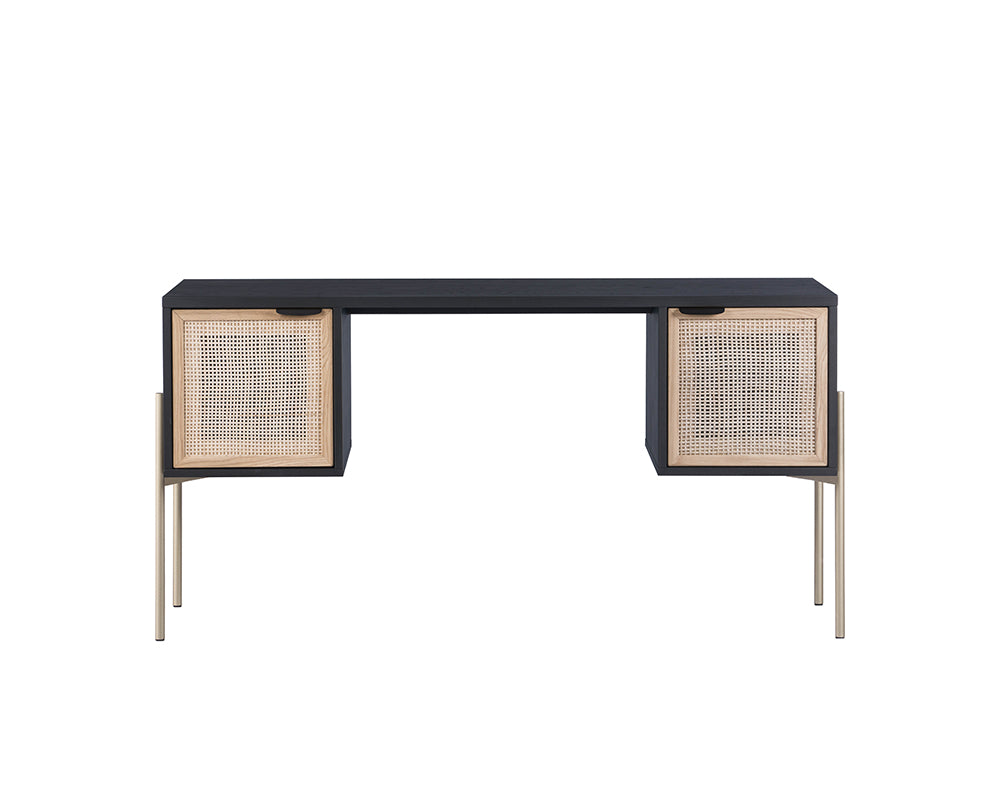 Inspired by global travels, this desk will help encourage your workflow. Features a black oak wood frame, natural rattan cabinets and gold iron legs for a unique home office. Handle With Care: This design has been crafted with natural rattan. Handle With Care: This design has been crafted with rattan. This artisan-crafted material features intricate weaving that results in natural variations where no two pieces are alike. Colour and texture differences are to be expected and embraced with this natural material. Due to the weaving process used, the fibres in this material may display shorter or longer lengths where the weaving ends. Visit our Product Care page for more information on how to ensure the lasting beauty of this piece.