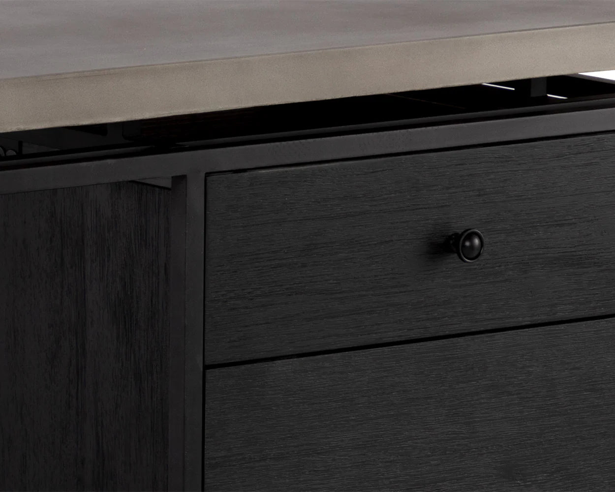 Mixed materials come together to construct a fascinating desk. Featuring a thick grey concrete top, a black metal frame and pine wood drawers in a coffee bean finish. As wood is an organic, porous material, these pieces will contain natural variation of texture and may also exhibit fine indentations and cracks. Wood pieces will also display a disparity of colour and grain, and visible knots and burls that add to the character of each piece. Crafted from a natural concrete mix, each piece will look different. Variations in colour, texture, imperfections, surface scratches and non-structural hairline cracks are considered inherent and valued qualities of the material.