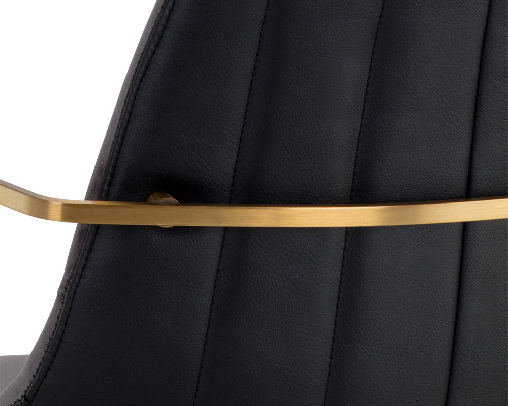 This swivel dining chair from is where urban cool meets contemporary elegance. Designed with an abbington black fabric seat and a channel tufted exterior in bravo black faux leather. Brushed gold finished arms and black iron legs complete this look. Also available in dillon cream faux leather and slate tint fabric with contrasting nightfall black faux leather.