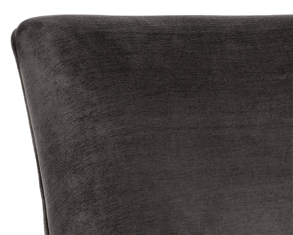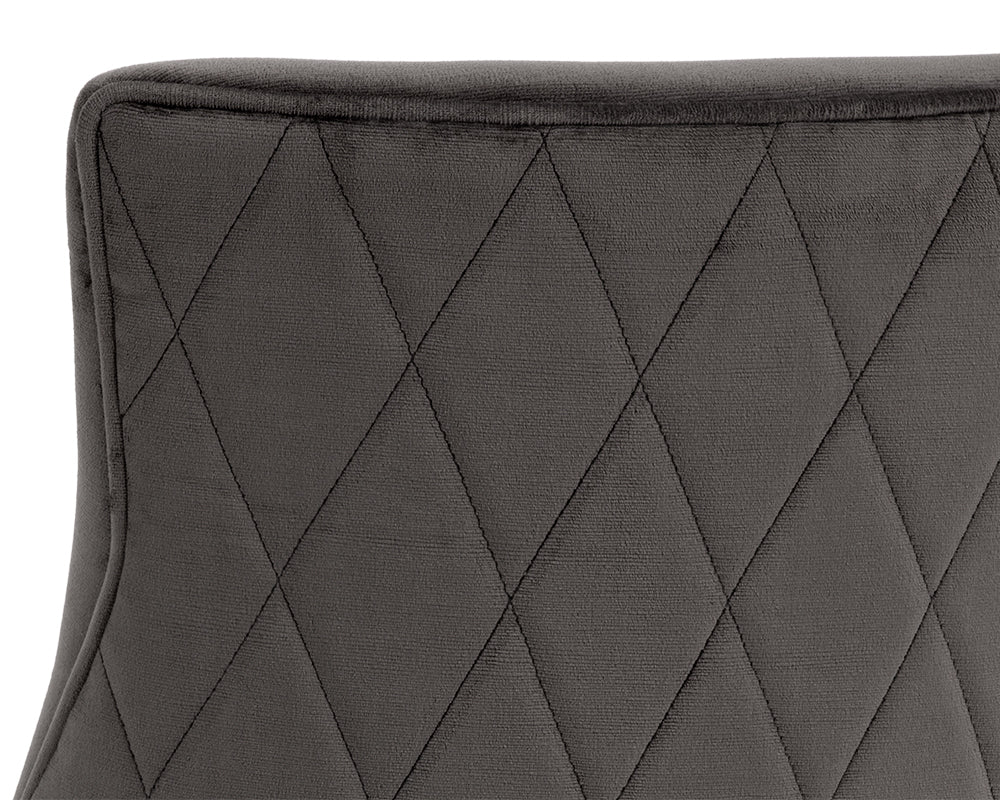 This dining chair offers transitional elegance. Features a beautifully sculpted seat in our soft abbington black fabric, with a rustic bronze cantilever frame. A diamond stitched pattern on the exterior seatback adds a touch of beauty to complete the look. Also available in piccolo prosecco and piccolo pebble