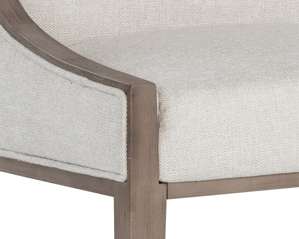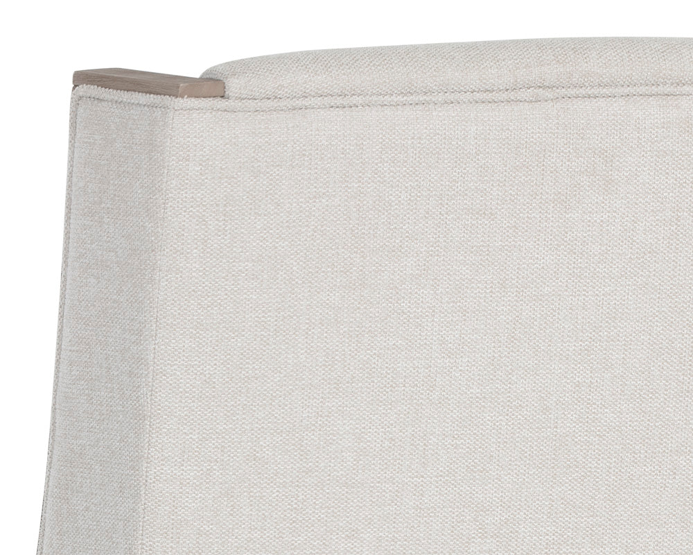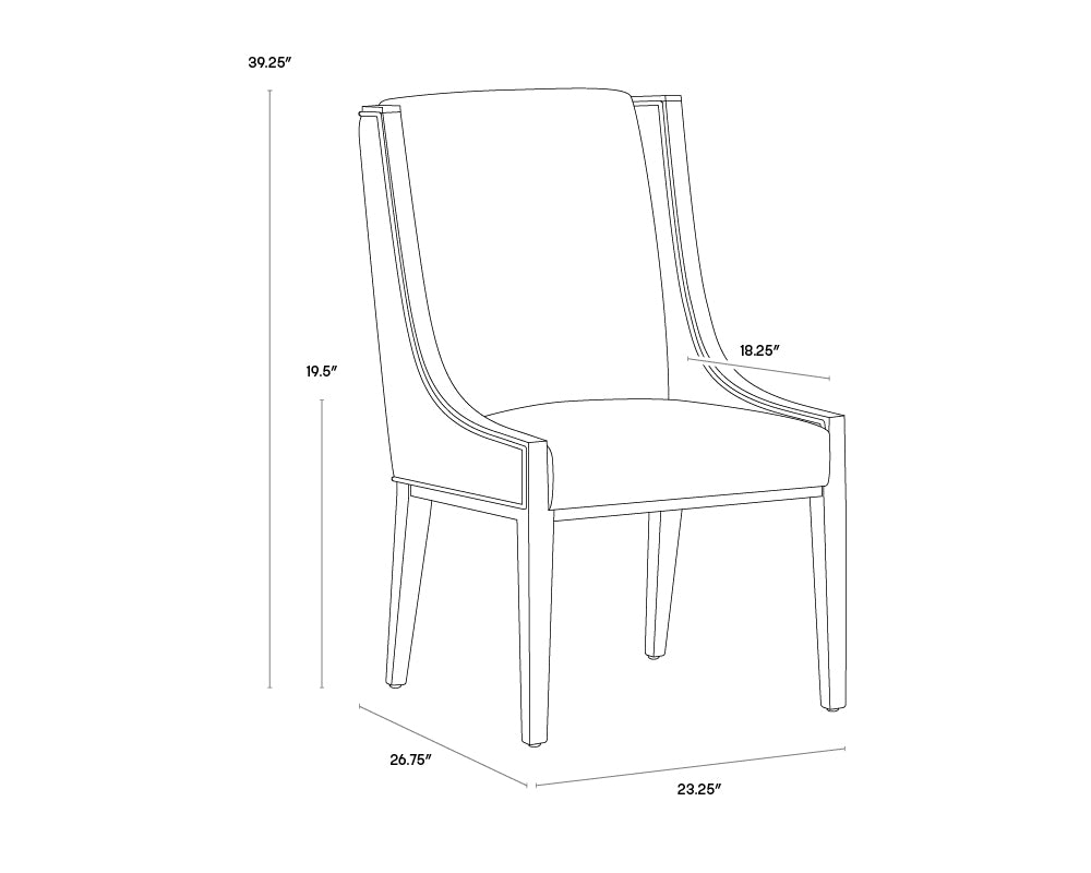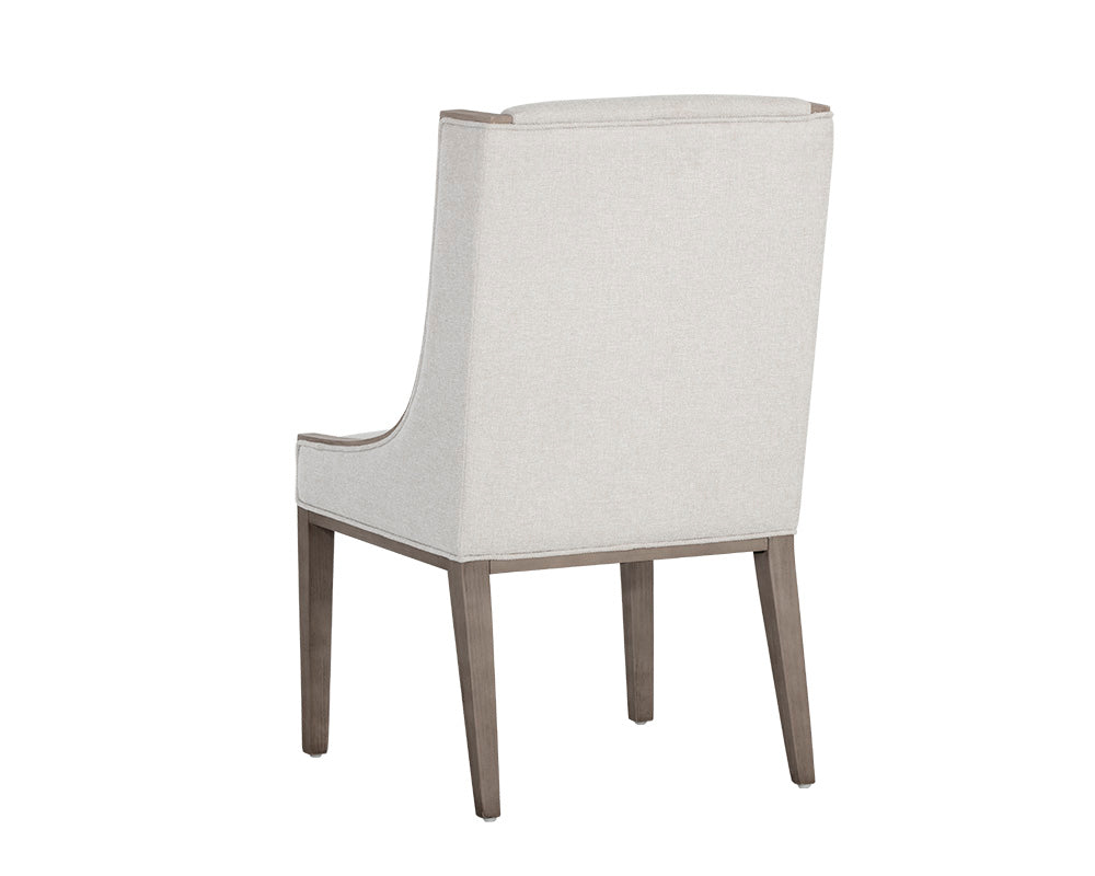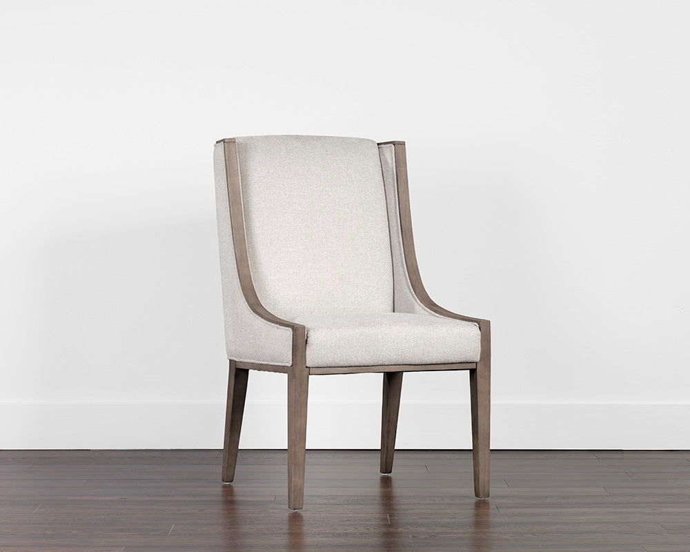 A classic look suitable for any space. This dining chair features a subtle wing back style with a contoured silhouette. Stocked in soft belfast heather grey fabric with an exposed brown wood frame in brown. Also available in belfast oatmeal fabric with a latte wood frame.