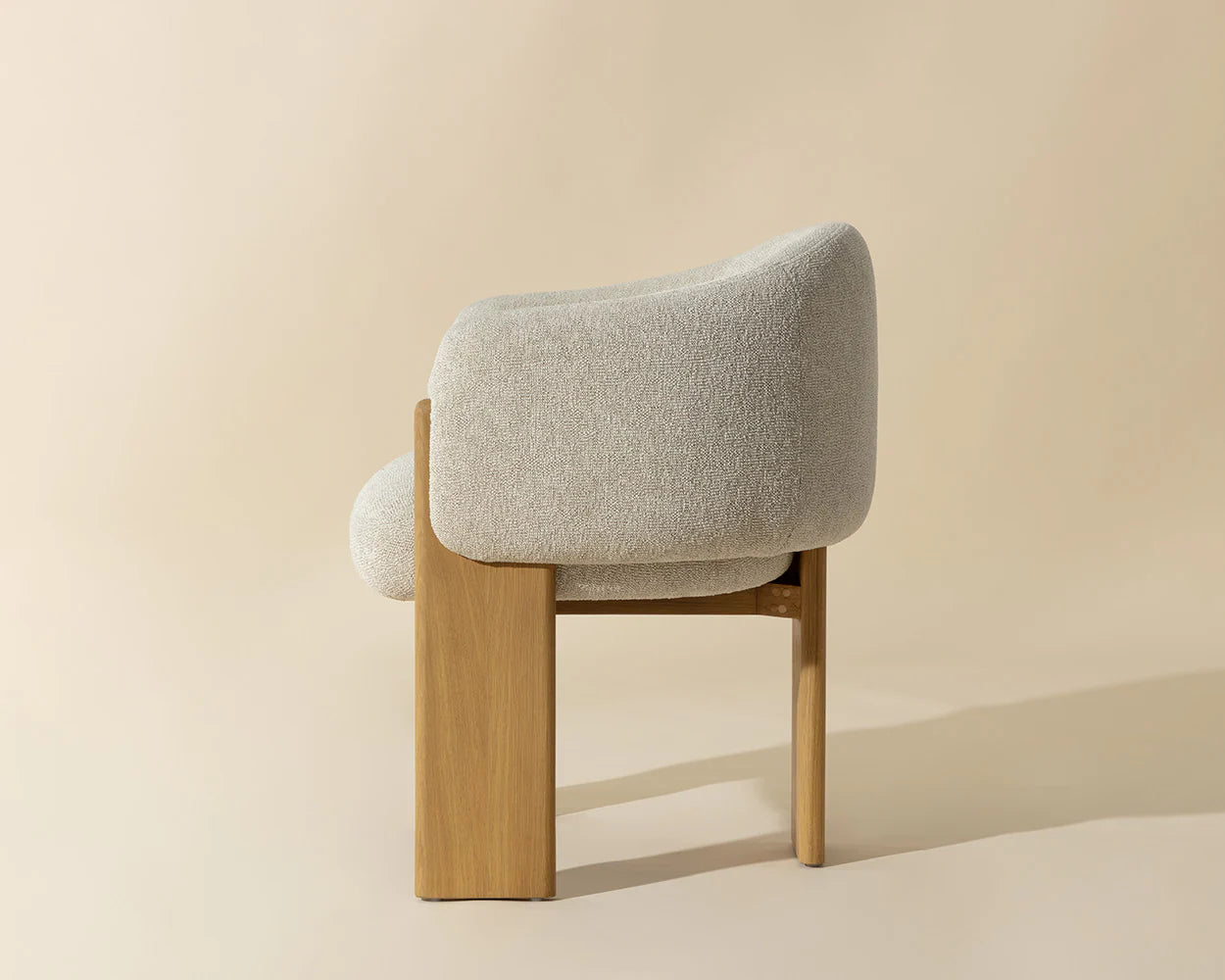 Embrace the luxurious comfort of the uniquely shaped Trine Lounge Chair. Generously padded and upholstered in our stylish dove cream fabric, this piece will complement any home aesthetic. Completed with a rustic oak wood base with a cerused finish on the legs.