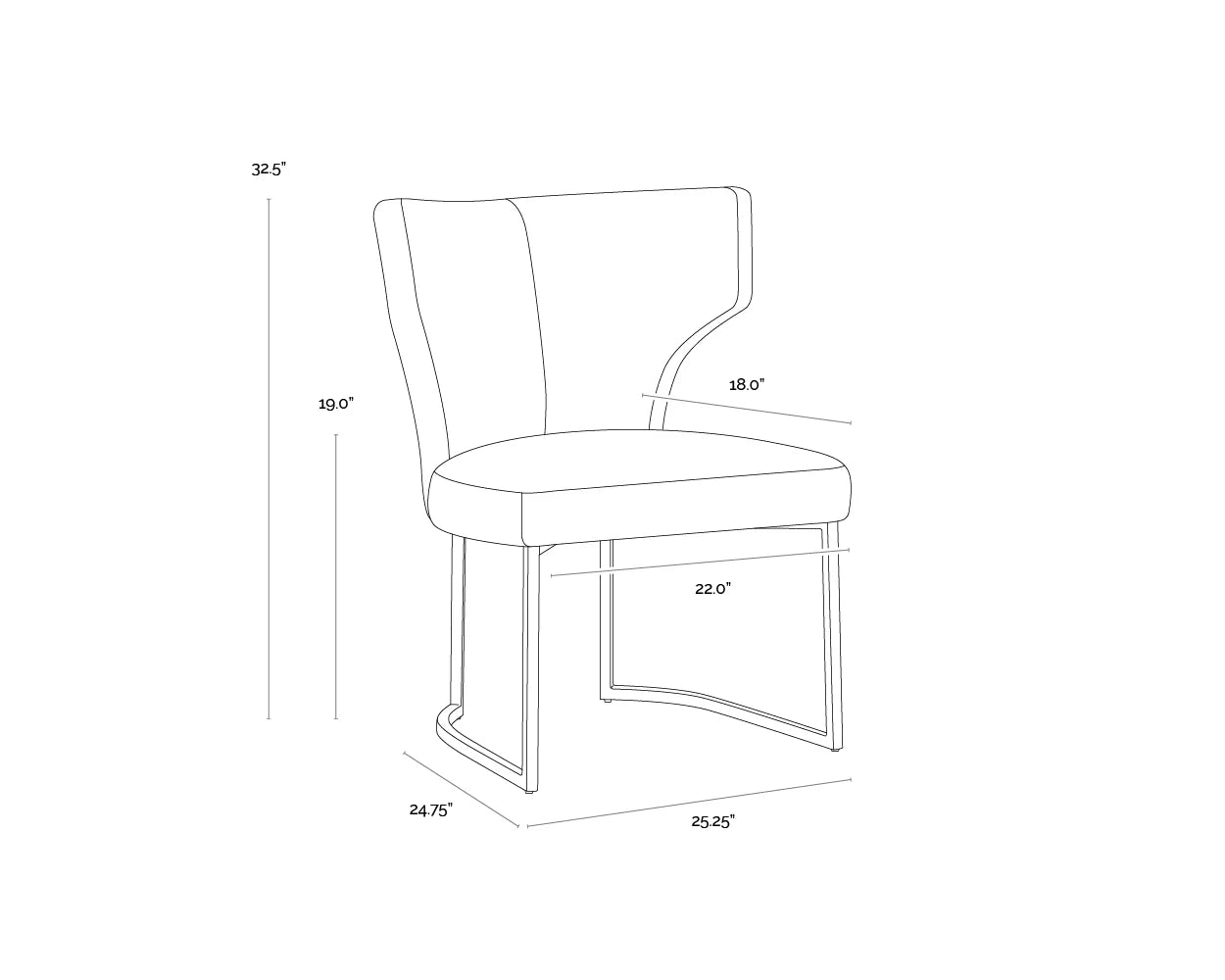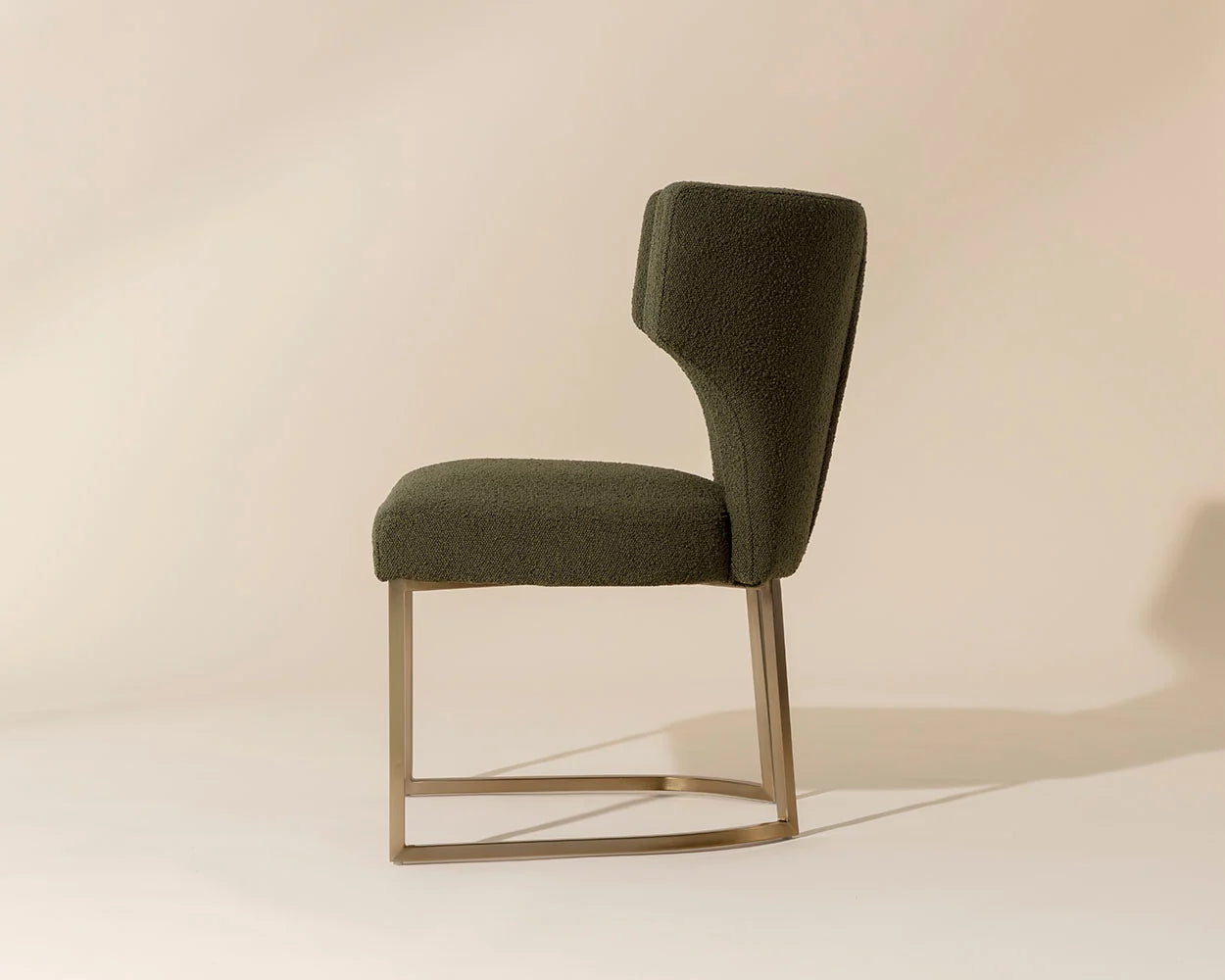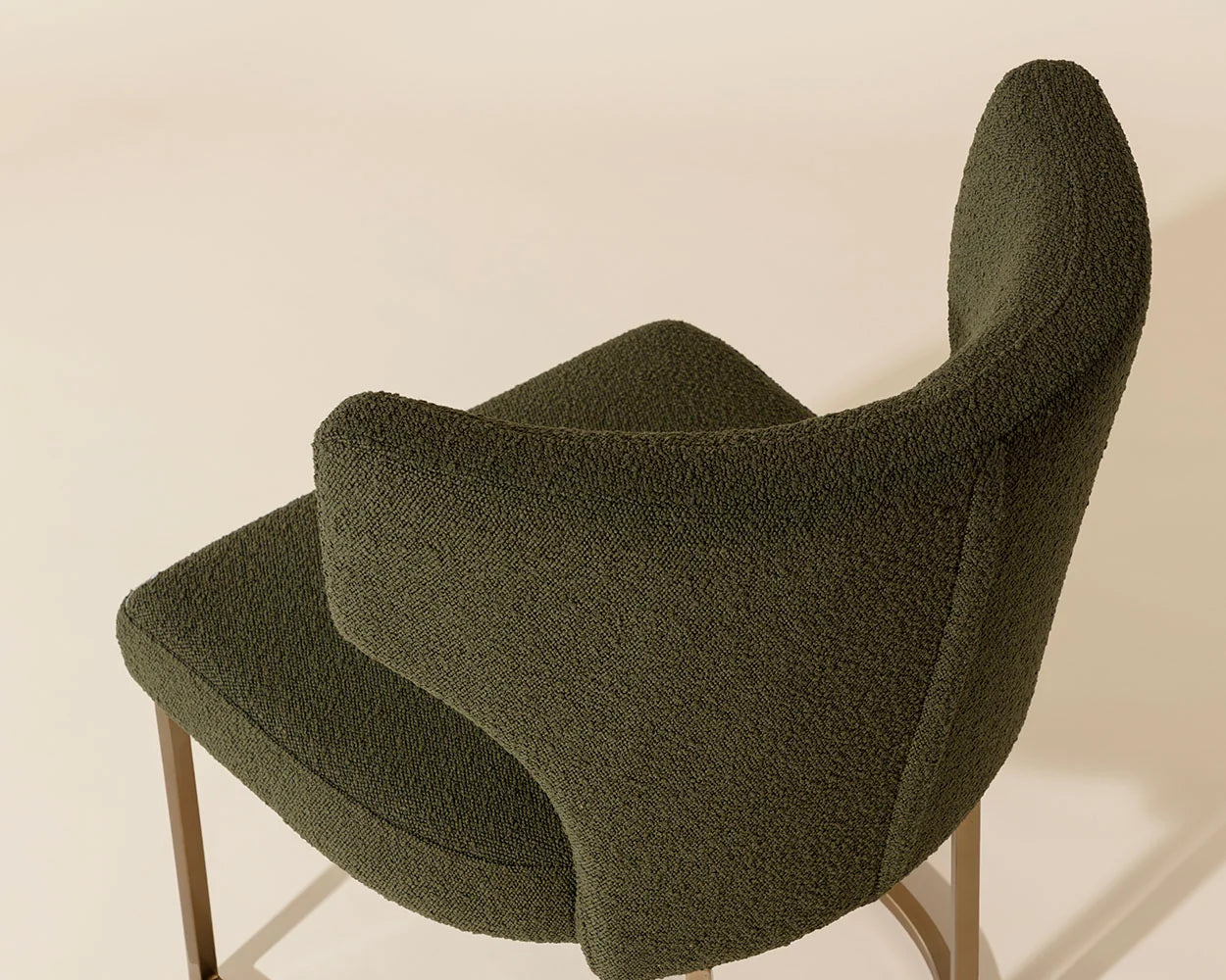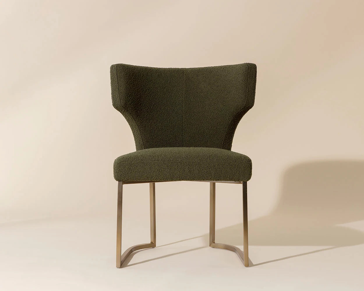 The elegant curves of the Willowdale Dining Chair will bring an air of sophistication to any dining space. Soft copenhagen olive fabric pairs beautifully with gold powder-coated stainless steel for a refined look.
