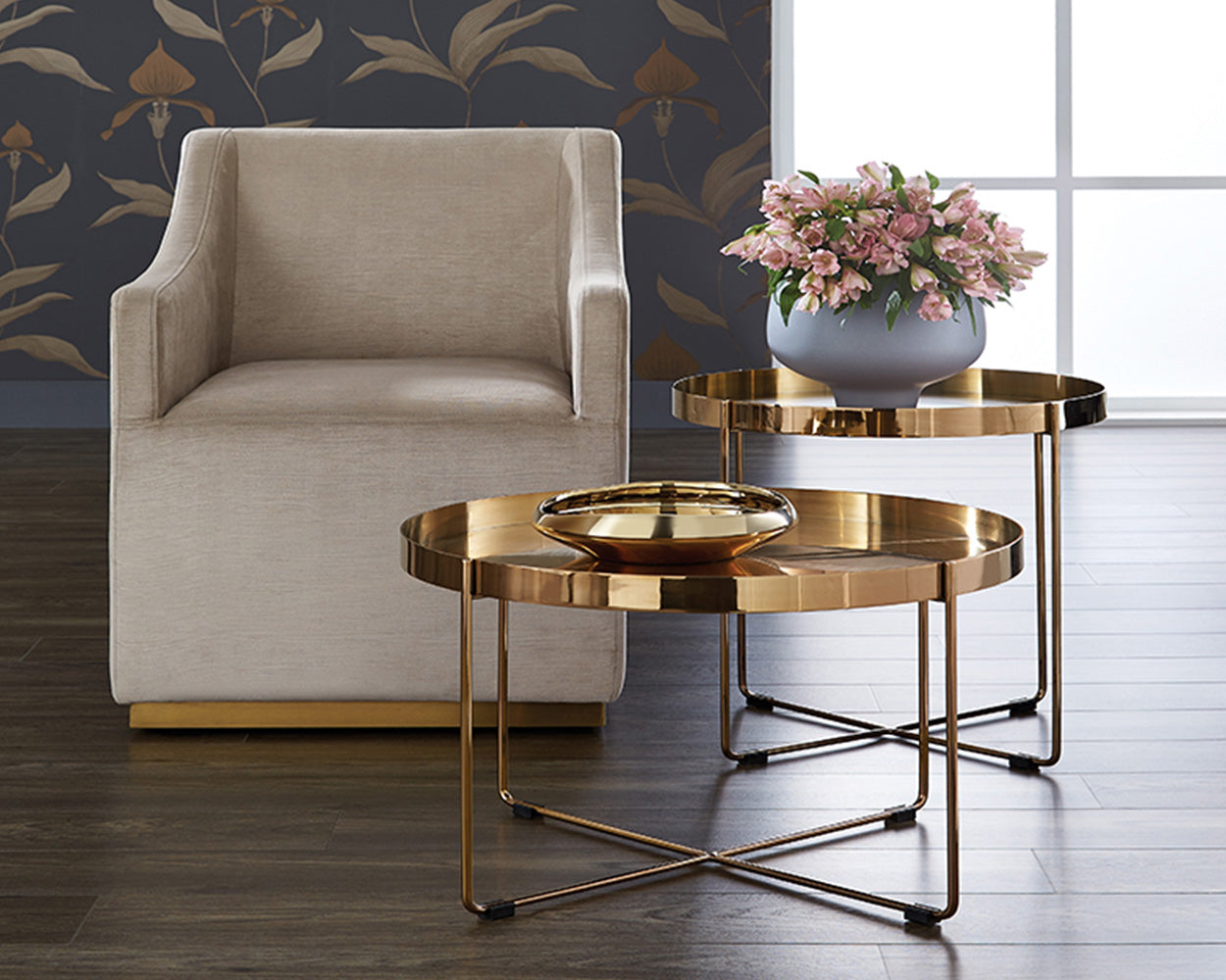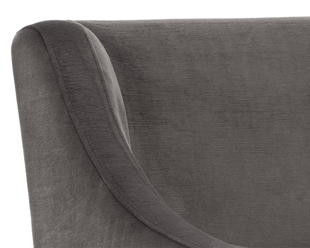 An eye-catching, ultra glamourous wheeled lounge chair. Stocked in our abbington black fabric with a brushed brass steel frame. Also available in piccolo prosecco and pebble performance fabric. Sophistication and comfort fit for various dining and lounge spaces.