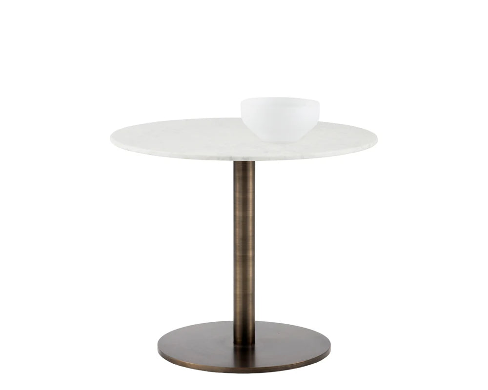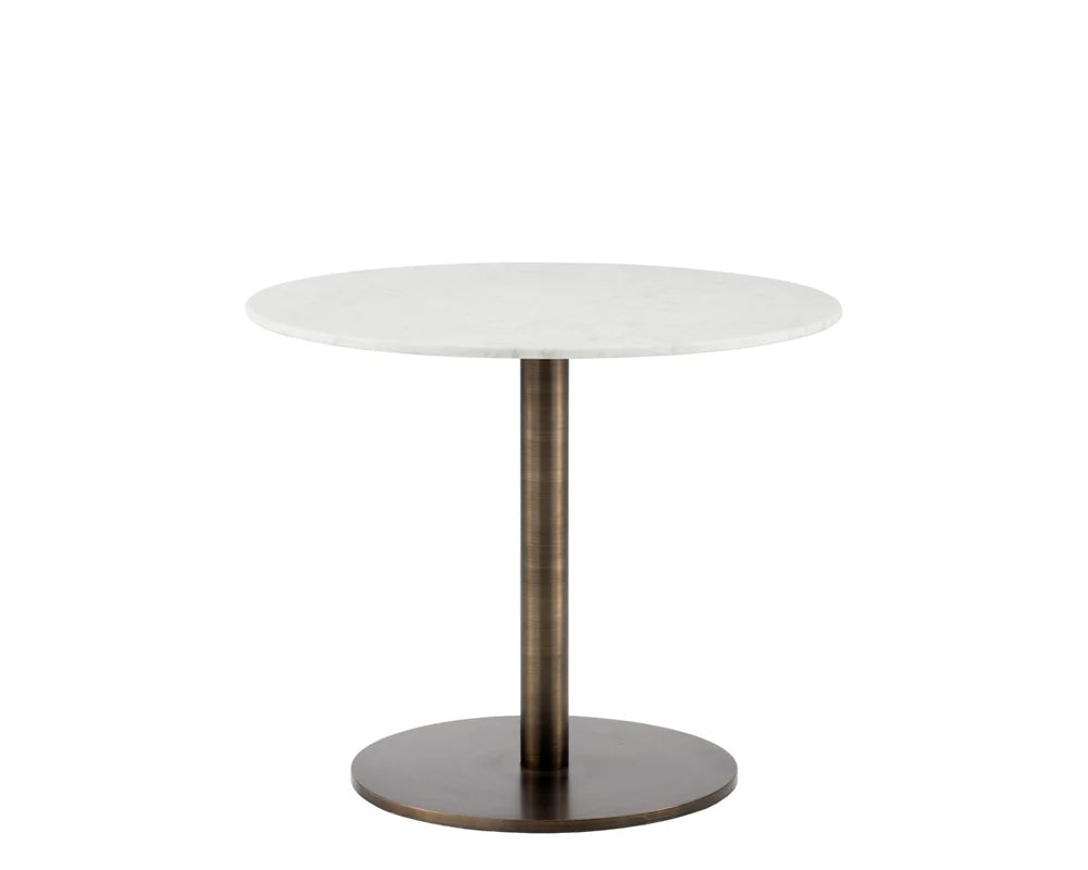 An Art Deco inspired round bistro table, featuring a solid carrara marble top with an antique gold steel base. Perfect for restaurants and smaller kitchen and dining spaces. As marble is a natural material, unique veining, pitting, fissures, micro-cracks and colour variations are all characteristics that add to the uniqueness and beauty of each piece.