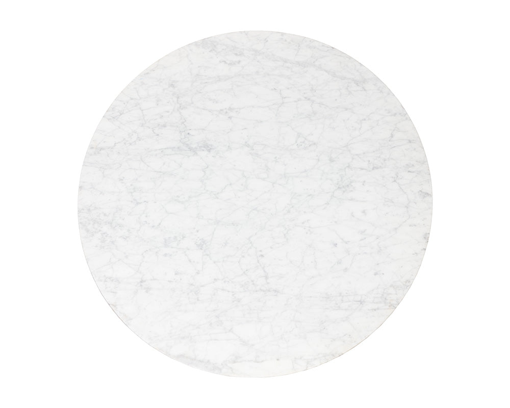 A round dining table inspired by Art Deco luxury. Features a white Carrara marble table top with a striking black and gold steel base. As marble is a natural material, unique veining, pitting, fissures, micro-cracks and colour variations are all characteristics that add to the uniqueness and beauty of each piece.
