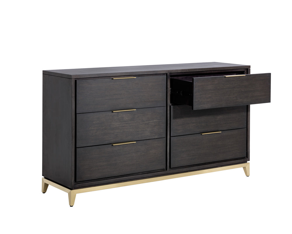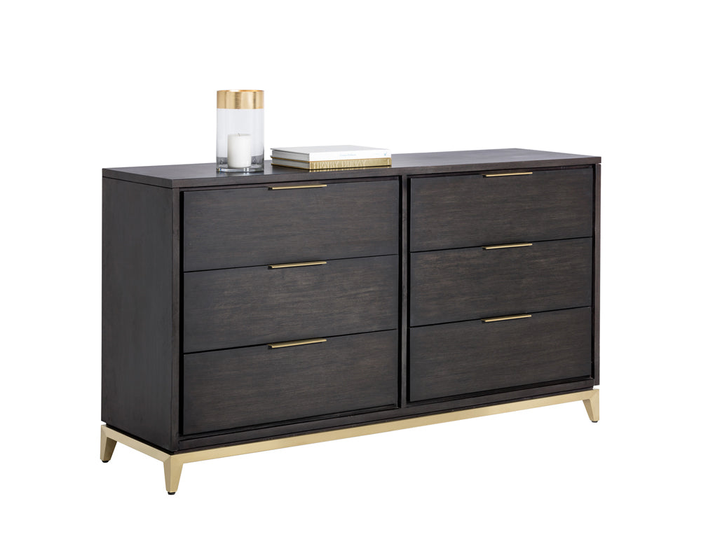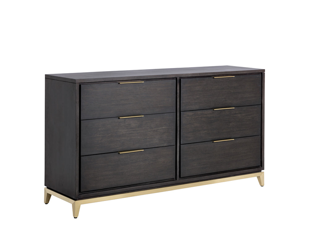 This dresser will add warmth and allure to any bedroom space. Made of acacia wood veneer in a smoked grey-brown finish with six deep soft-close drawers. Brushed yellow gold steel handles and base complete the look.