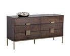 This uniquely crafted dresser will add transitional allure to any bedroom. Made from acacia wood veneer with six drawers for ample storage. Contrasting wood grain patterns on the drawer fronts and antique brass hardware complete the look. Suitable for residential and contract settings.