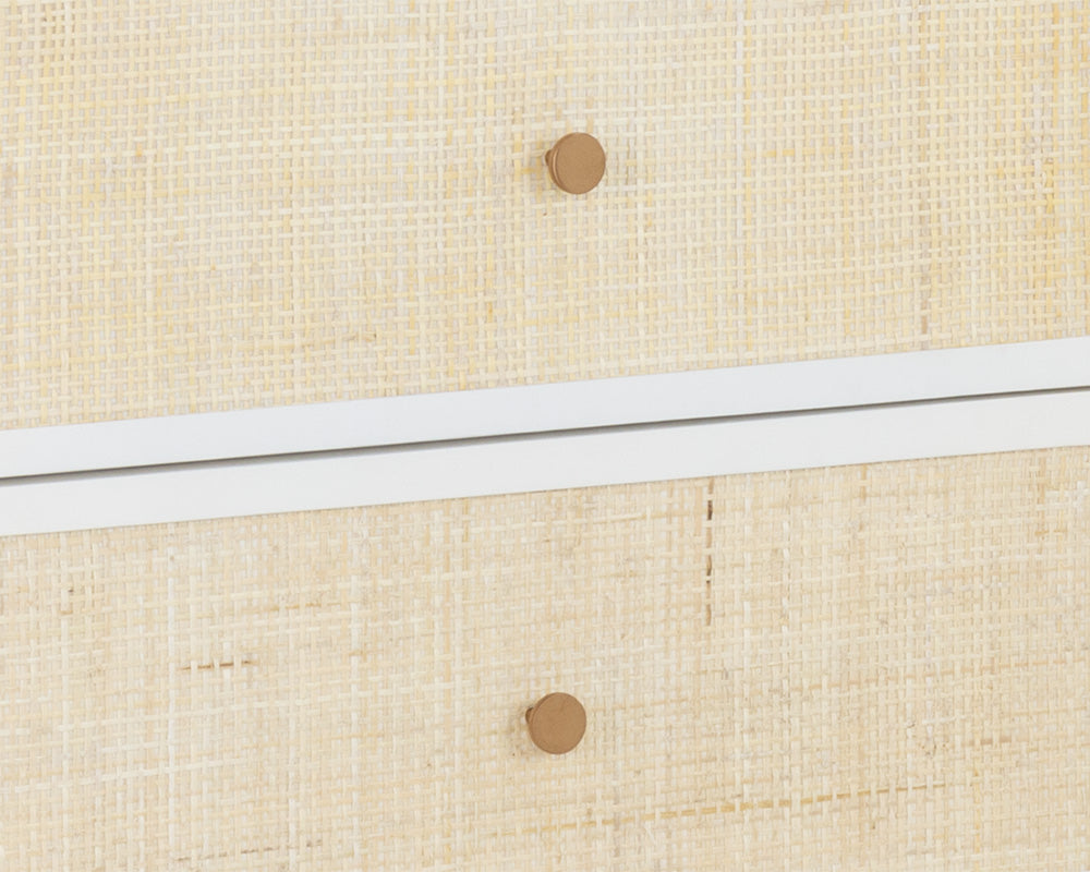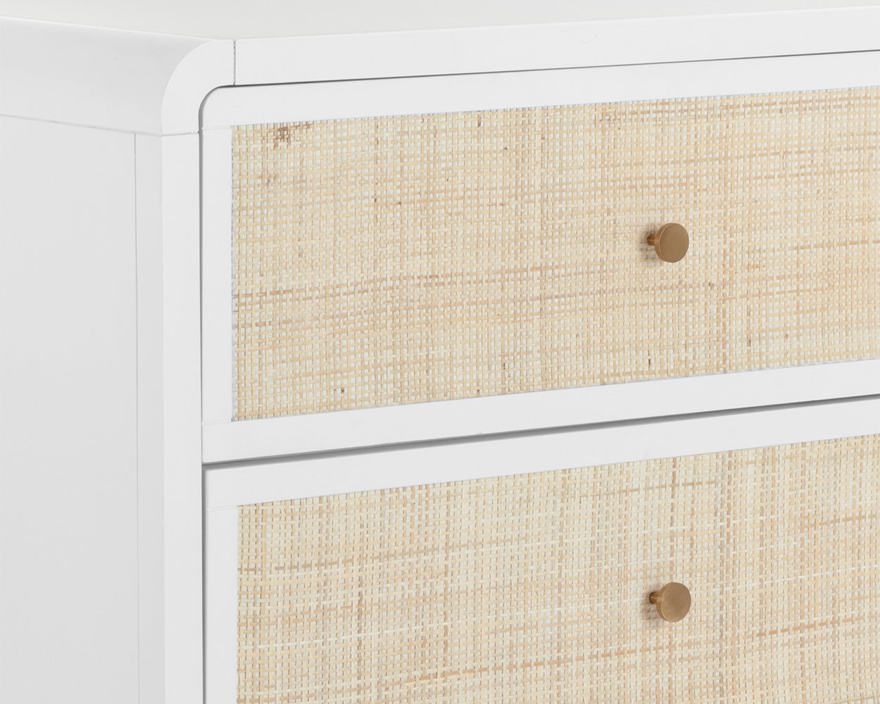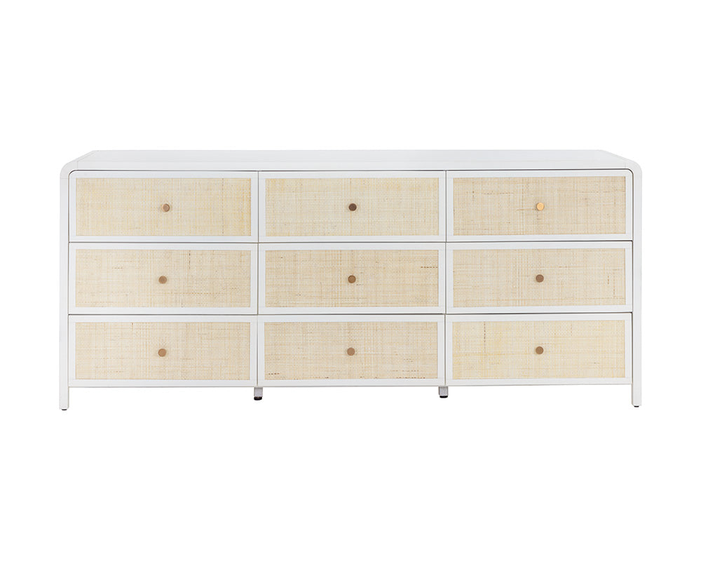 Boasting a stylish design with coastal influence, this beautiful dresser features a clean-cut silhouette. Features an antique white wood frame with natural rattan detailing on nine, spacious drawers. Completed with minted copper steel hardware. Coordinating bed, chest and nightstand also available. Handle With Care: This design has been crafted with rattan. This artisan-crafted material features intricate weaving that results in natural variations where no two pieces are alike. Colour and texture differences are to be expected and embraced with this natural material. Due to the weaving process used, the fibres in this material may display shorter or longer lengths where the weaving ends. Visit our Product Care page for more information on how to ensure the lasting beauty of this piece.
