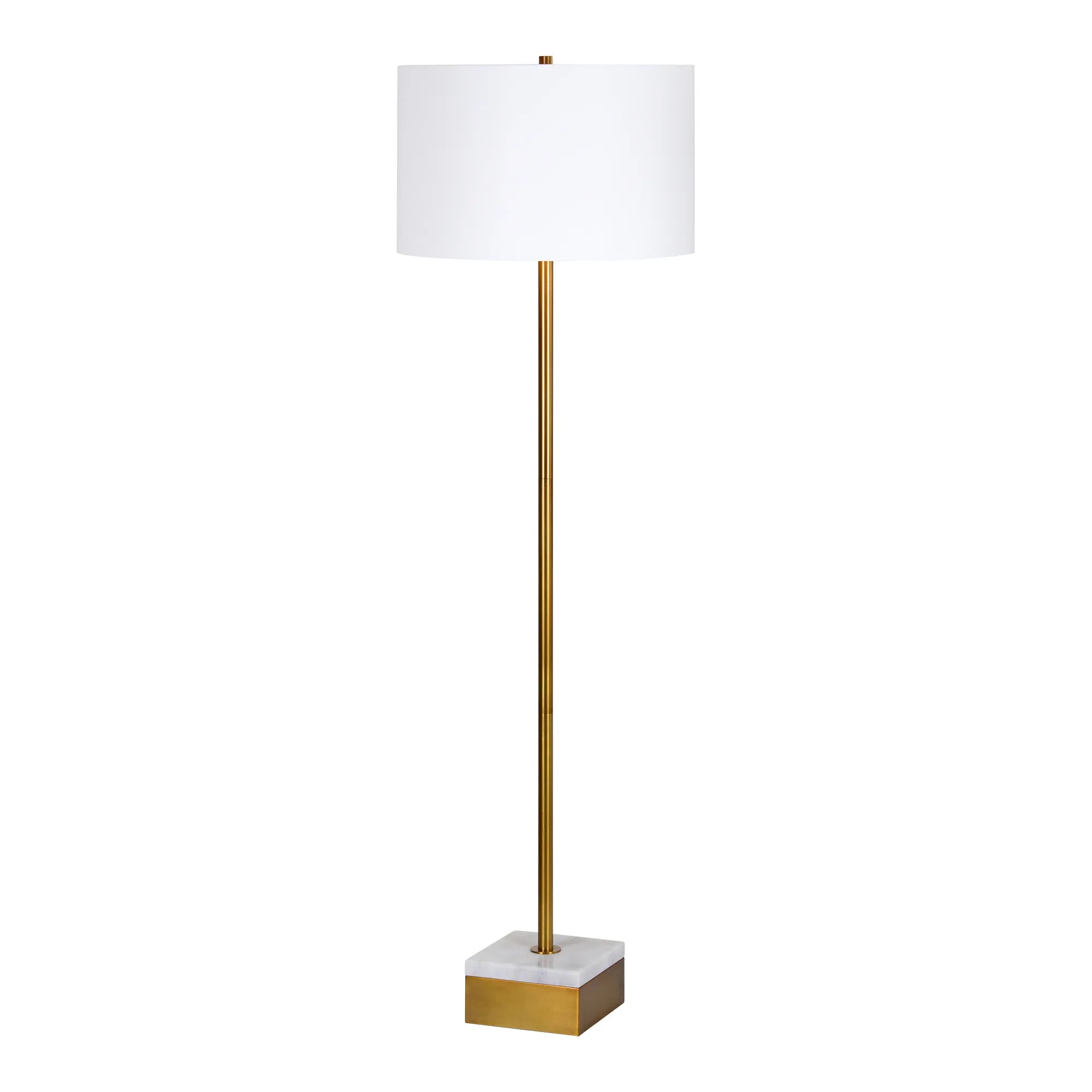 This modern floor lamp is simple in stature but rich in design details. Elements of antique gold among the solid white marble base elevate the lamp's straightforward shape, while a white linen drum shade adds volume to the delicate frame.