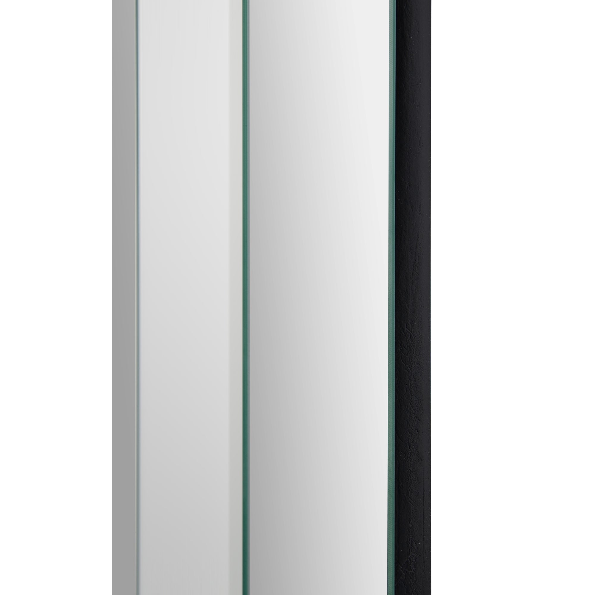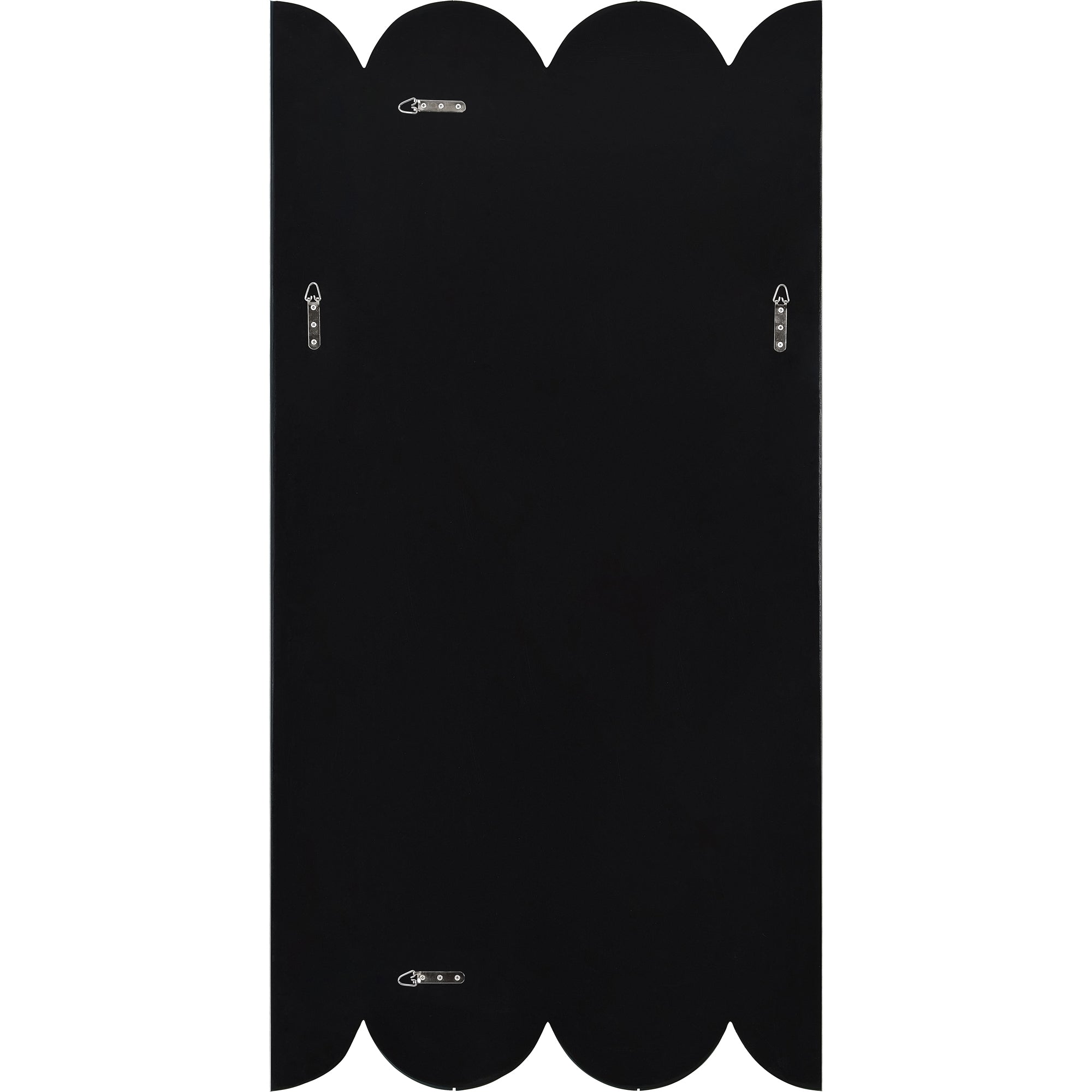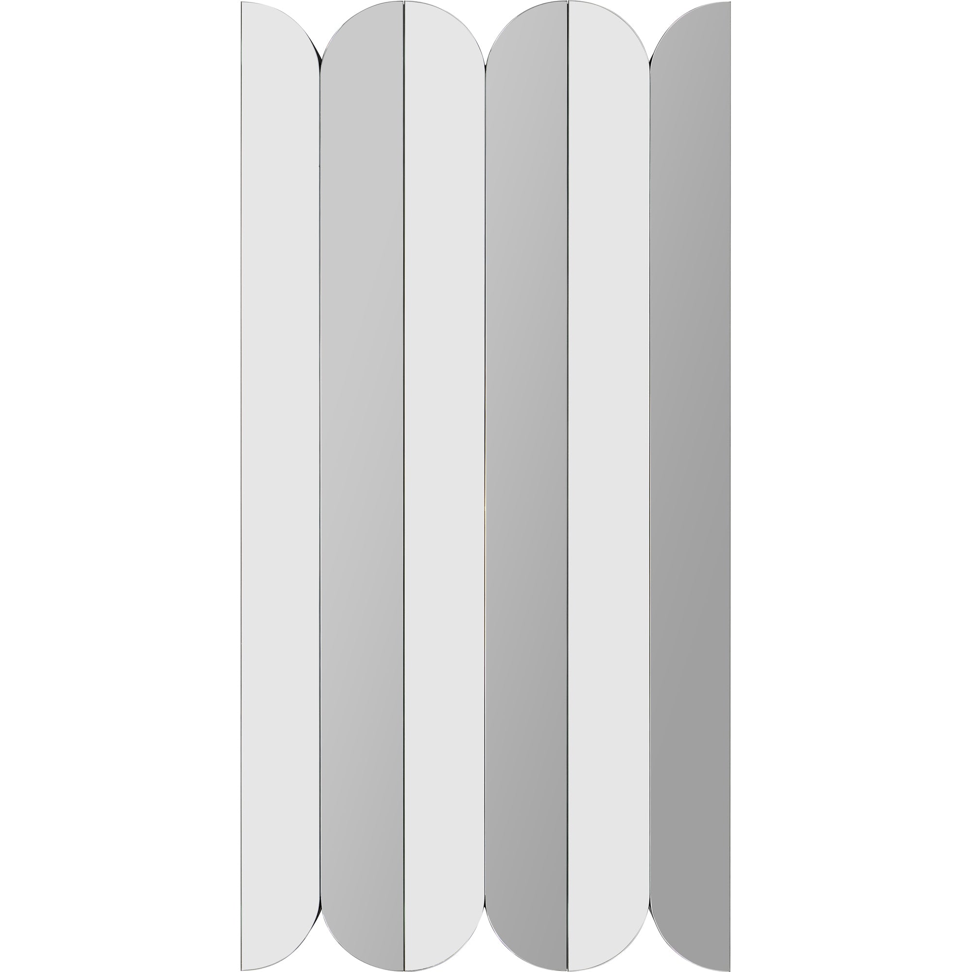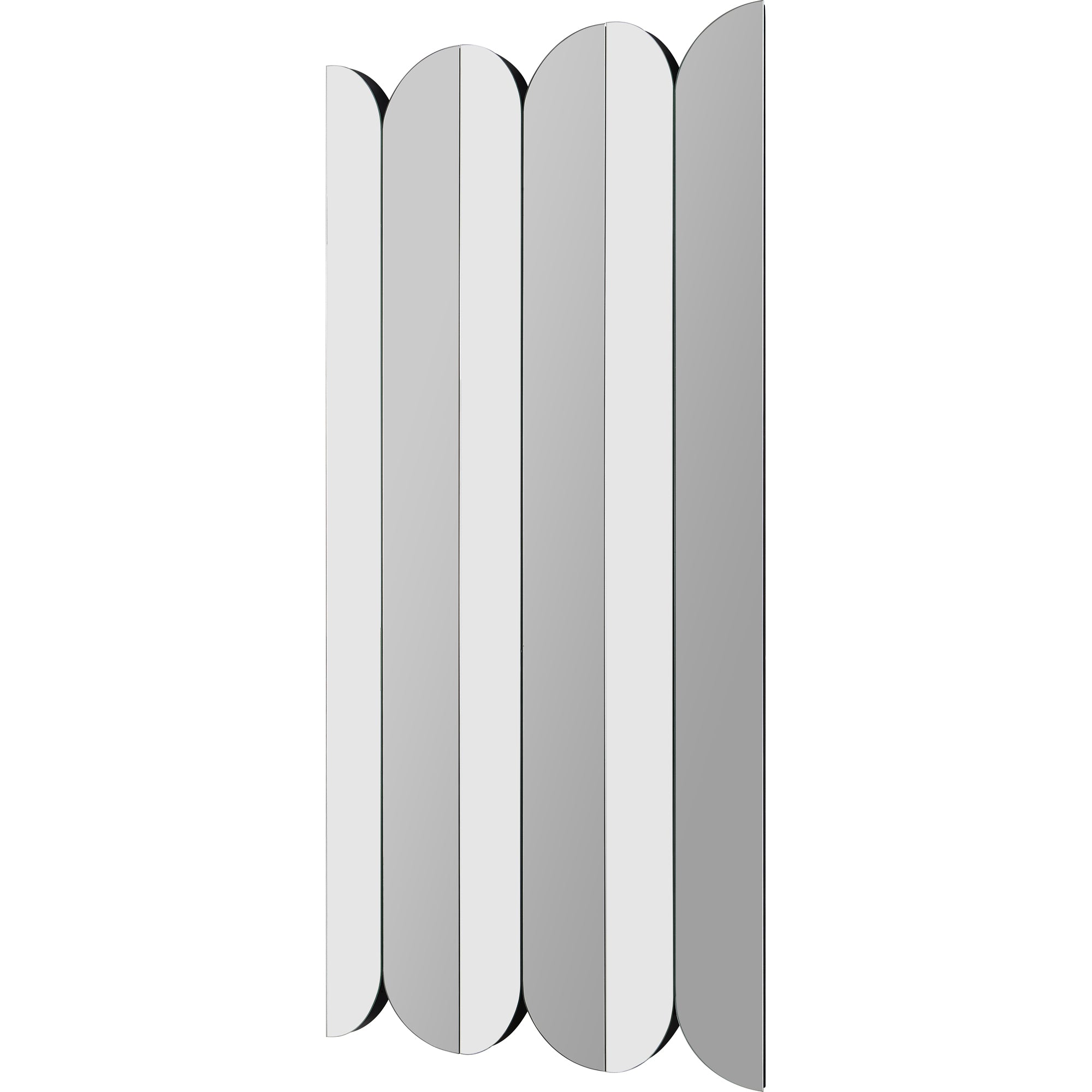 art deco elegance radiates from this captivating mirror. Its length has the capacity to take in one's full appearance and beyond. The unique composition of the all glass design allows for brightness and shadows to add additional complexity to this artistic piece.