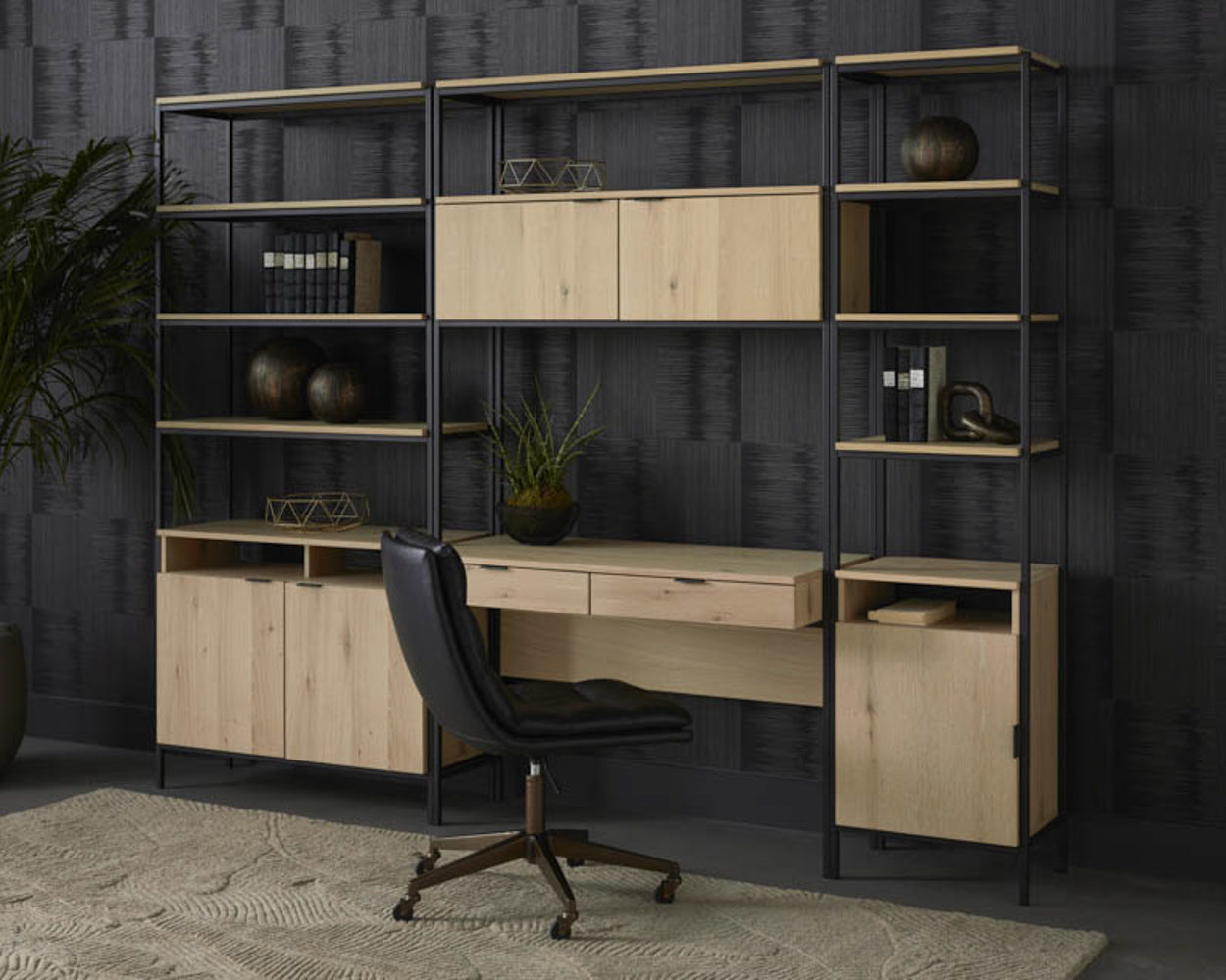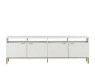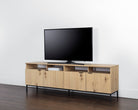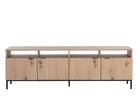Crafted in Indonesia, this beautiful media console and cabinet will bring modern style and elegance to living, lounge and home office spaces. Designed with cream finished oak wood and a champagne gold iron frame. Also available in a naturally rustic finished oak wood and a matte black iron frame. Features four cabinets for added style and function. Coordinate with the Ambrose modular wall desk, and large and small bookcases for a space saving design. As wood is an organic, porous material, these pieces will contain natural variation of texture and may also exhibit fine indentations and cracks. Wood pieces will also display a disparity of colour and grain, and visible knots and burls that add to the character of each piece.