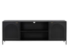 An industrial media console and cabinet with a steamlined composition. Crafted with a black metal frame and completed with brass handles. Features open shelving and two cabinets with an arched perforated metal design. Pairs well with the Aziza sideboard and nightstand. Made in India. With refined craftsmanship, this design was brought to life by skilled local artisans. By nature, these materials develop unique imperfections such as markings and colour variations for a truly one-of-a-kind piece.