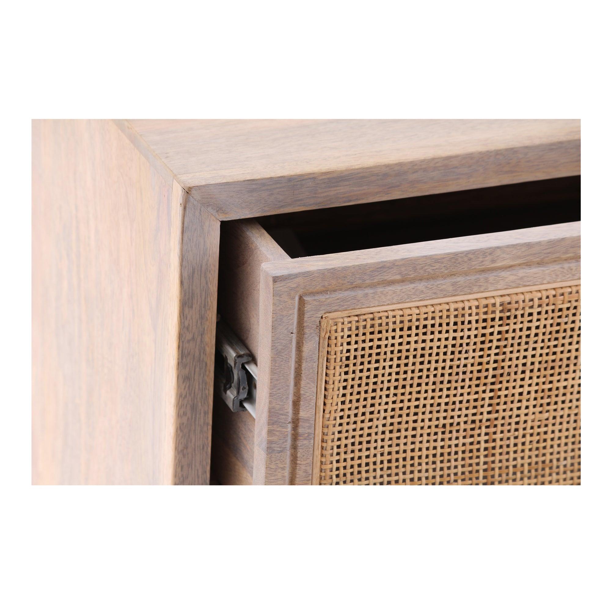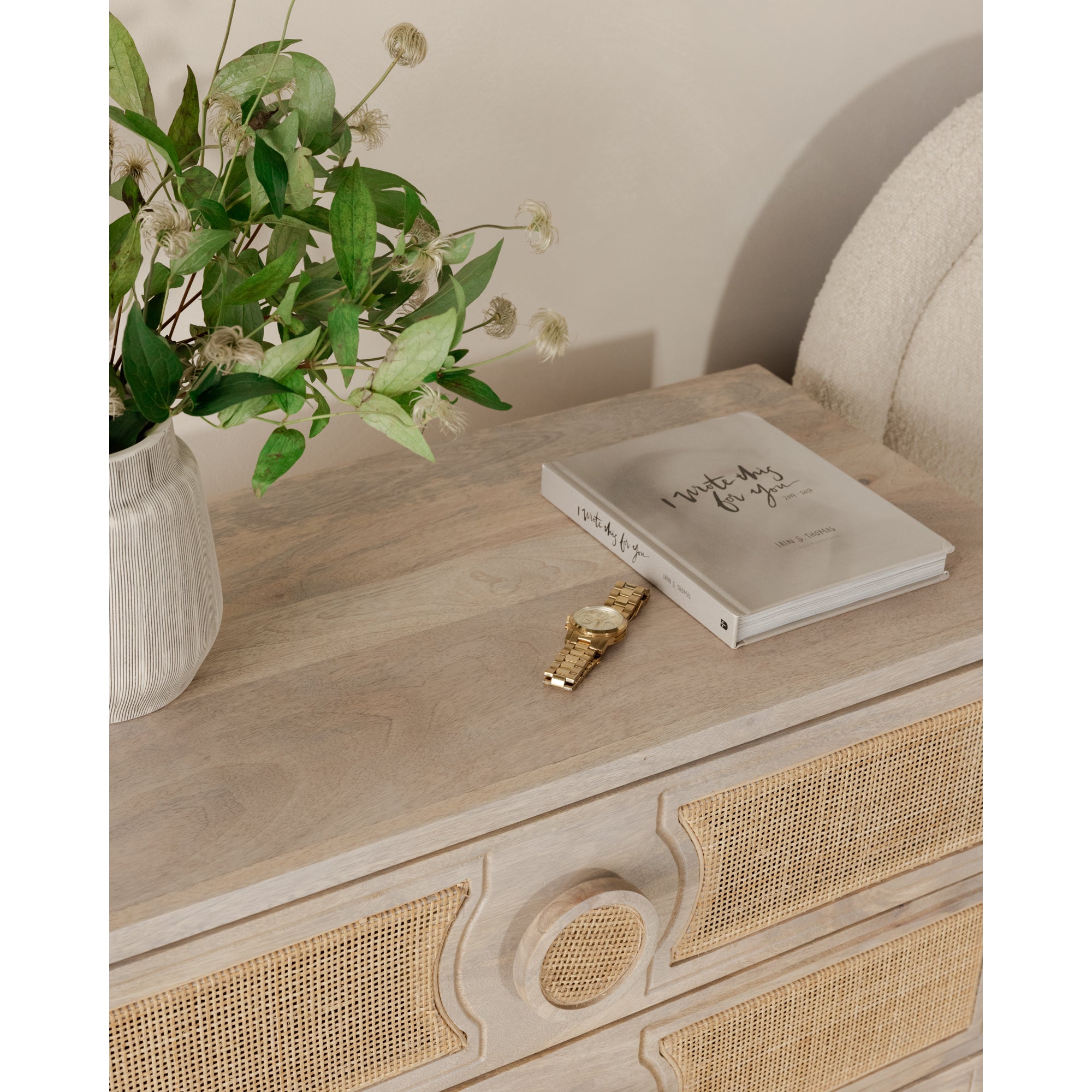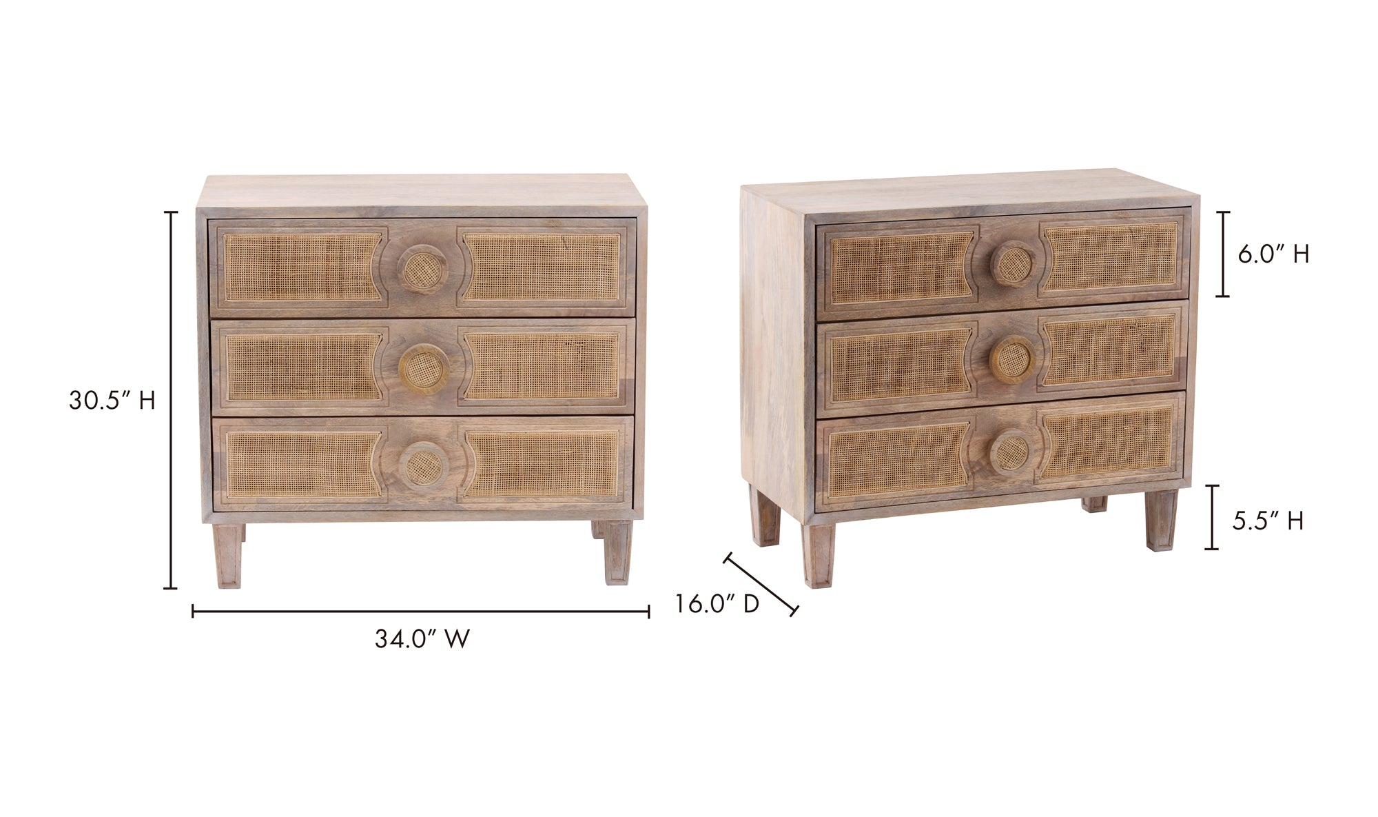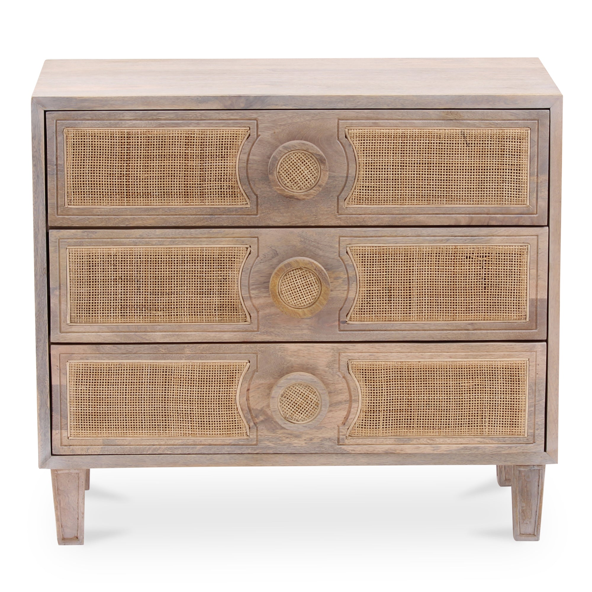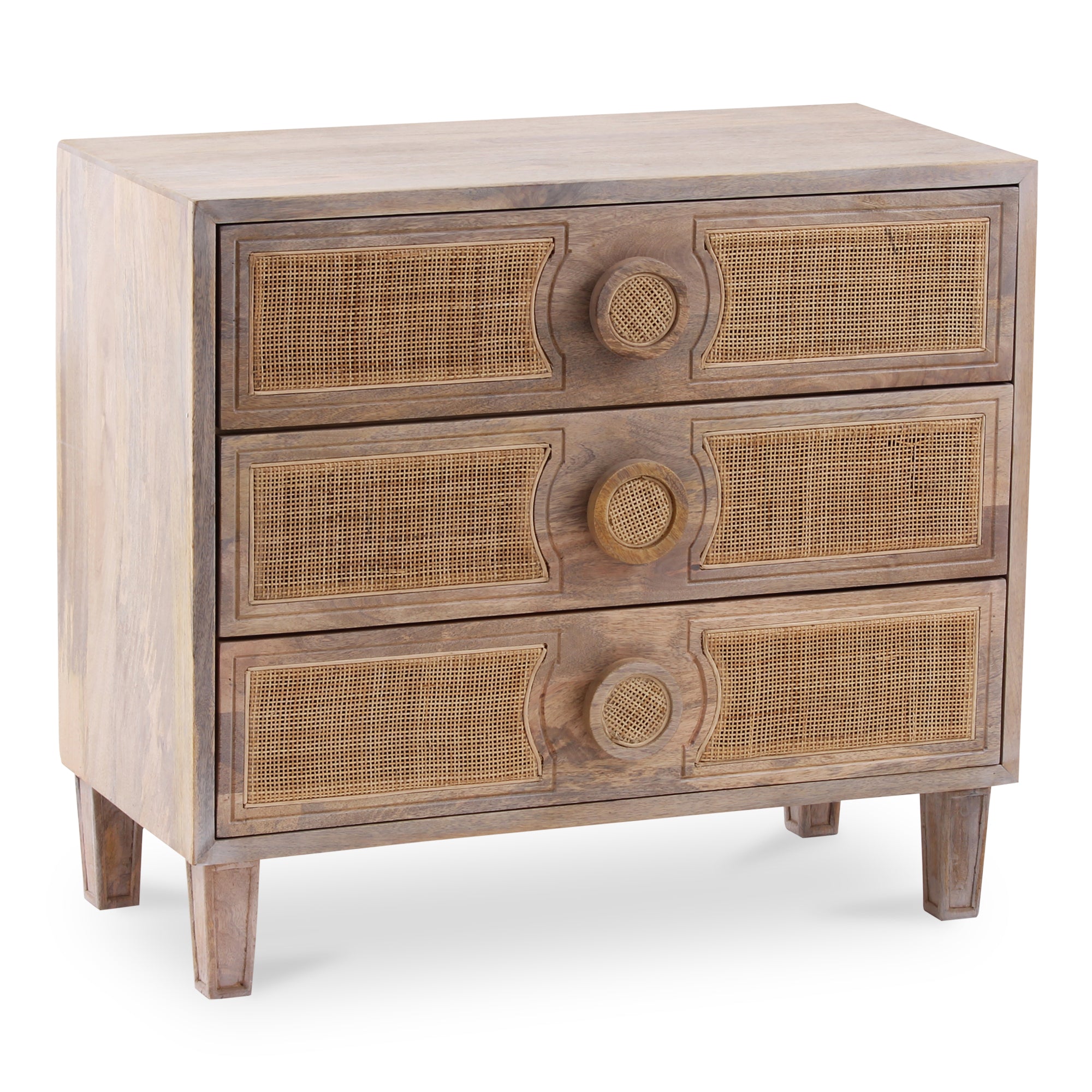 Nicely Nordic and made with your bedroom in mind. A stylish combination of solid mango wood and natural woven cane detailing give this dresser freshly refined Scandinavian style. With three spacious drawers help maximize storage for smaller bedrooms, this dresser is perfect for keeping clothes and other items stored away. Sturdy legs for lasting durability, and side-mounted drawers for smooth-sliding access.