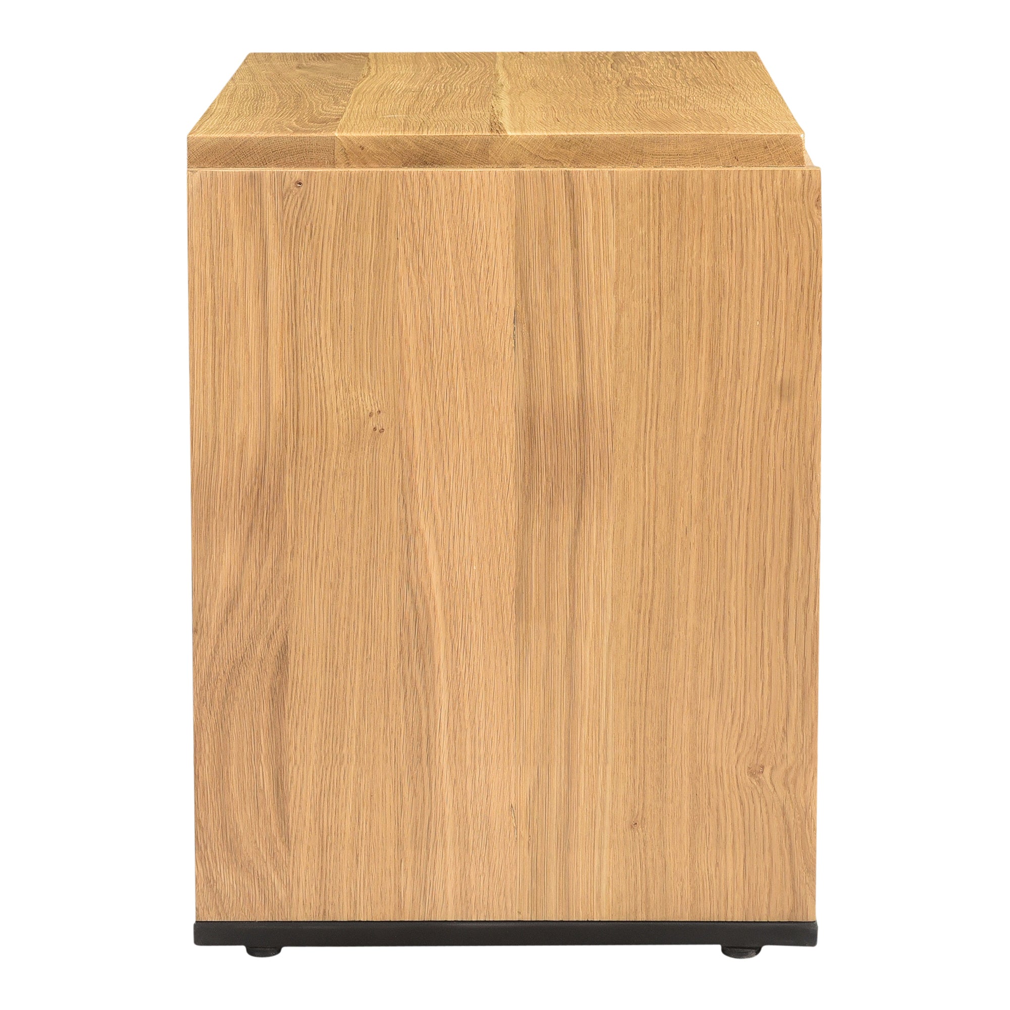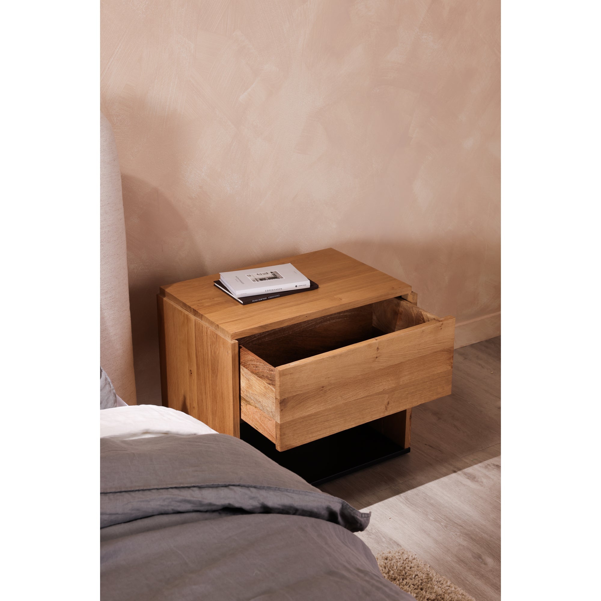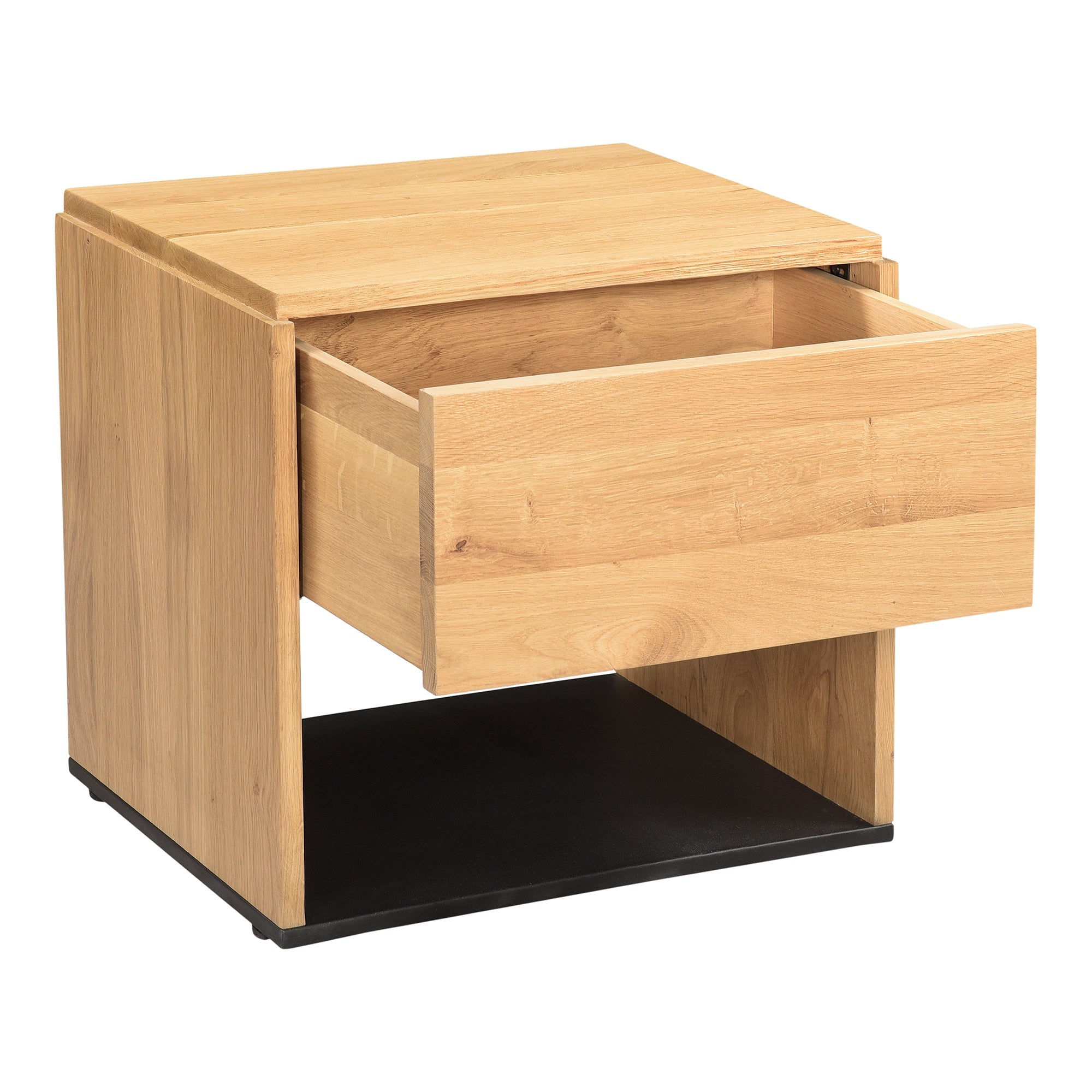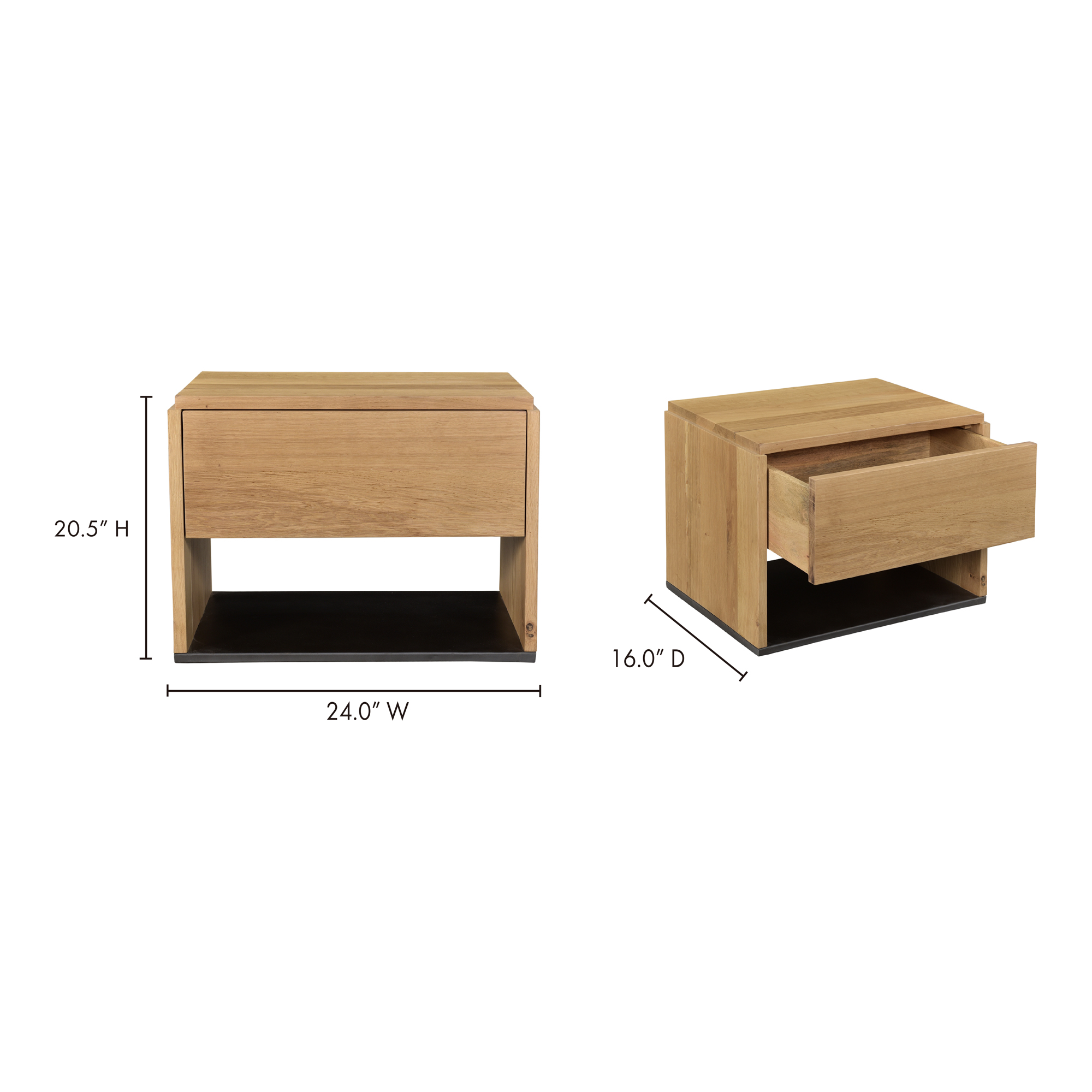 A beautiful contrast of natural blackened oak wood against a sleek iron sheet base, the Quinton nightstand is a natural storage solution at home in any style. This solid oak bedside table is fitted with a single spacious drawer and clean lines for a seamless, contemporary finish—a handy storage essential.