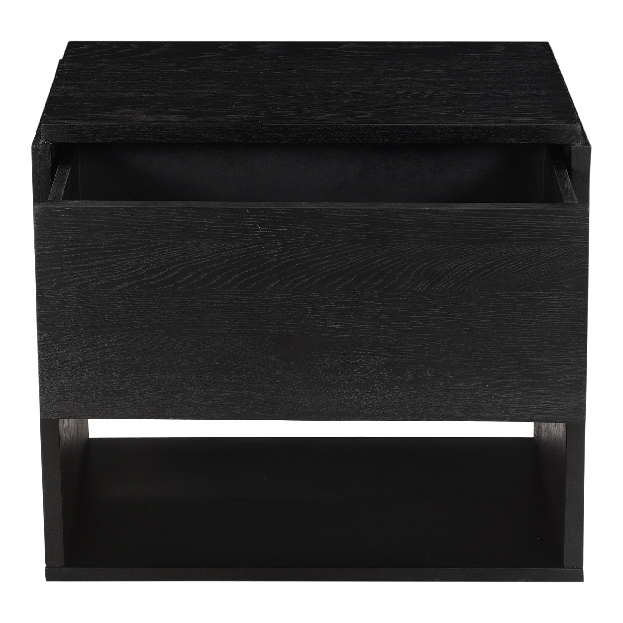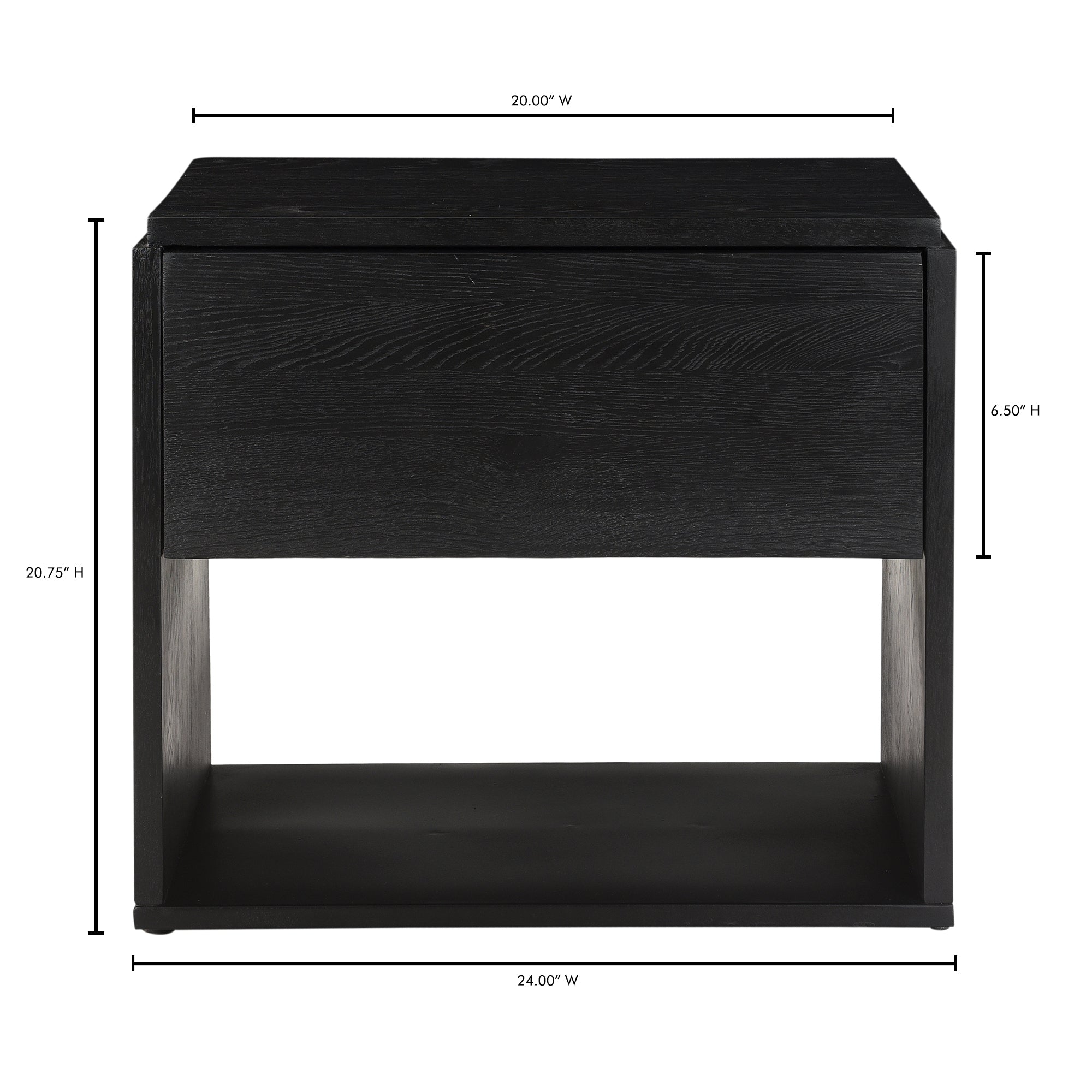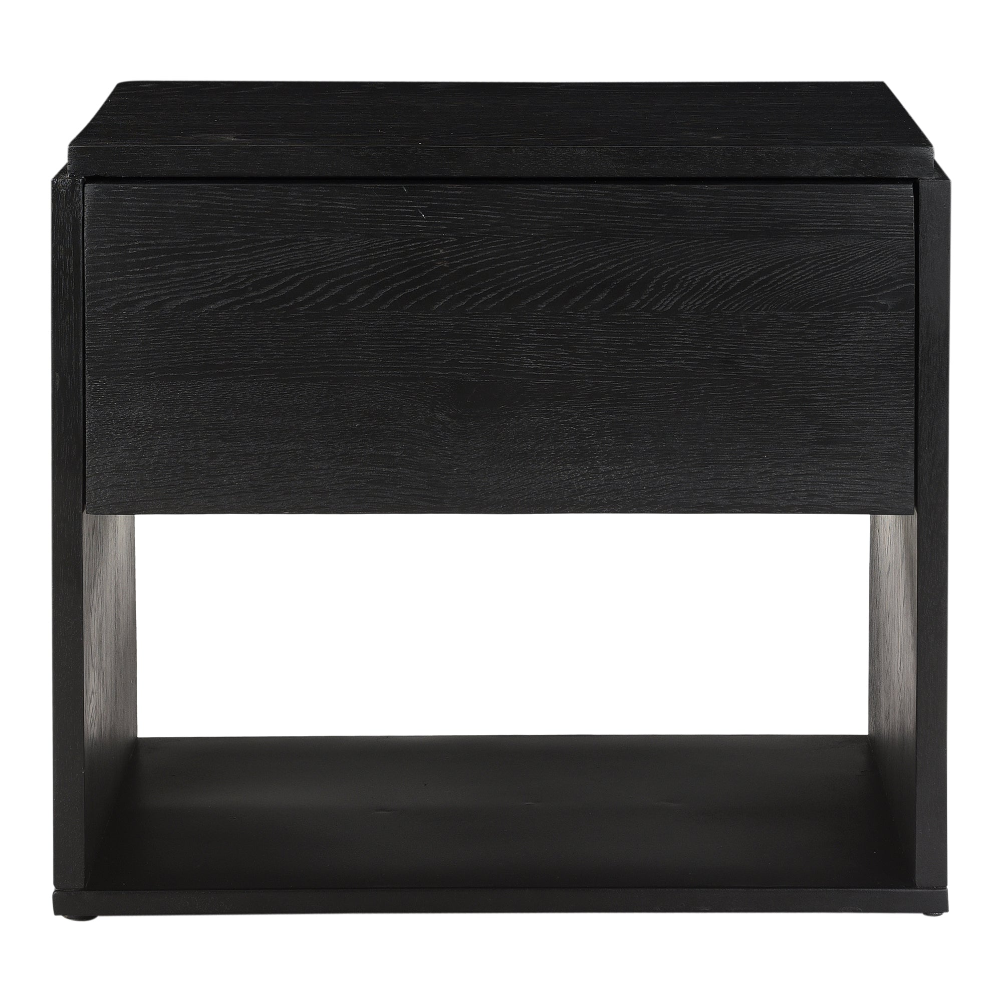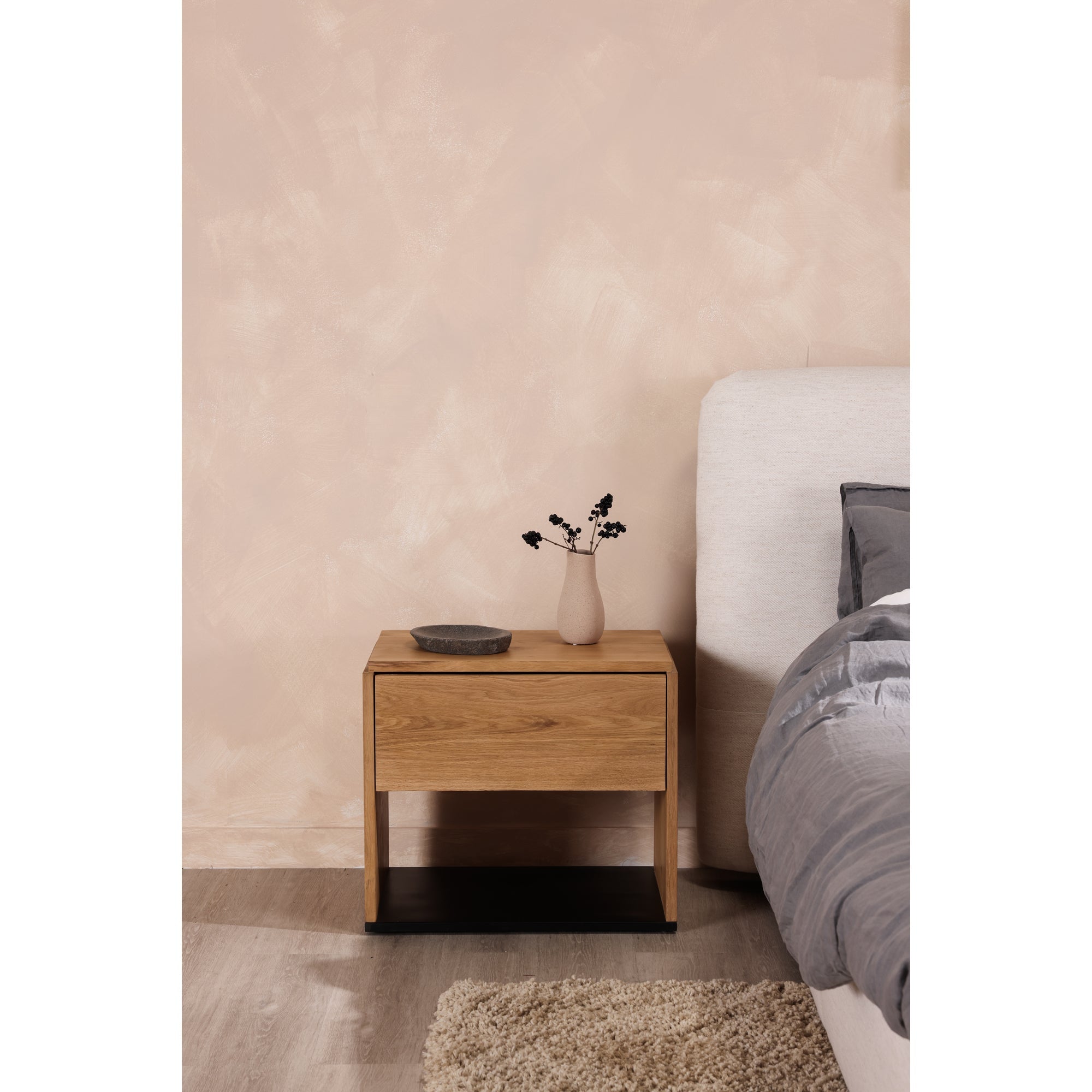 A beautiful contrast of natural blackened oak wood against a sleek iron sheet base, the Quinton nightstand is a natural storage solution at home in any style. This solid oak bedside table is fitted with a single spacious drawer and clean lines for a seamless, contemporary finish—a handy storage essential.
