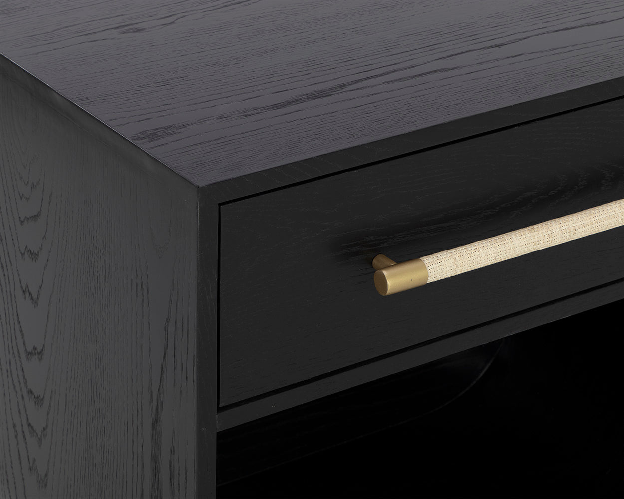 Fluid lines and gentle curves make up the modern silhouette of the Tarrant Nightstand. The raffia wrapped drawer handle adds an understated touch to the black oak veneer base.