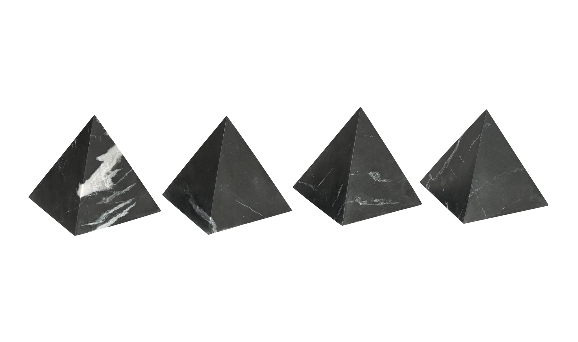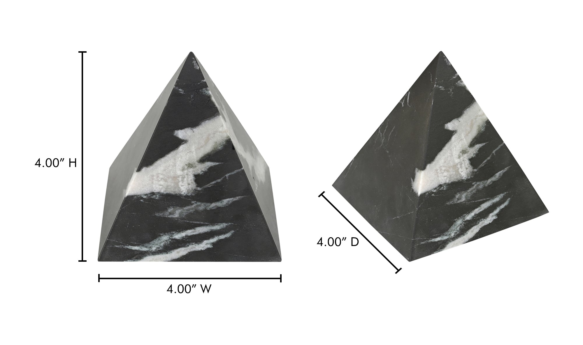 Crafted from luxurious solid black marble, the Alma pyramid tabletop accent is delicately flecked with highlights of gold that dance across the sleek black canvas. Carefully finished with black felt on the bottom, it guarantees protection against unsightly scratches, ensuring displays remain unmarred and pristine.
