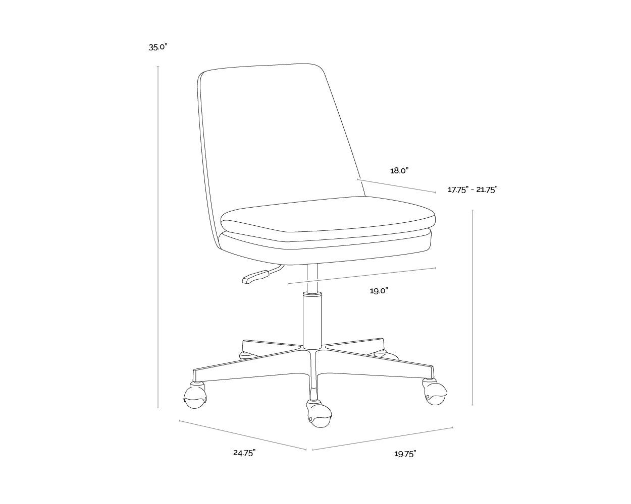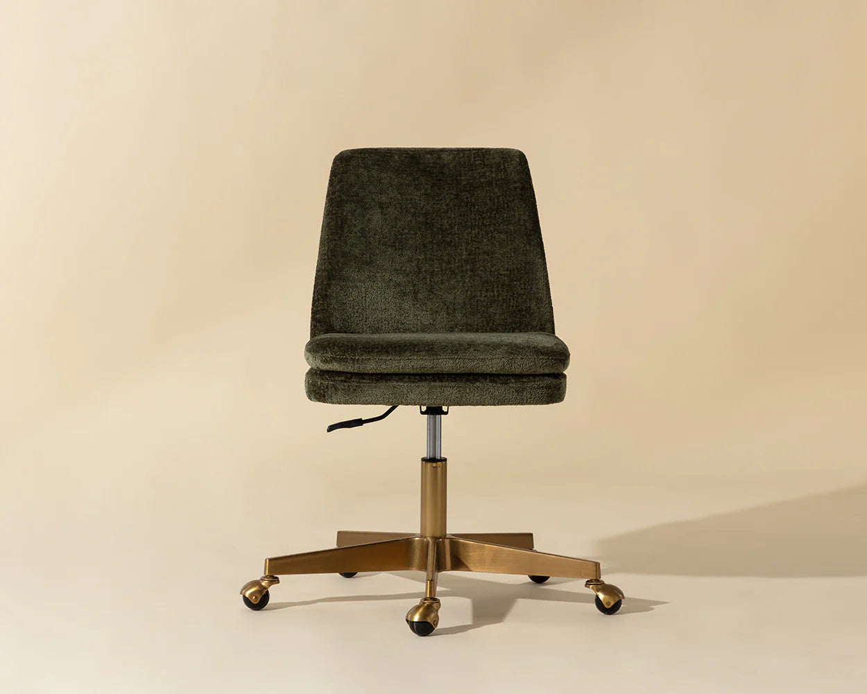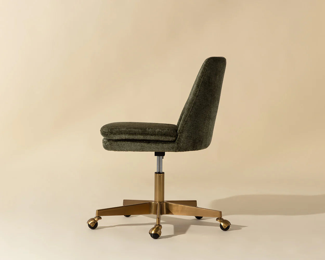 Infuse a touch of glamour to any workspace with this fabulous modern office chair. Stocked in gold sky fabric and completed with a matte gold stainless steel base. Castors complete the look for added mobility. Also available in mina ivory fabric.