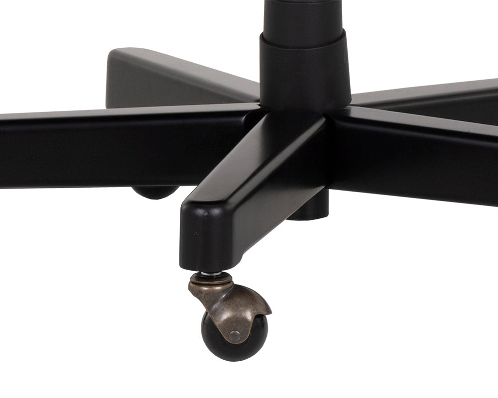 Introduce an element of sophisitcation to any workspace with this regal office chair that features a stunning wingback design with nailhead detailing on the seatback. Upholstered in tobacco tan faux leather and completed with a black birch wood base. Includes added castors with antique brass covers. Handle With Care: This design has been crafted with faux leather. Faux leather is manufactured to reflect the natural characteristics of leather; as such, colour variations, markings wrinkles, grooves, and light scratches are appreciated characteristics. No two pieces will be alike. Visit our Product Care page for more information on how to ensure the lasting beauty of this piece.