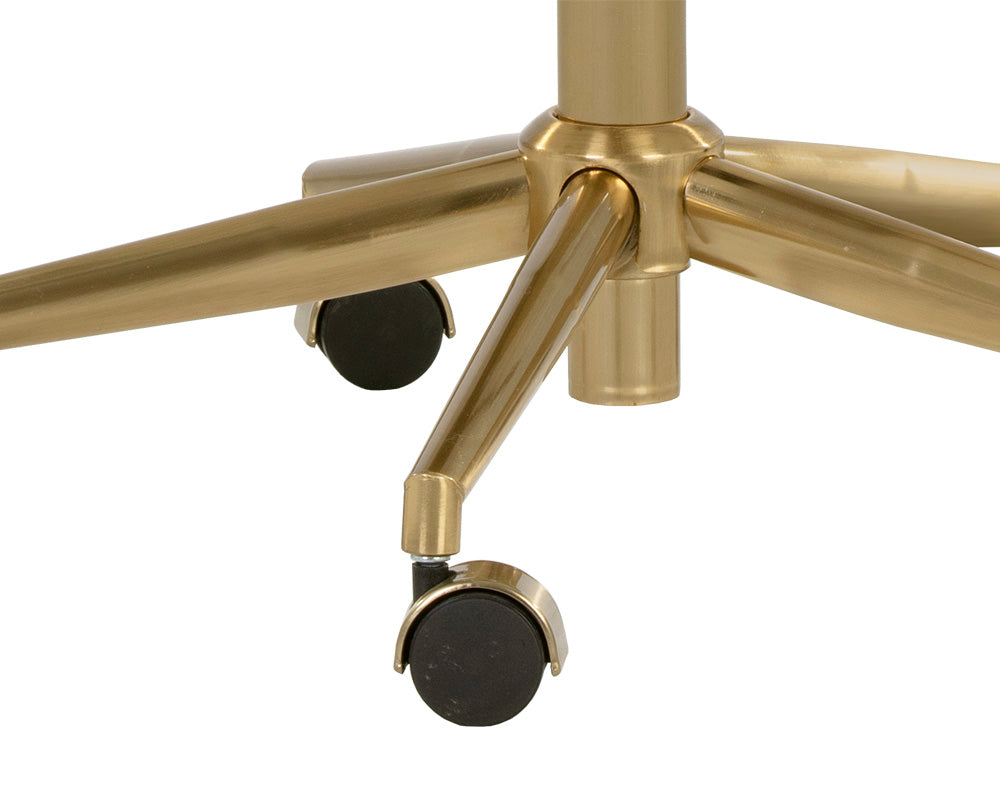 Create a stylish and functional workspace with this stunning modern office chair. Stocked in onyx, snow and tan faux leathers, and features generously padded seating for optimal comfort. Completed with castors for added mobility, and a gold stainless steel frame. Handle With Care: This design has been crafted with faux leather. Faux leather is manufactured to reflect the natural characteristics of leather; as such, colour variations, markings wrinkles, grooves, and light scratches are appreciated characteristics. No two pieces will be alike. Visit our Product Care page for more information on how to ensure the lasting beauty of this piece.