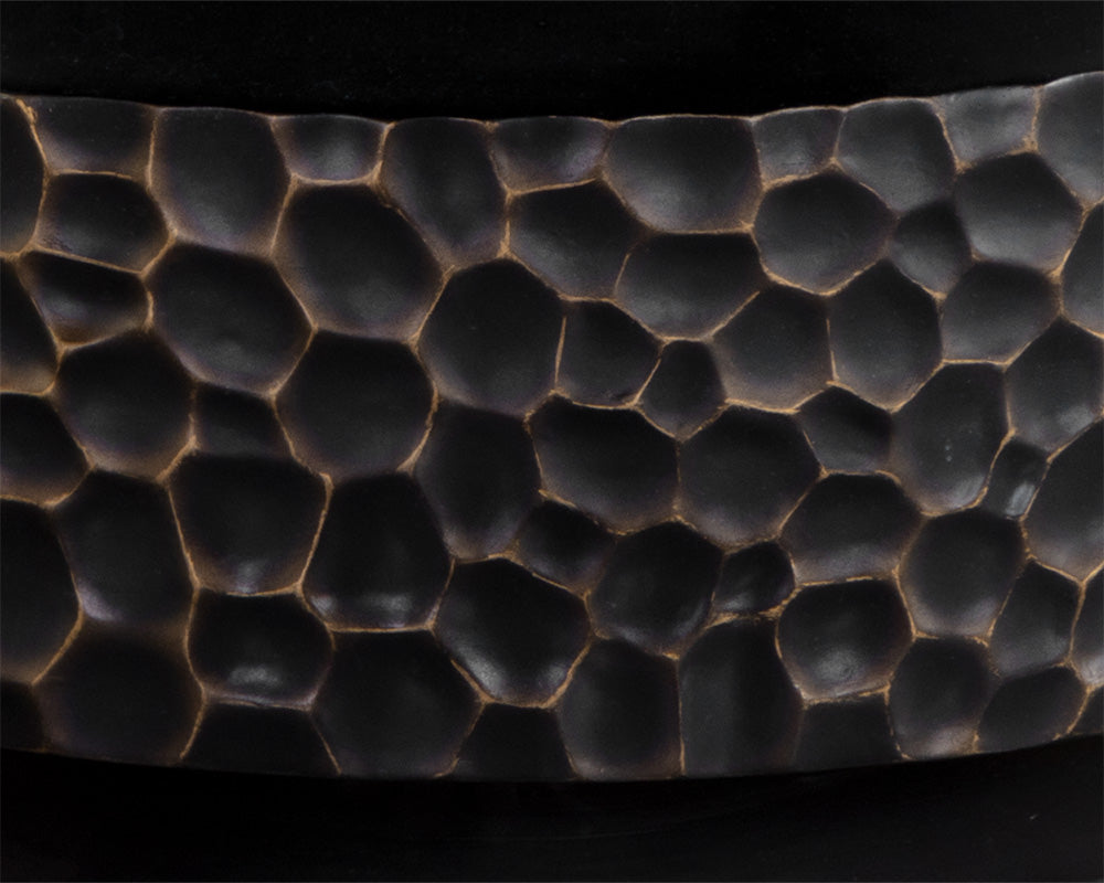 Accentuate any dining area with the stunning Mersin Dining Table. Constructed from black glass fibre-reinforced concrete, this piece has a remarkable hand-hammered design on the table top and base. Brass coloured accents emphasize the textured look. Suitable for indoor and covered outdoor spaces.