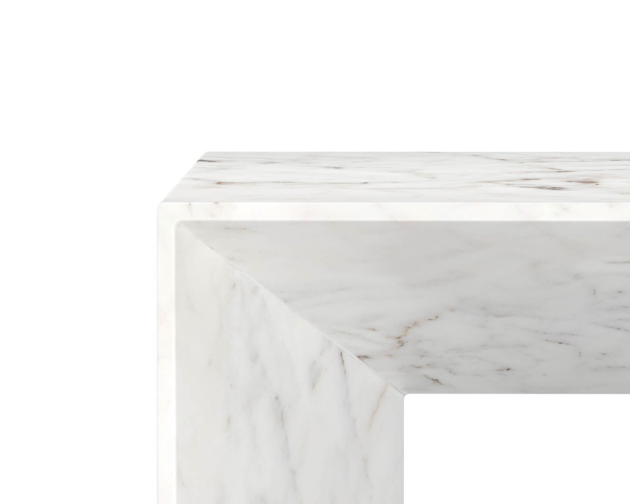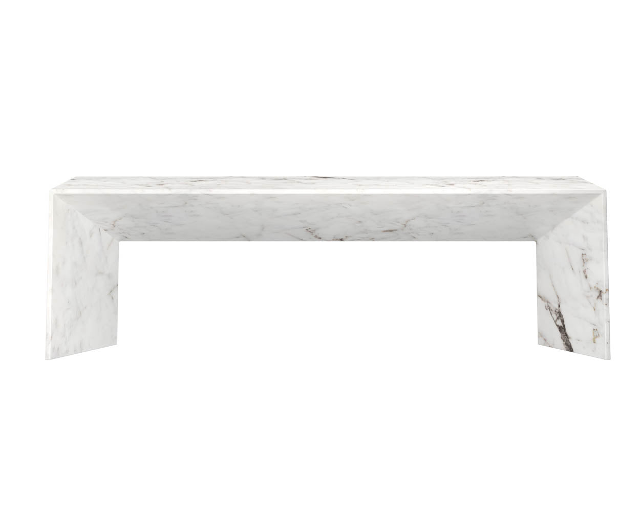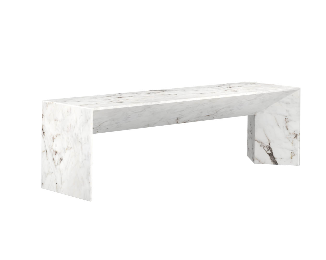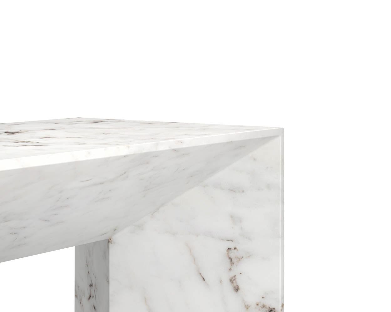Simple and refined, this concrete bench has sharp lines that create visual interest towards the inner frame. Crafted from white concrete with a marble look. Suitable for indoor and covered outdoor spaces. Also available in natural grey and solid white concrete.