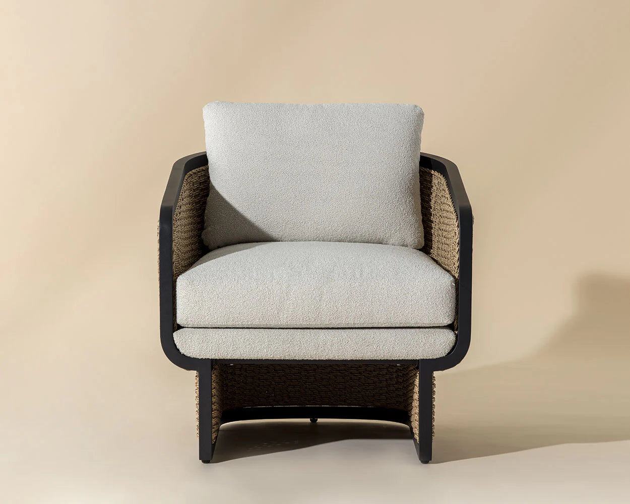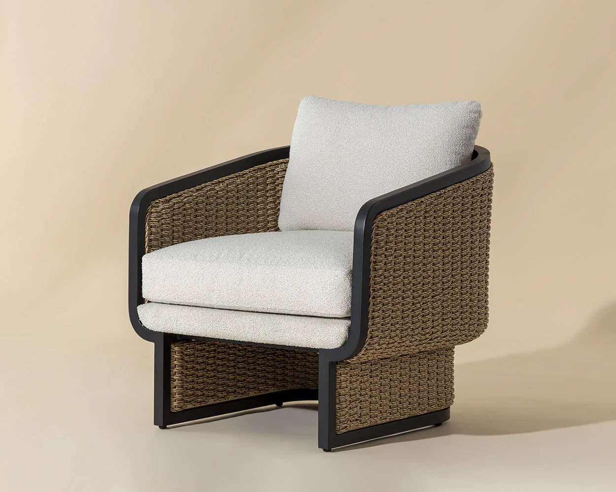 The Olbia Lounge Chair seamlessly blends comfort with durable materials and effortless style. Twisted all-weather wicker intricately weaves across a barrelback aluminum frame, adding textured charm. Foam-filled cushions in cozy boucle fabric enhance the feeling of relaxation.