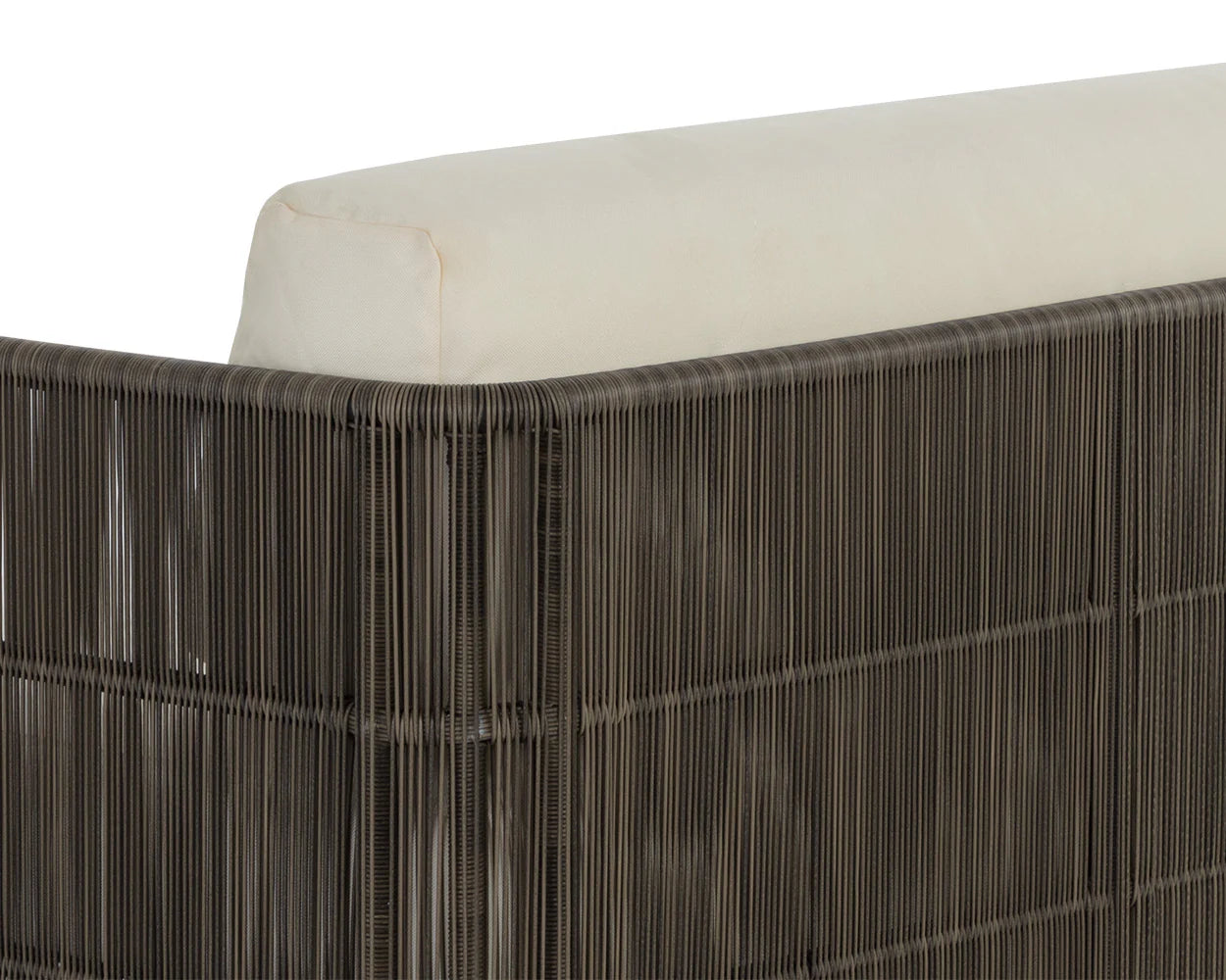 Relax and enjoy the weather with the comfortable Ravenna Sofa. Constructed with a drift brown teak wood base with a linear handwoven design made from ore grey polyrod on a black aluminum frame. Suitable for indoor and covered outdoor spaces.