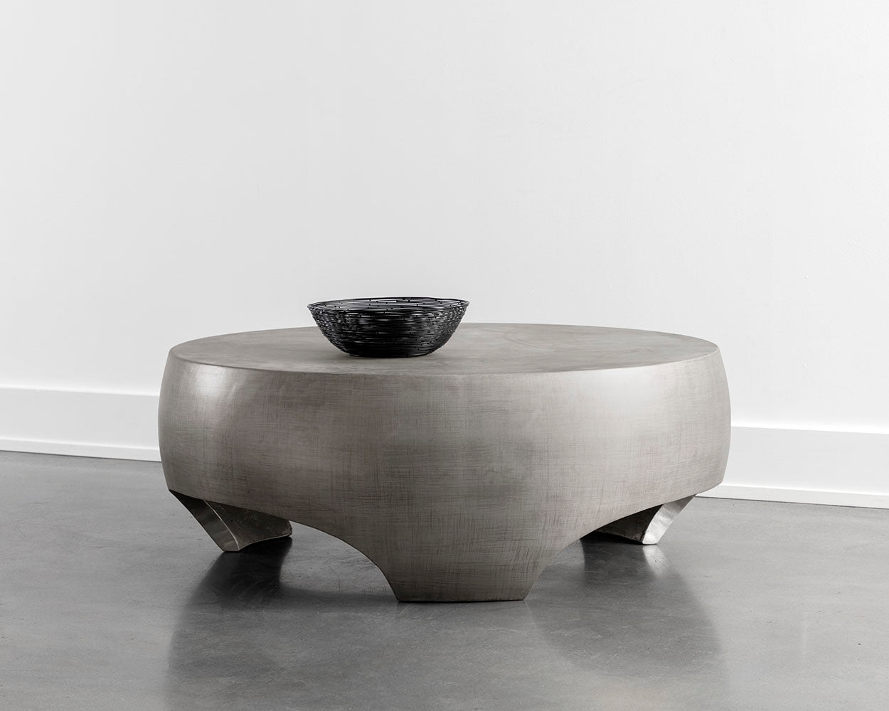 The Tarsus Coffee Table exudes industrial chic with its metal look and sculpted design. Crafted from glass fibre-reinforced concrete with an antique bronze finish. A striking piece from all angles, this table features open arches at the bottom. Suitable for indoor and covered outdoor spaces. Rubber felt protectors included. Also available in pewter finish.