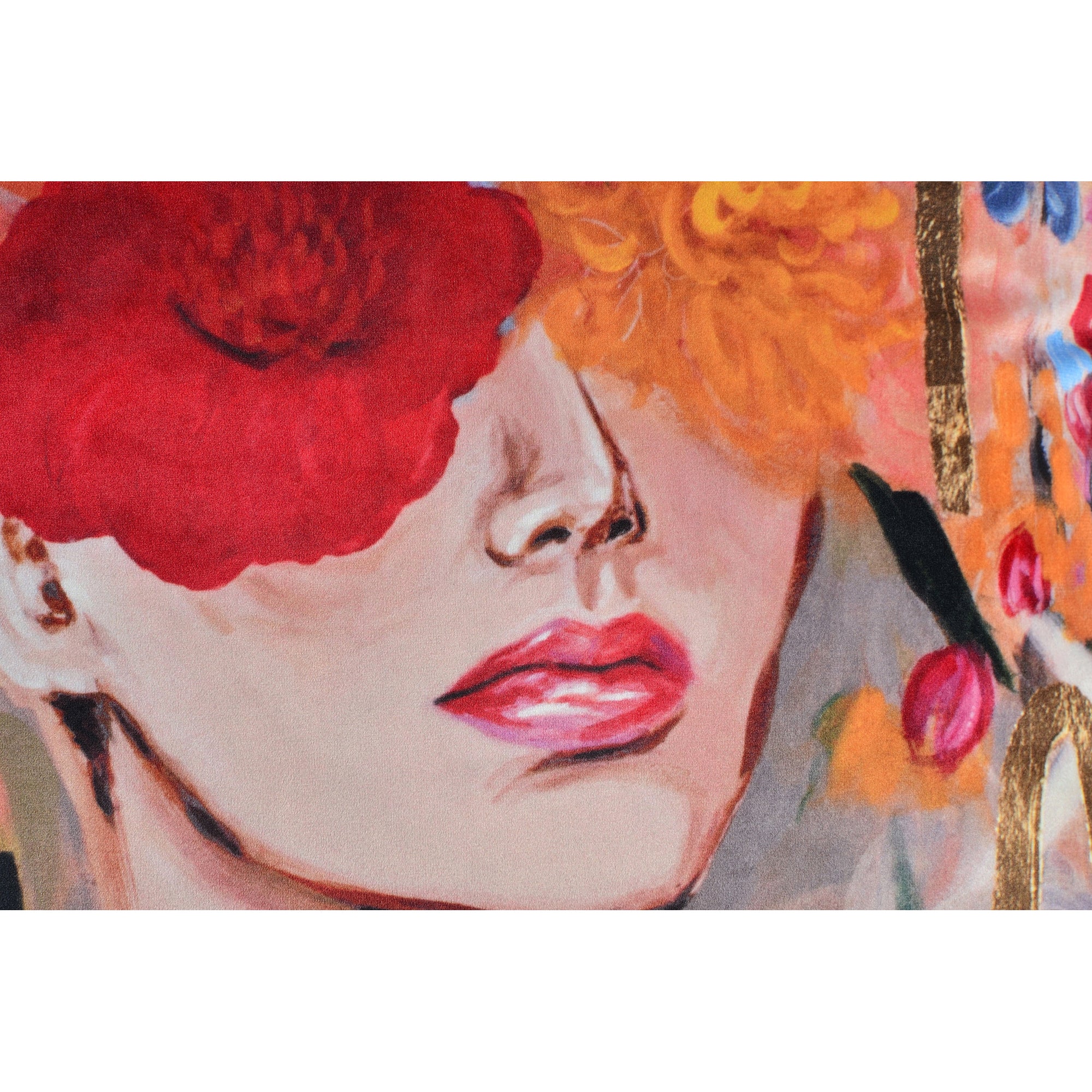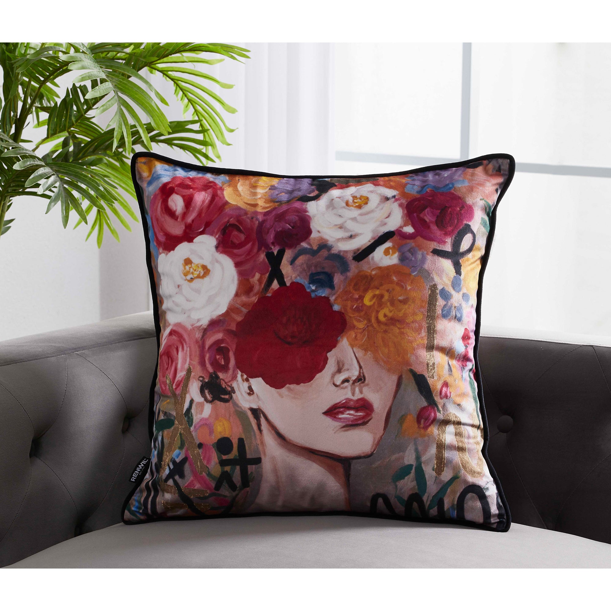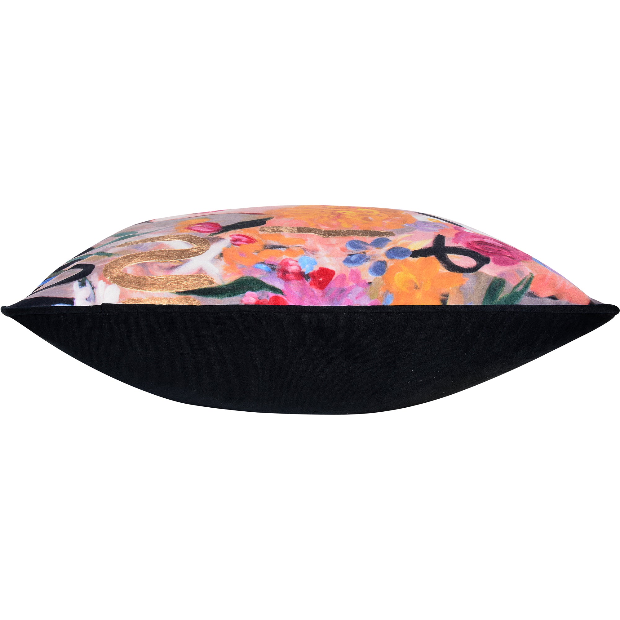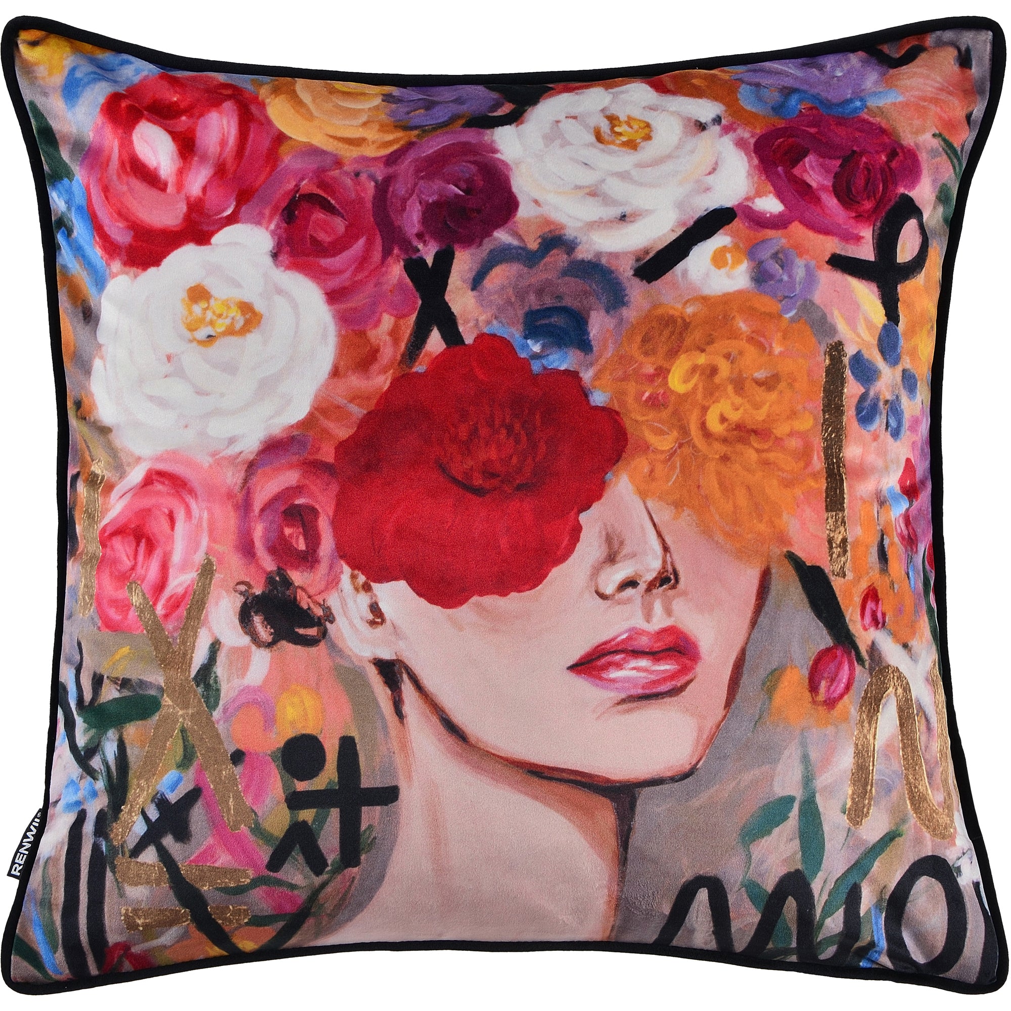 The bohemian interior takes on an air of eccentric elegance through this throw pillow design. Reminiscent of a painting, new aspects capture the eye at each glance. Made from soft velvet, the glamorous impression of its rich hues and gold embellishment are further enhanced.