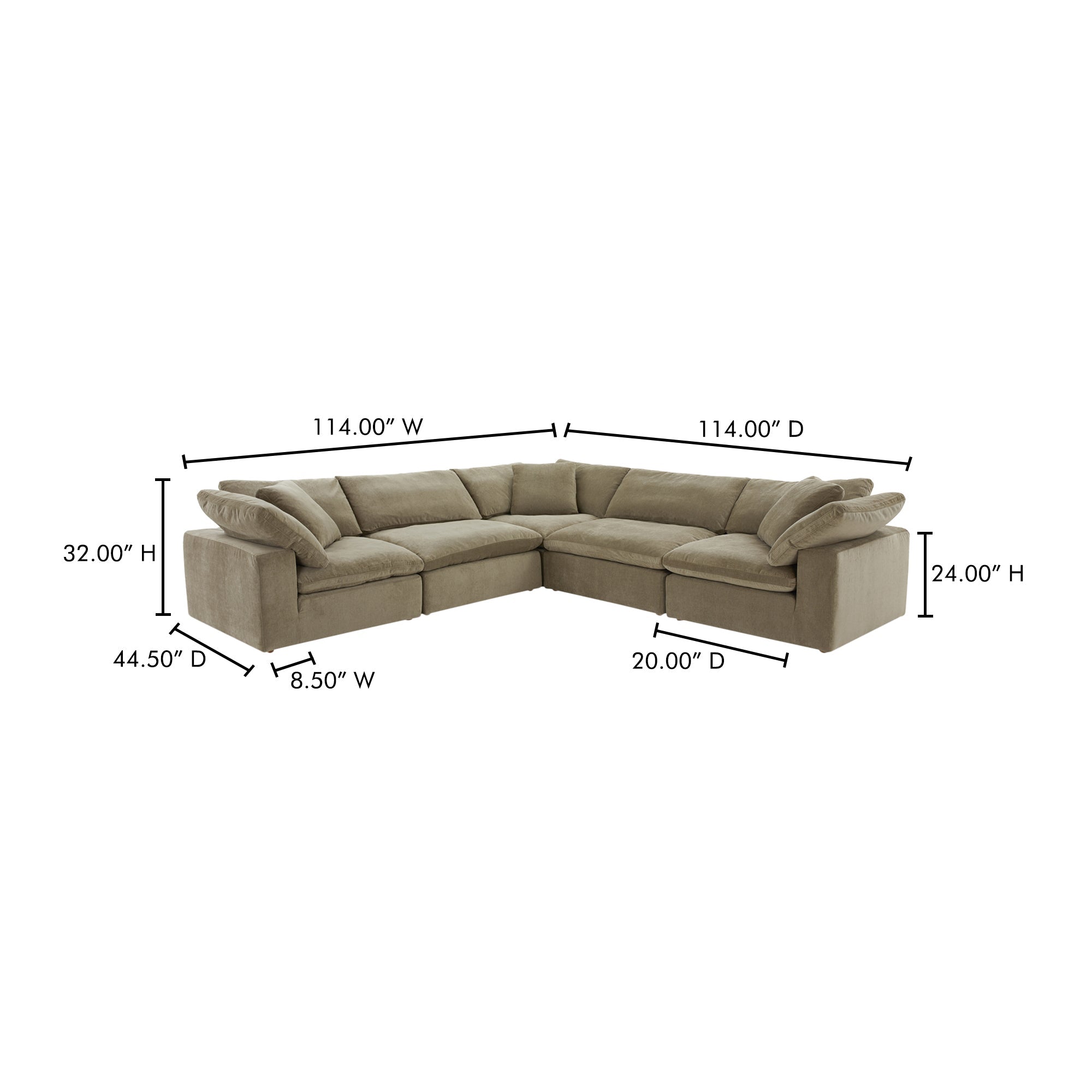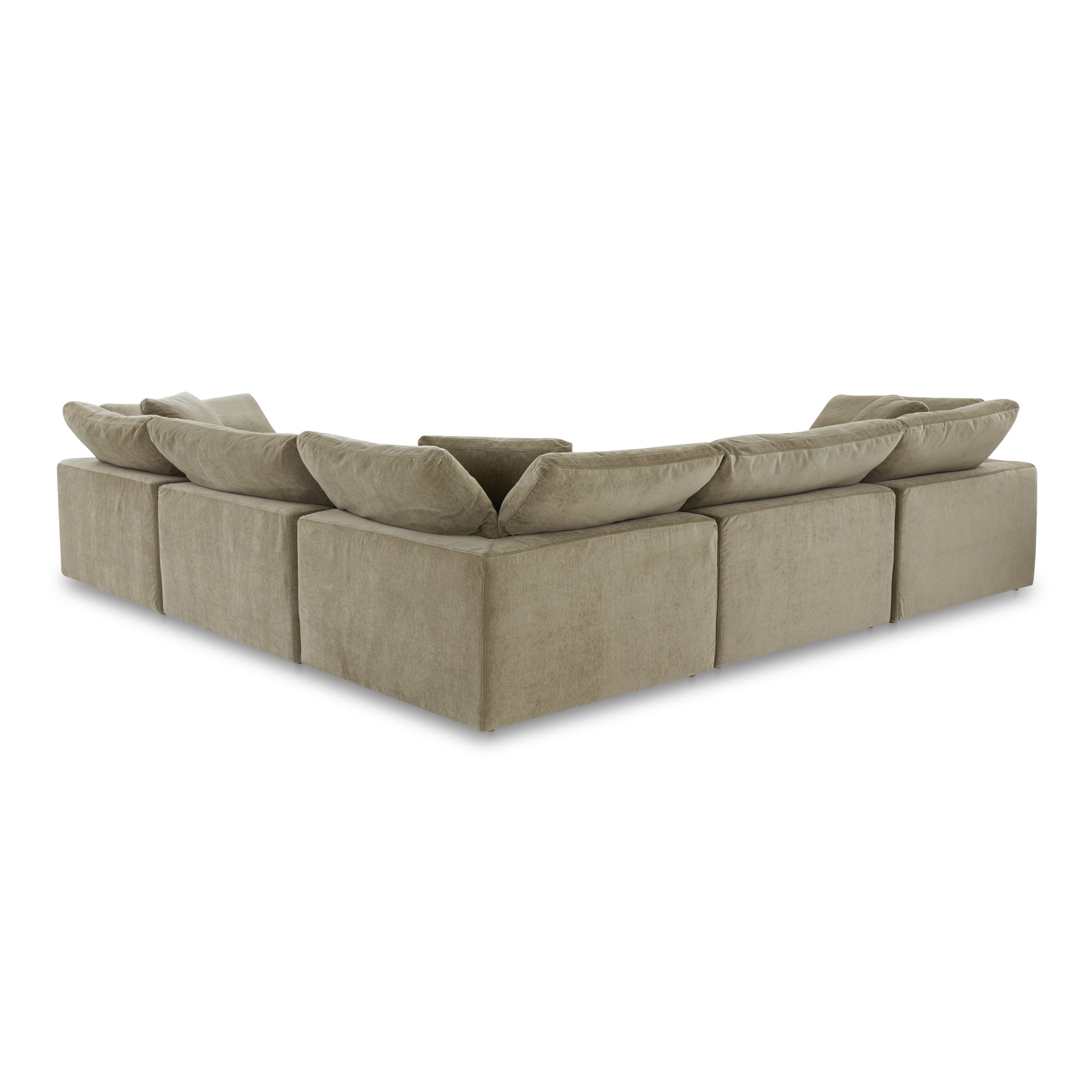 The Terra modular sectional is upholstered with our Performance Technology Fabric, which is moisture-repellent, stain resistant and offers barrier protection. Its cushions are filled generously with feather and fiber blend and channeled and double-wrapped to maximize durability, while the top eight inches of cushioning is filled with foam making it ultra comfy.