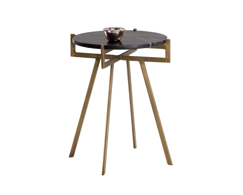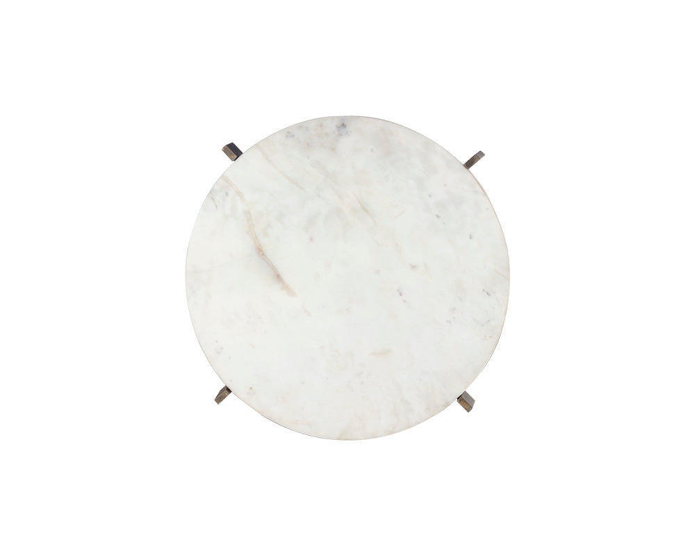This eye-catching side table exudes a sense of rustic elegance. Features an antique brass iron frame with a round white or black marble top. As marble is a natural material, unique veining, pitting, fissures, micro-cracks and colour variations are all characteristics that add to the uniqueness and beauty of each piece. Made in India. With refined craftsmanship, this design was brought to life by skilled local artisans. By nature, these materials develop unique imperfections such as fissures, markings and colour variations for a truly one-of-a-kind piece.