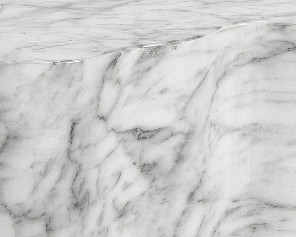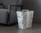 A contemporary and alluring end table. Sculpted from concrete and overlaid with a marble-look finish. Also available in white terrazzo. The shapely design is eye-catching and unique for placement in residential and contract settings. Stocked in small and large end table sizes. Can be grouped together or placed on its own. Also available in our coordinating Ava coffee table. Suitable for indoor and covered outdoor spaces.
