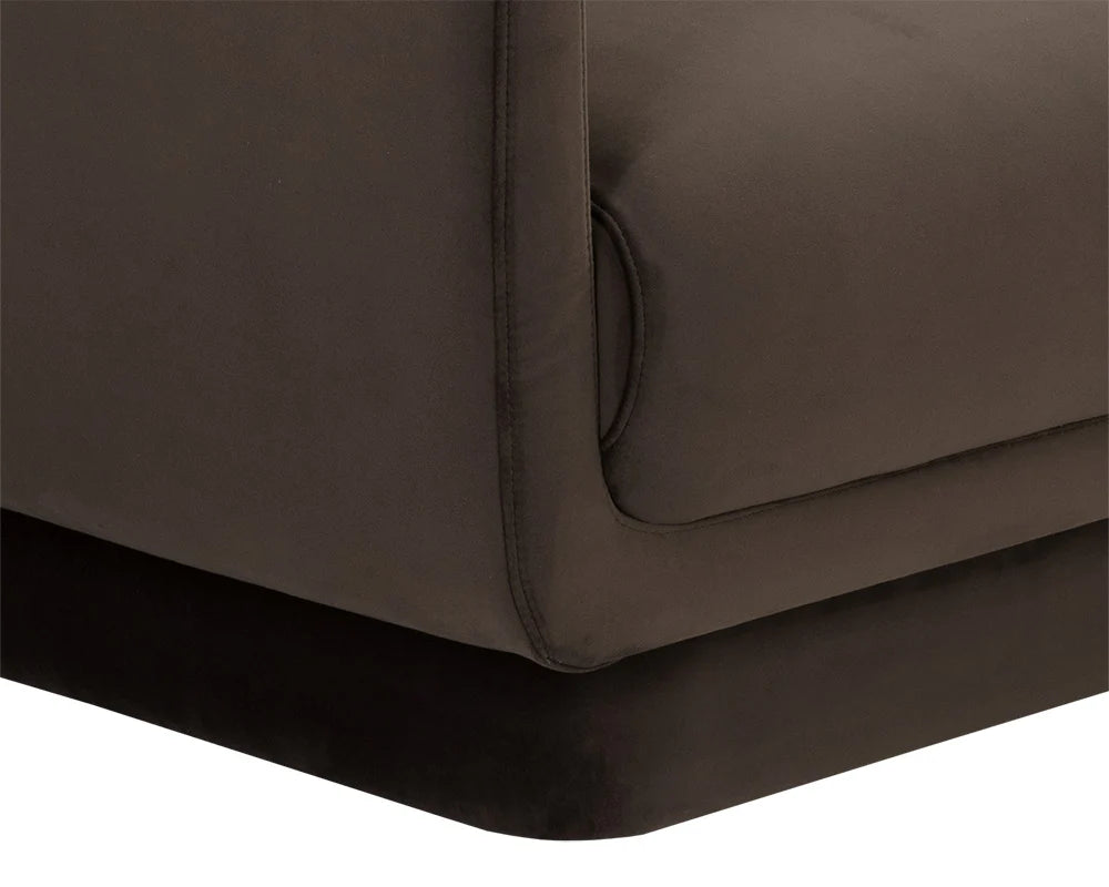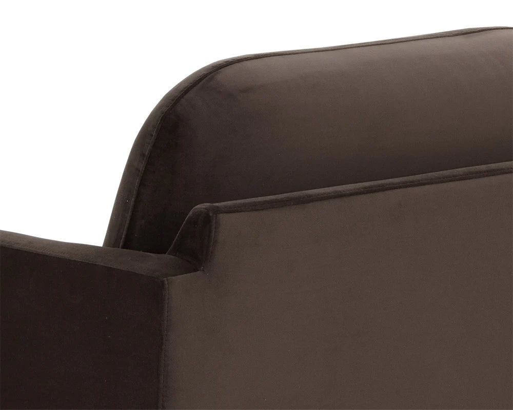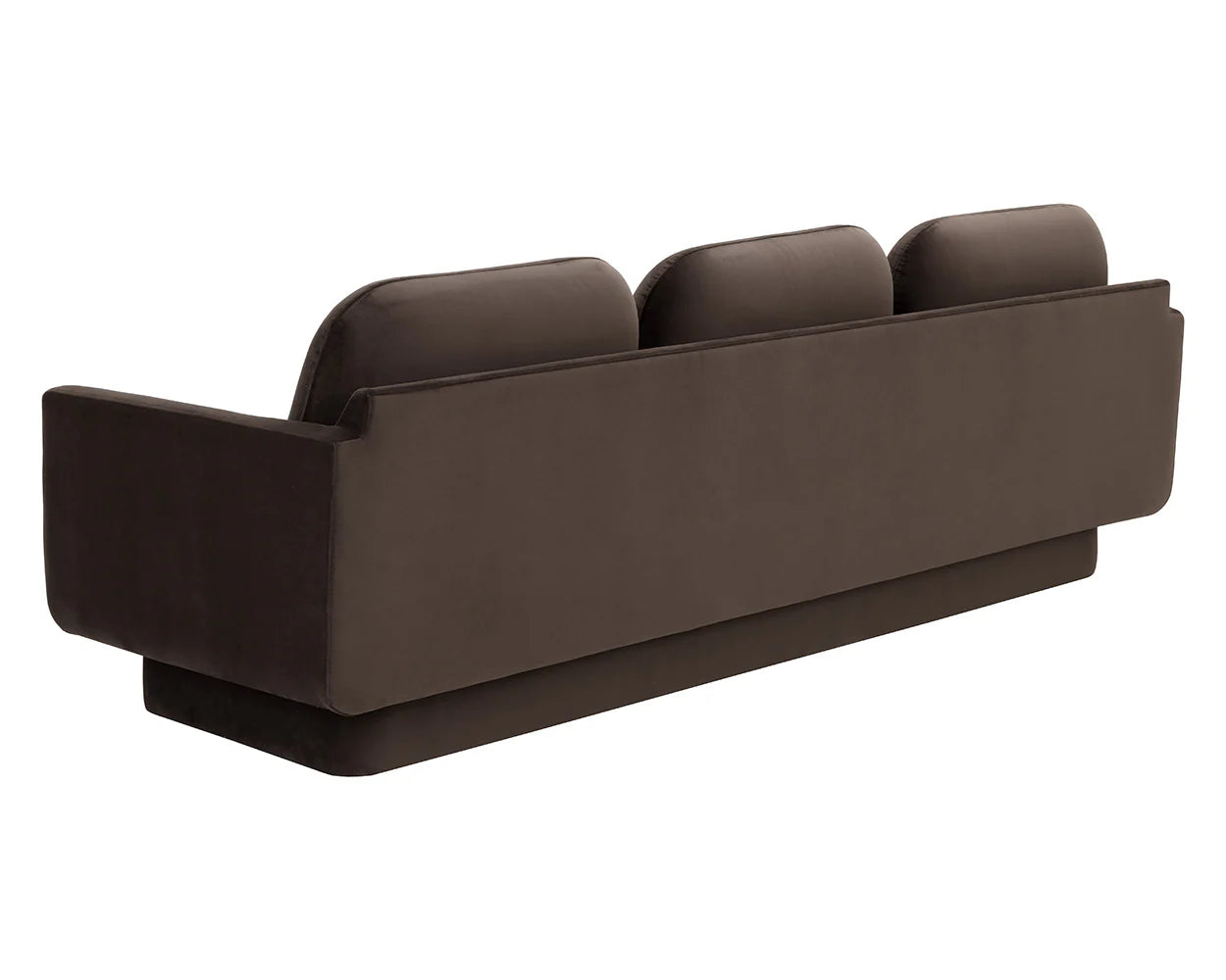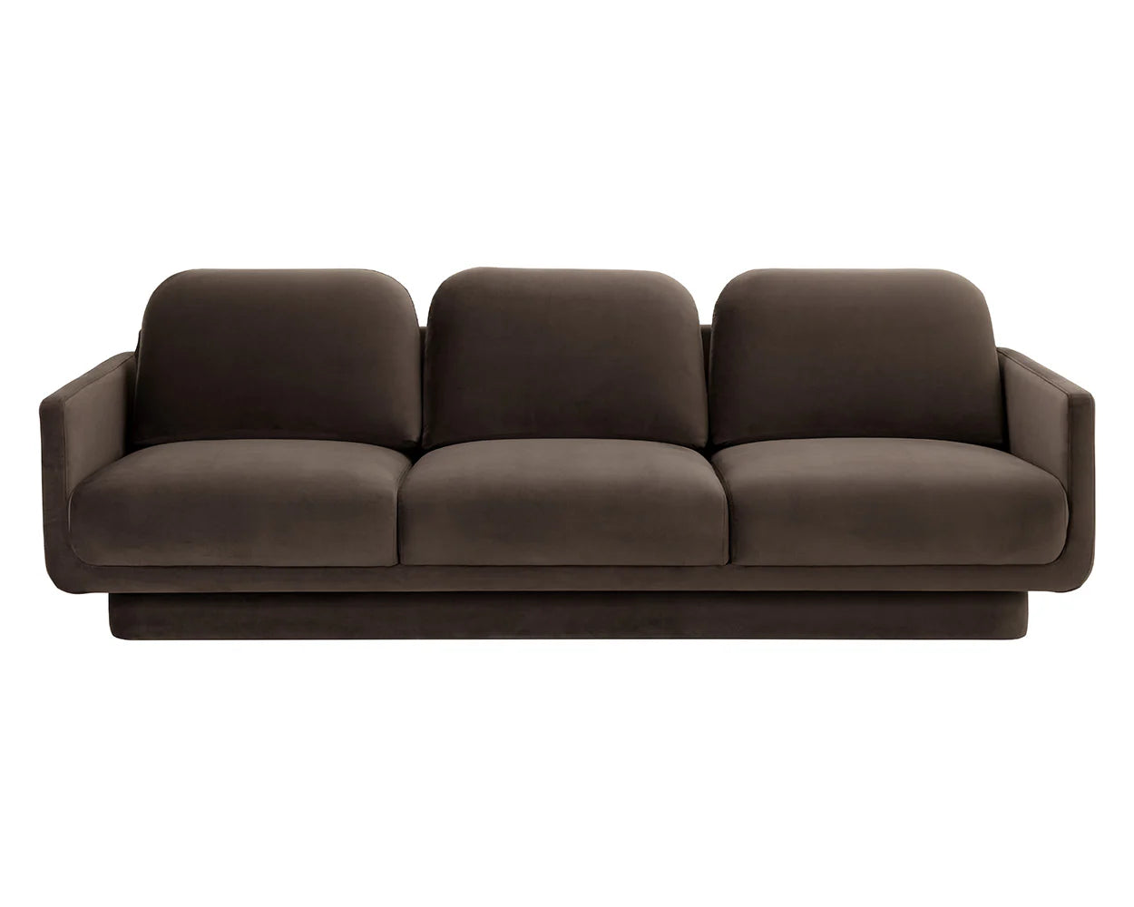The Everton Sofa exudes classic comfort. Featuring a low profile with loose back cushions and rounded edges for a retro feel. This sofa is fully upholstered in smooth meg dark brown or rust fabric for an inviting design that will captivate in any setting.