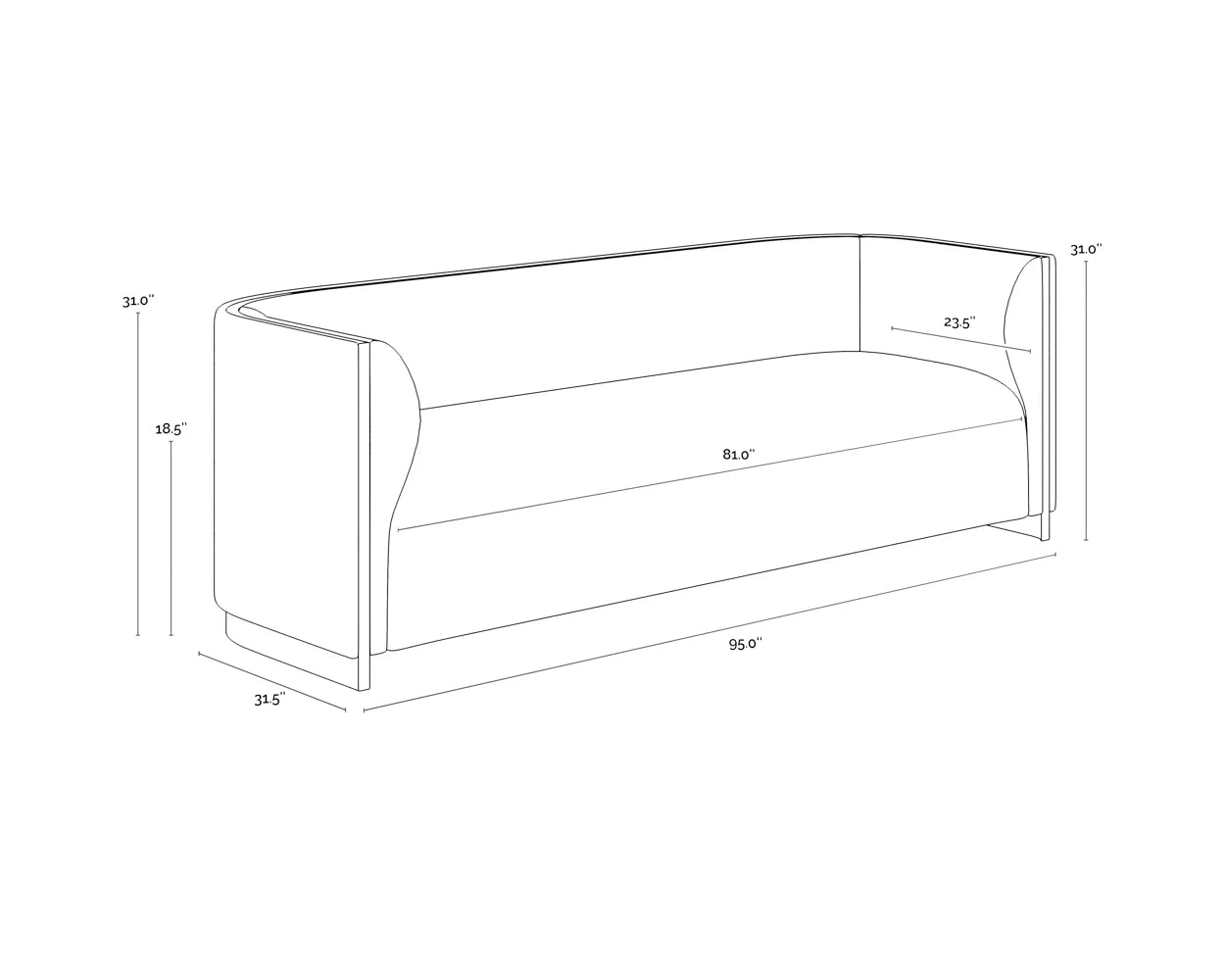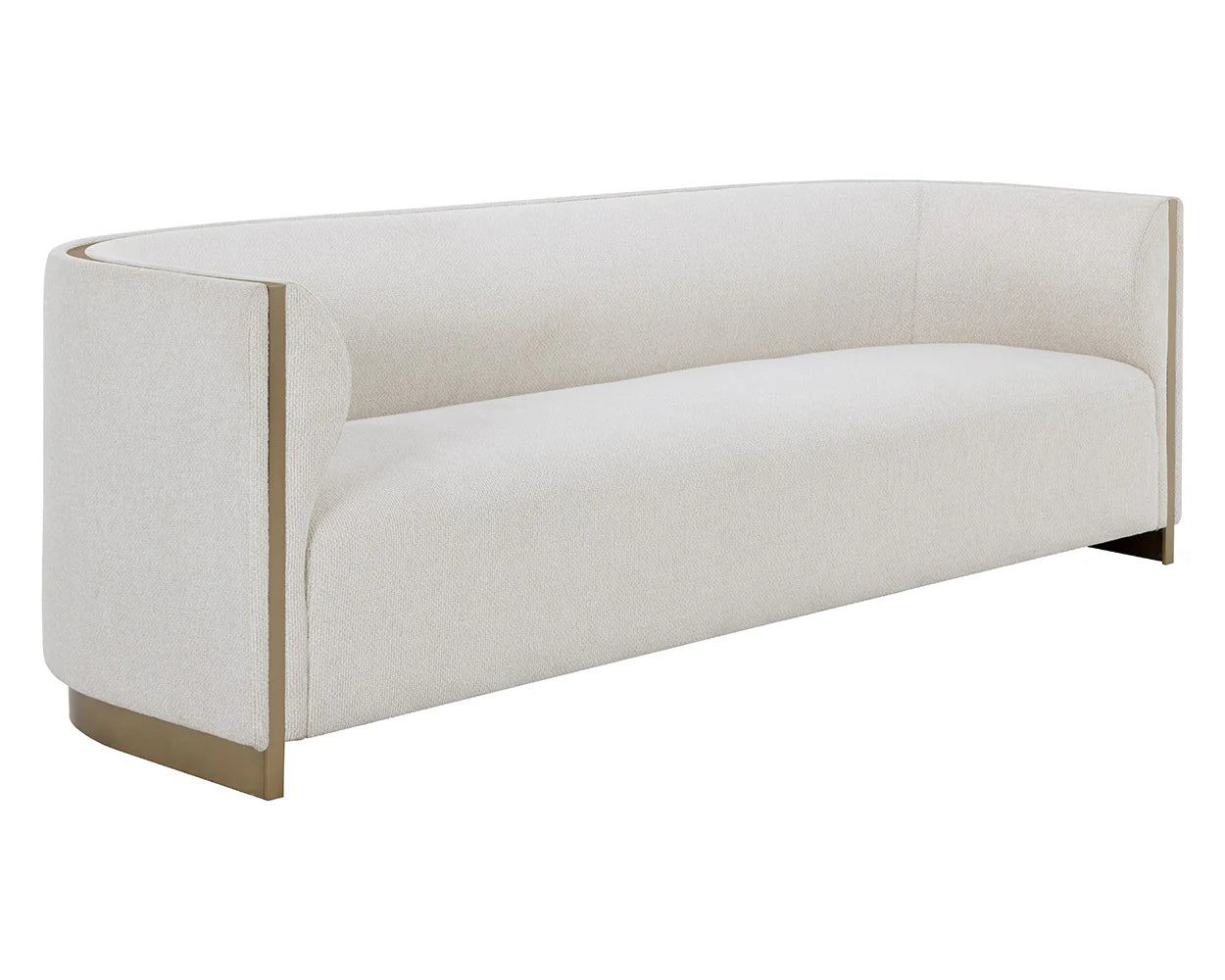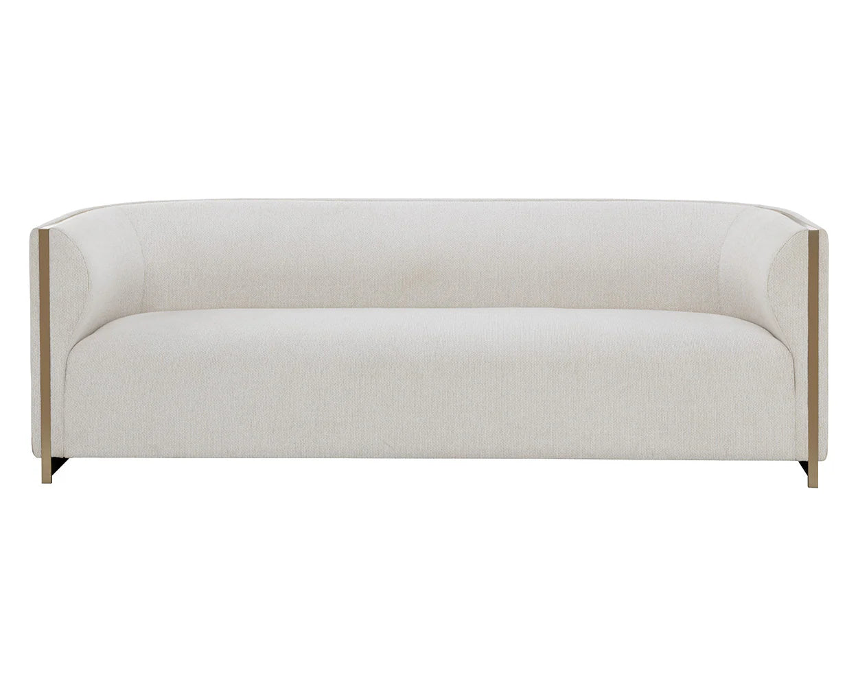 The Larron Sofa balances mixed materials to bring this contemporary design to life. Expertly upholstered in rhea light barley performance fabric for a soft touch. Gold stainless steel metal inlay and padded curves accentuate the chair's curved silhouette. Performance fabric is moisture repellent, durable and easy to clean.