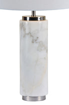 The stately design of this modern table lamp feels statuesque on tabletops throughout the home. A white marble lamp base adds the perfect element of antiquity without feeling old fashioned, thanks to a satin nickel-plated accents and off-white linen drum lampshade. Soft gray veining throughout the base makes this natural stone lamp is a graceful addition to grand interior spaces.