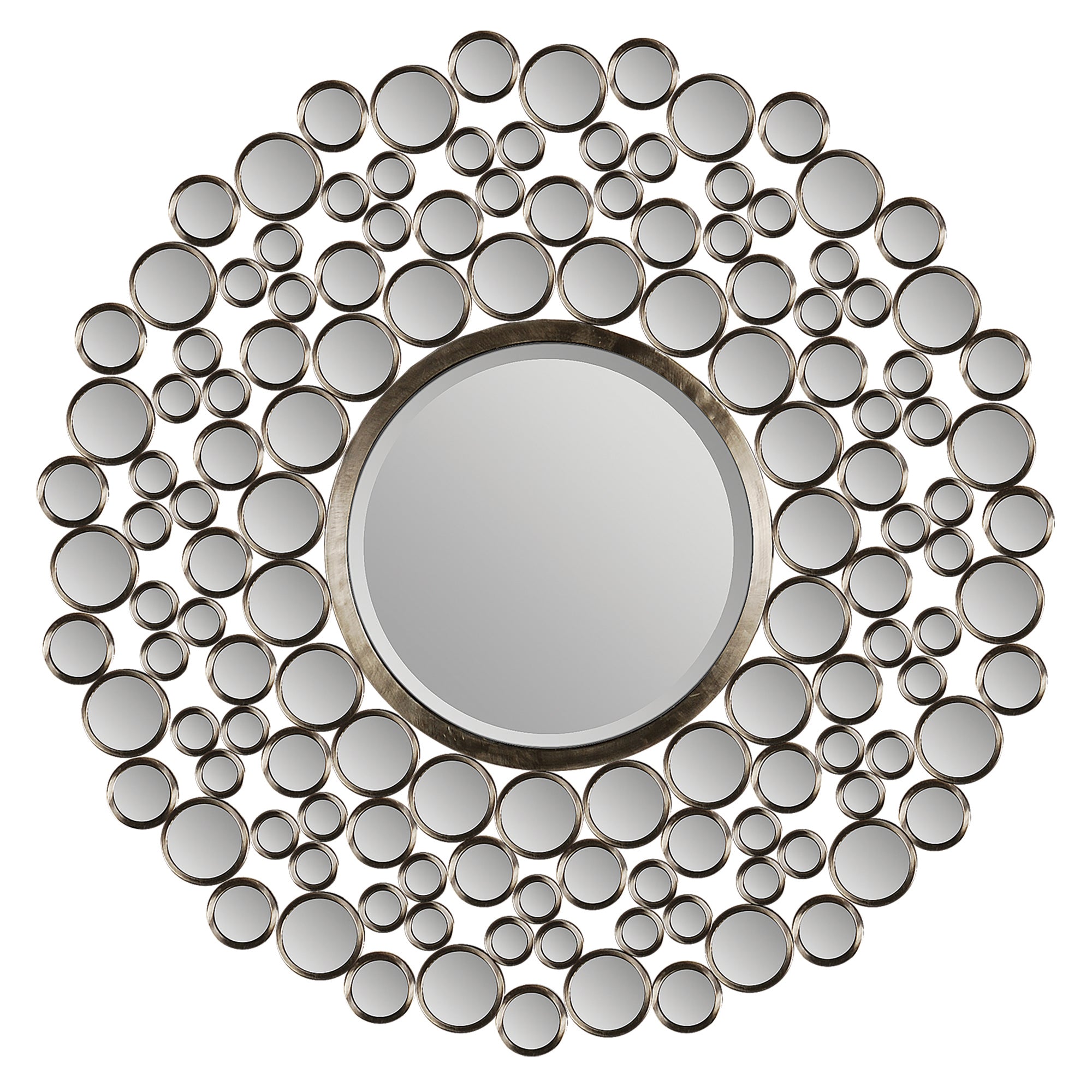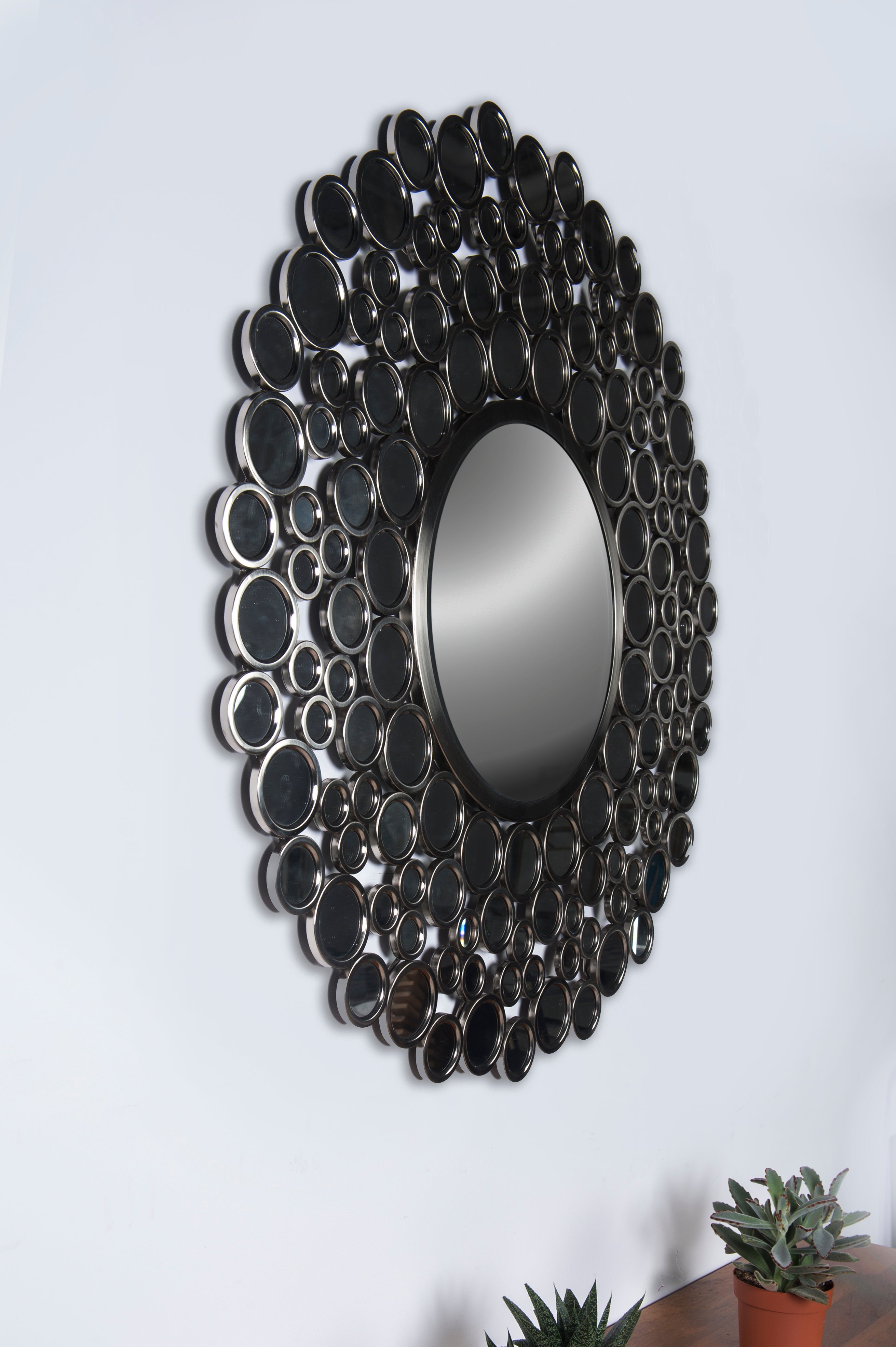 This awesome design features dozens of small mirrors and a large beveled round mirror in a satin-nickel plated metal frame. Fashionable and chic, this mirror is a great addition to your home décor!