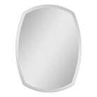 This contemporary mirror has a unique shape that would have a great designer effect in a bathroom. It has beveled and polished edges. The mirror is attached to a backing with strong hangers.